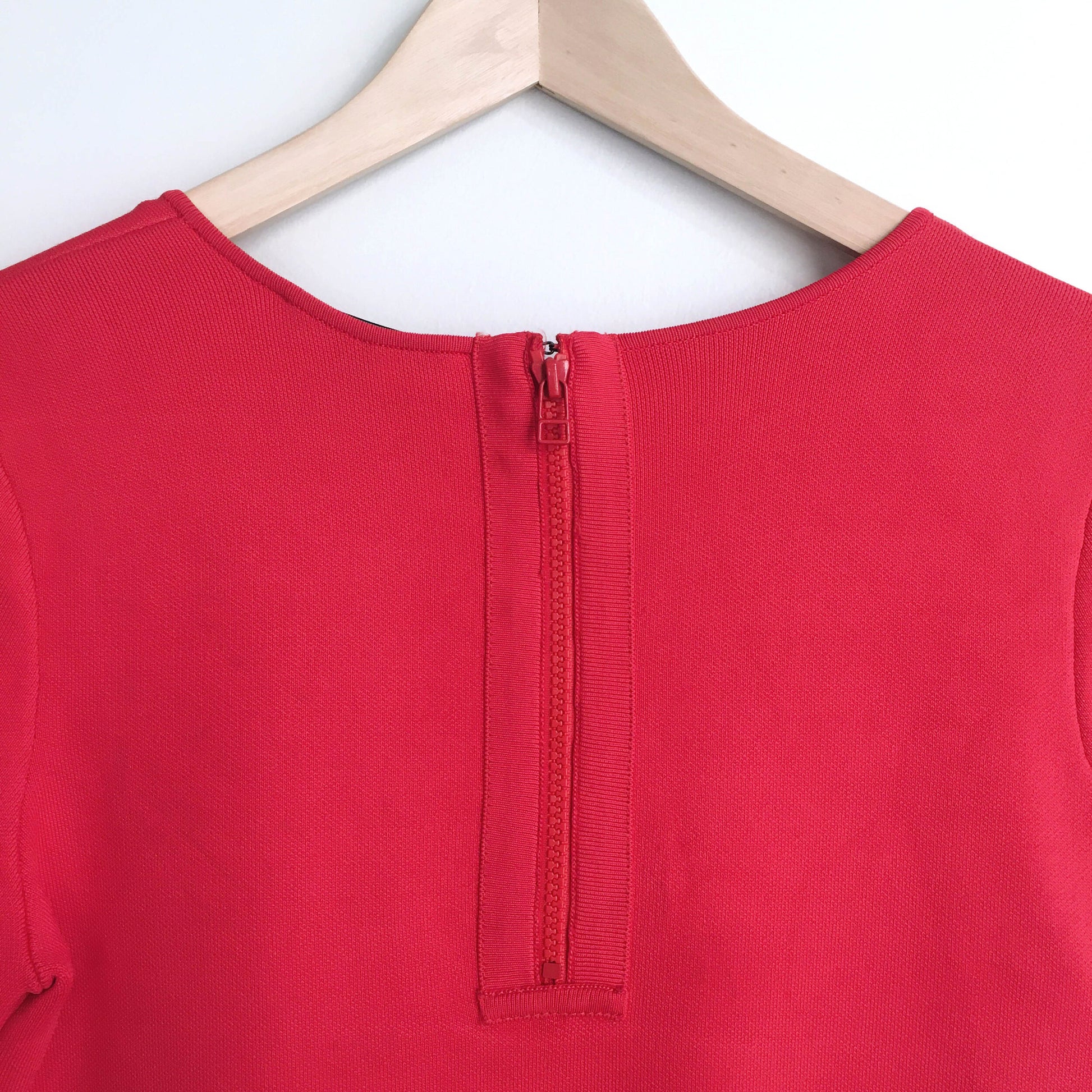 Item Description: This statement piece from Pink Tartan features big white lips on a red short sleeve knit with chunky back zipper. 85% viscose 13% nylon 2% elastane