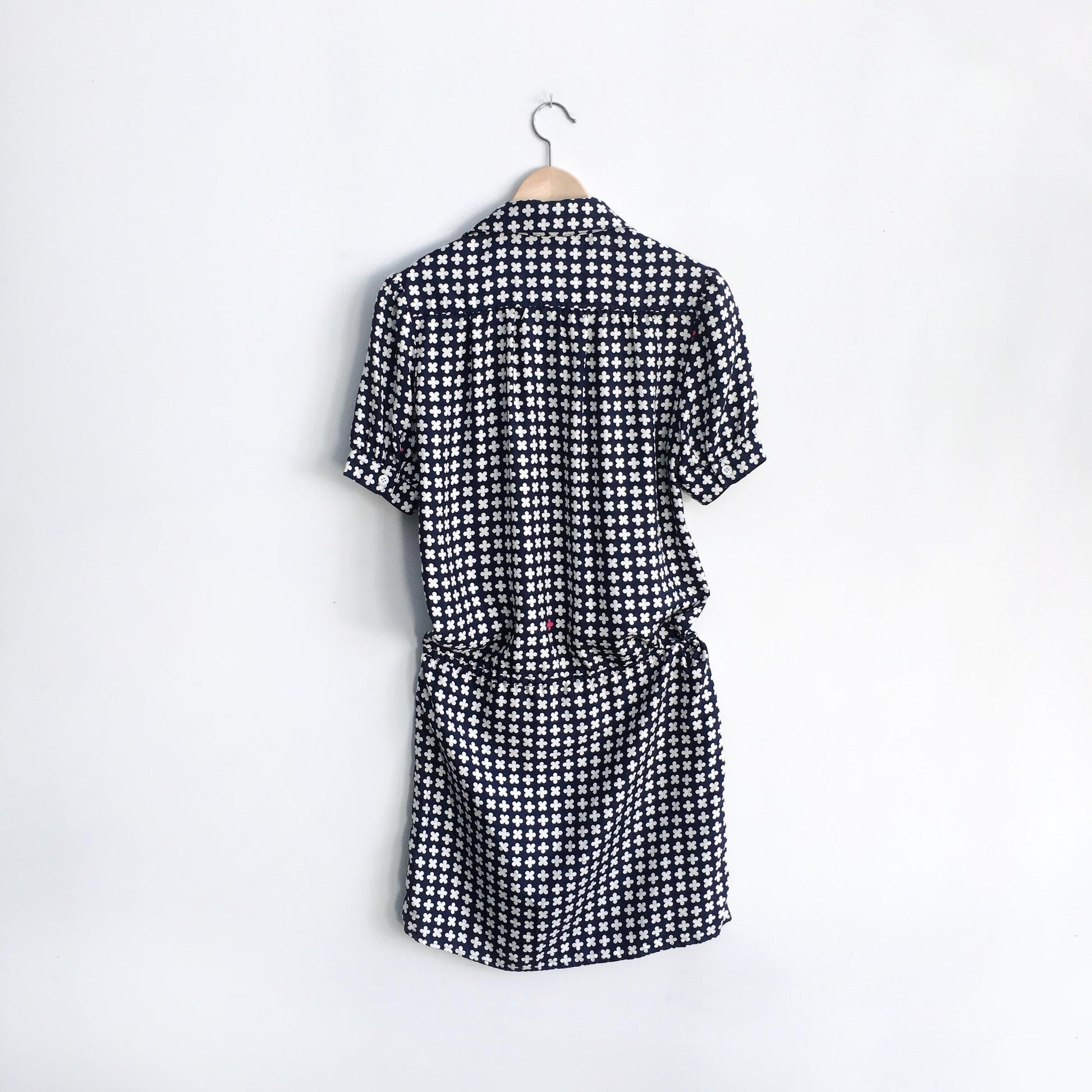 Item Description: This lovely Pink Tartan dress sets their iconic flower in a pattern with the occasional splash of pink. Button down front popover style, with button arm cuffs and a tie waist. 100% silk