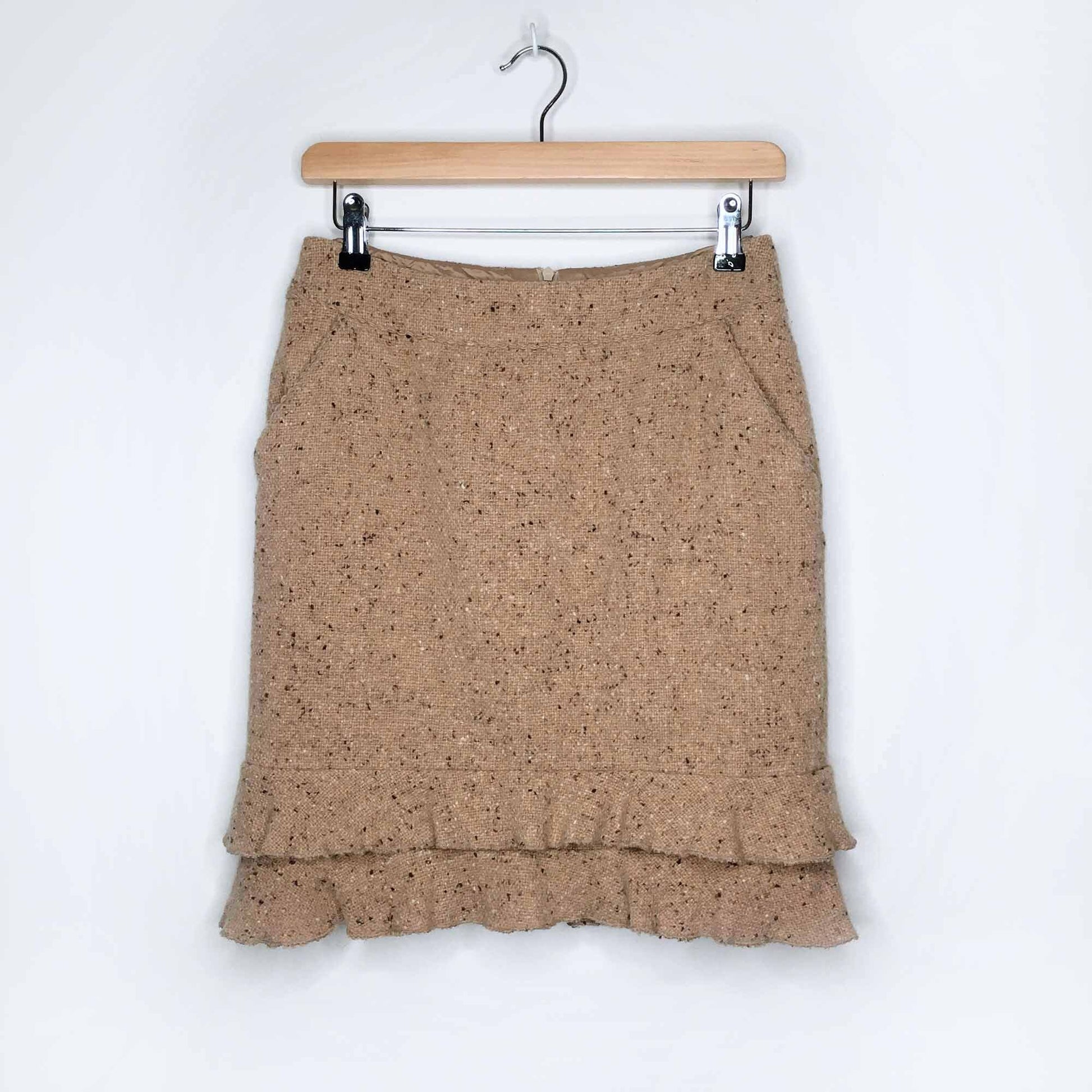 Item Description: This popcorn heather tan wool skirt from Pink Tartan features a double layer ruffle hem and side pockets, with back zipper closure. No content tag but likely a wool blend with acetate lining.