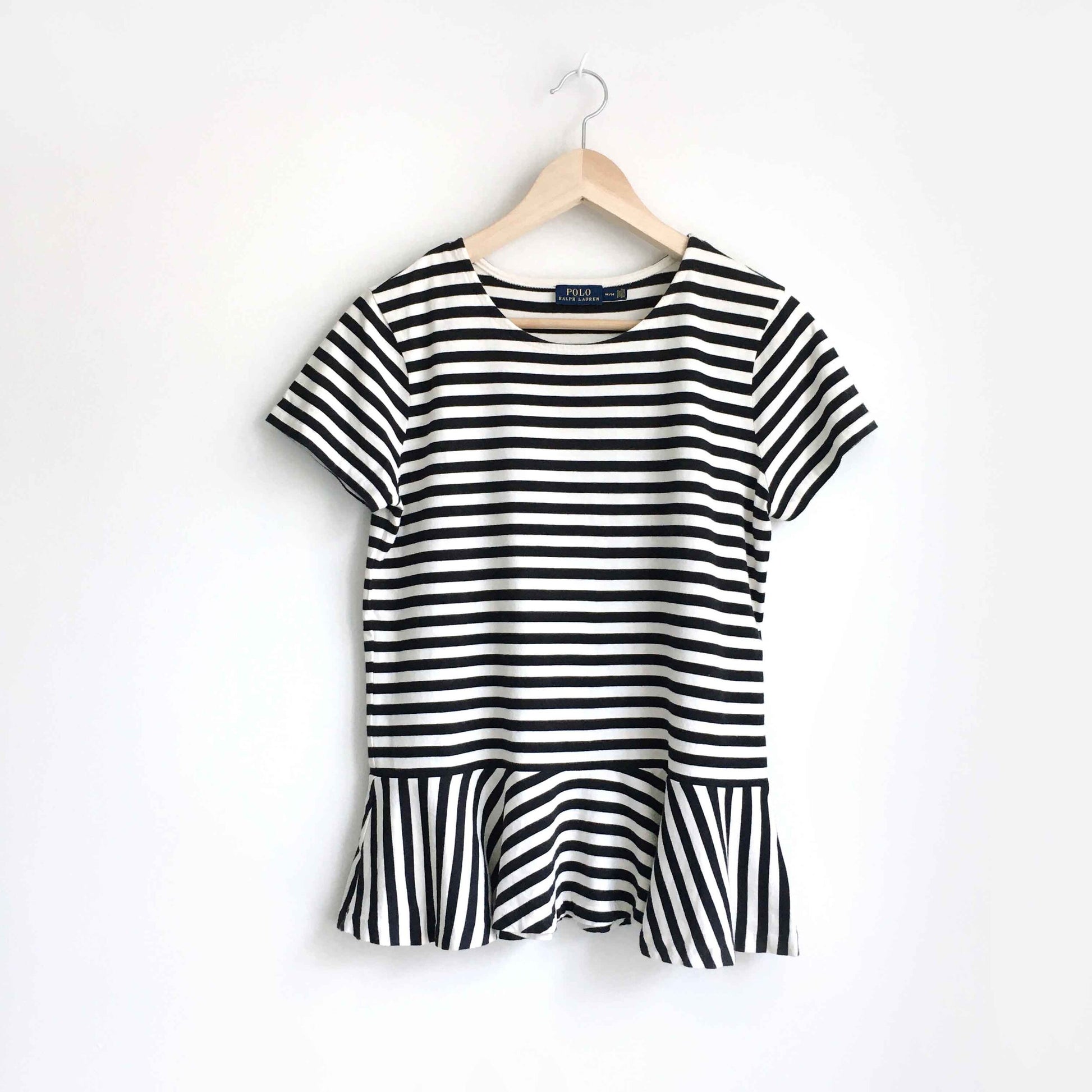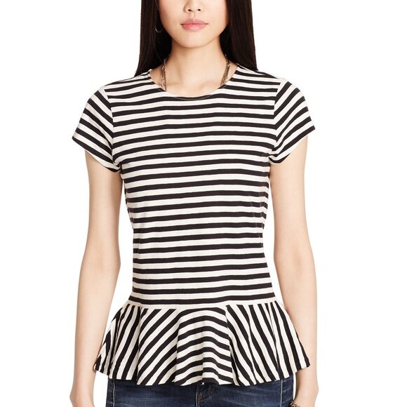 Item Description: Your basic soft cotton tee from Polo Ralph Lauren with an upgrade, this shirt features a nautical stripe pattern and peplum ruffle hem. 100% cotton