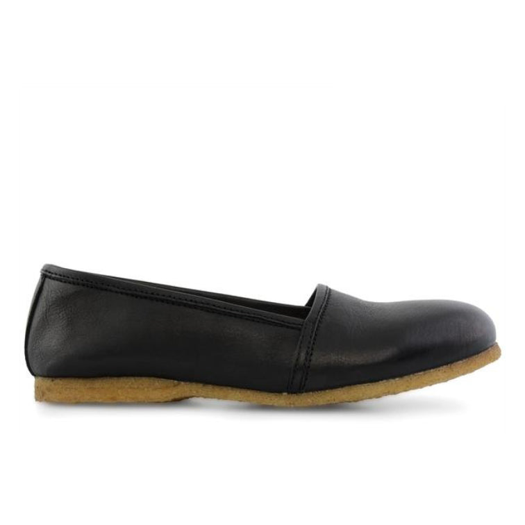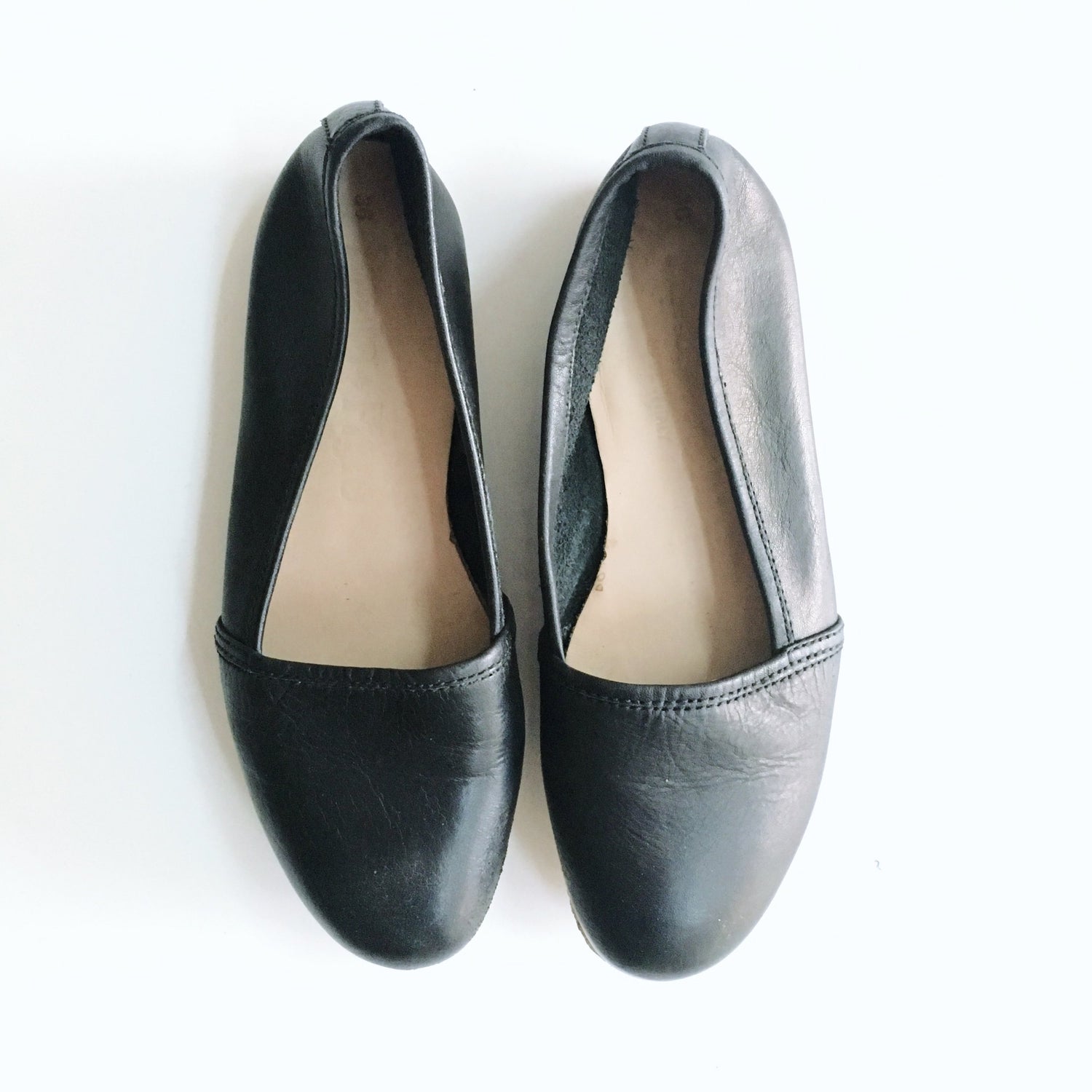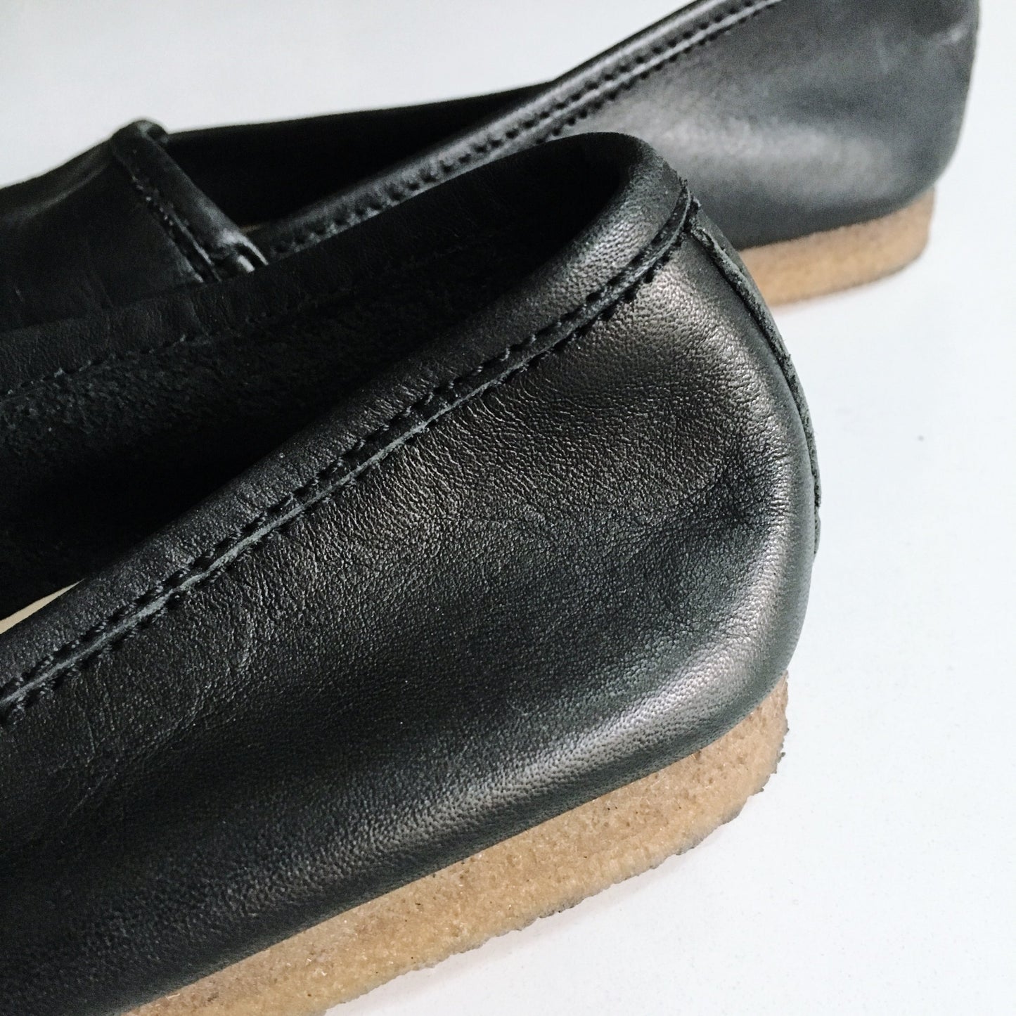 Item Description: These are your new go-to slip on ballet flats. Adorned in supple black leather and set in a rubber crepe sole, these shoes go the extra mile in comfort and durability.