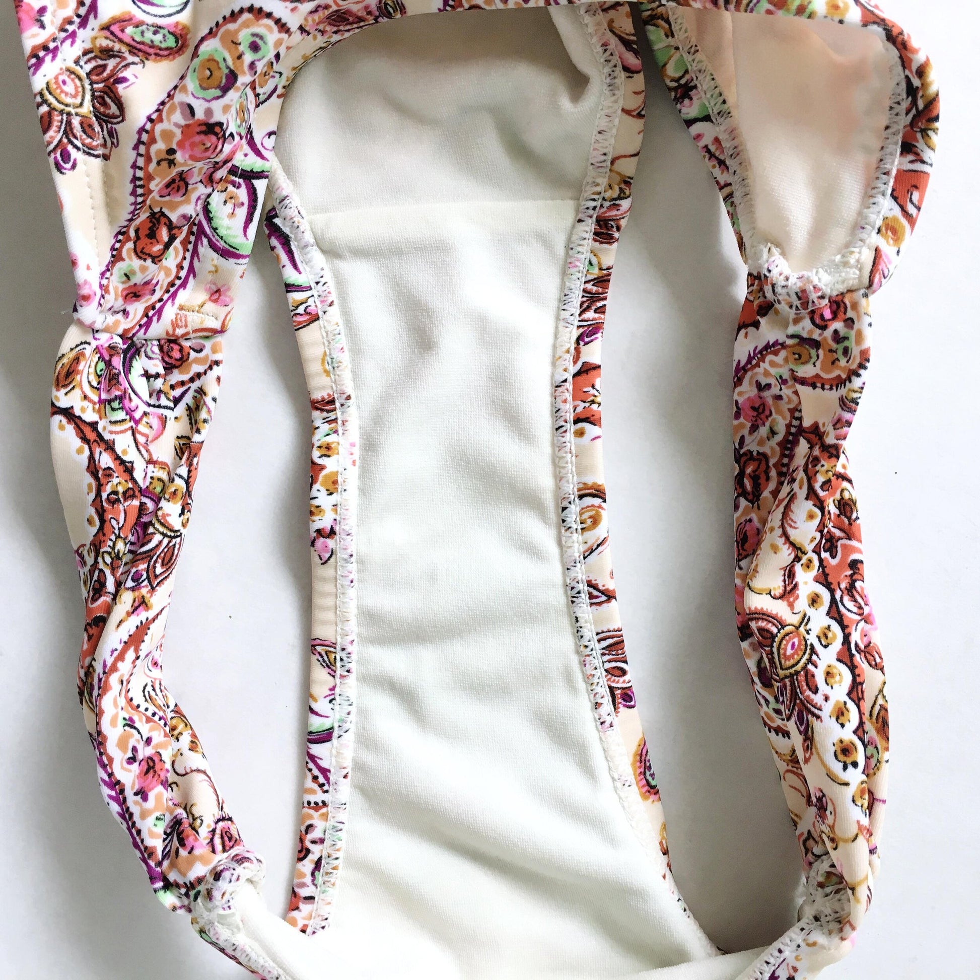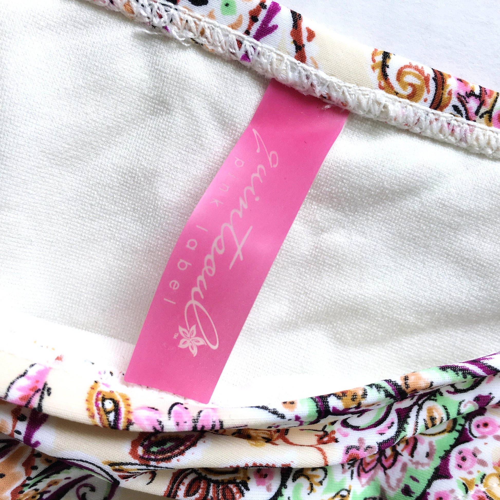 Item Description: Summer colours adorn this pretty little bikini bottom from Quintsoul pink label with cinched sides and skimpy backside. 82% nylon 18% spandex