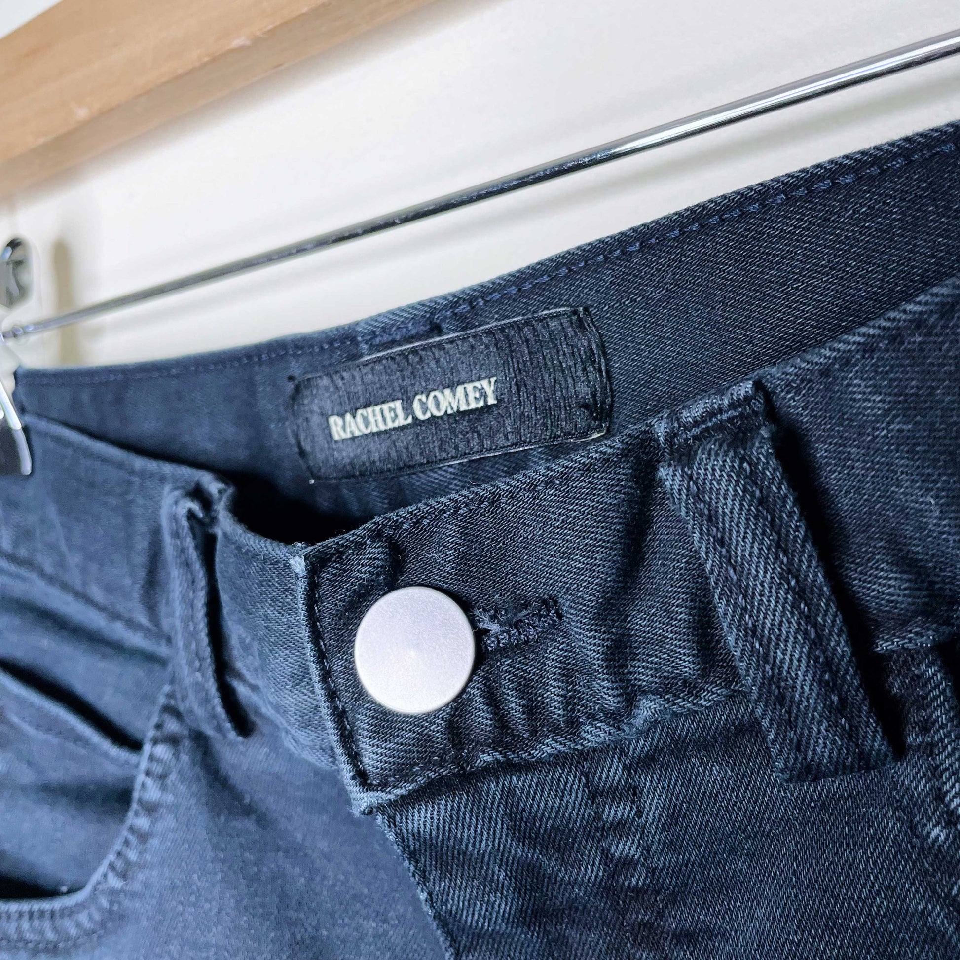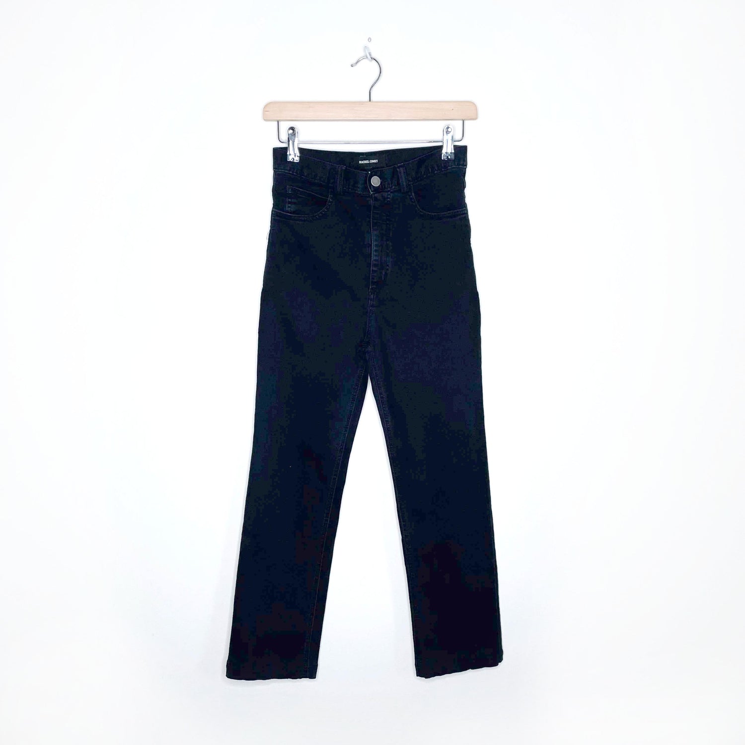 Item Description: Rachel Comey Bismark high-rise straight leg pant in black-wash denim. Classic five pocket design with back yoke. Concealed zip up fly with button closure. Slightly cropped. 89% cotton 8% polyester 3% spandex