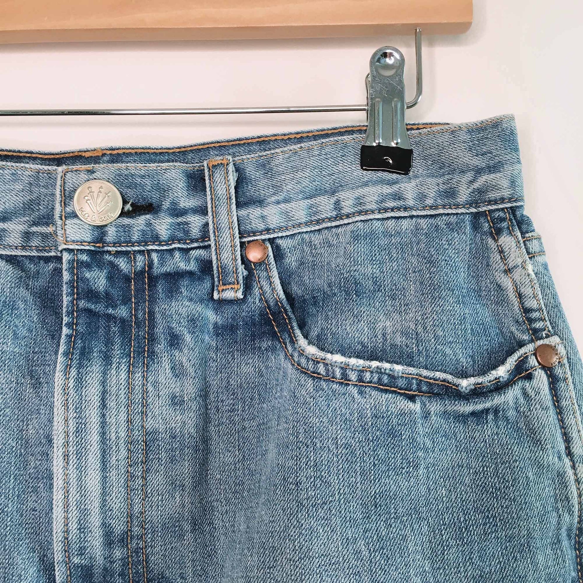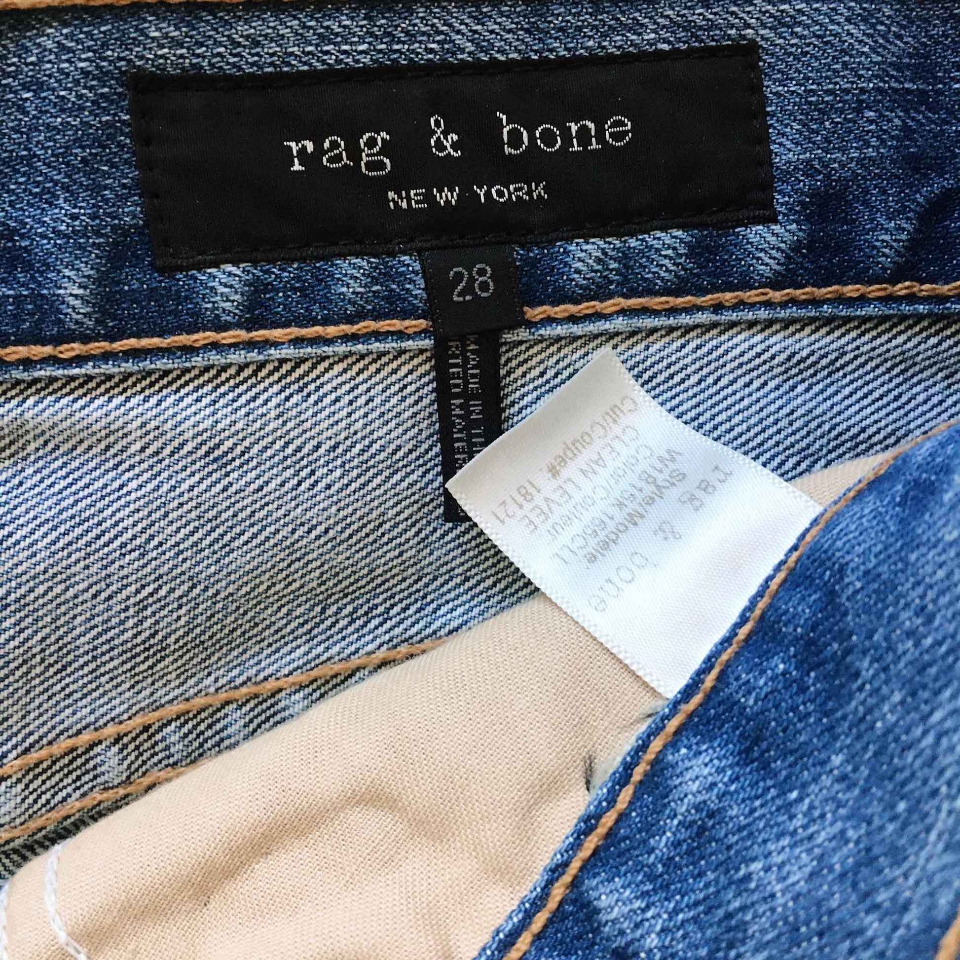Item Description: A classic high rise denim skirt from Rag & Bone with vintage distressing and raw, cut off hem. 100% cotton Colour: Levee