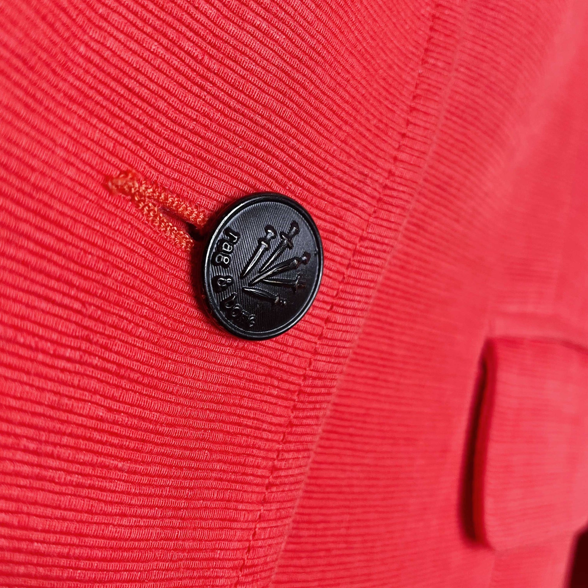 Item Description: This career blazer from Rag & Bone features a subtly textured twill-linen fabric with silk blend liner and double button closure. Classic matte black buttons are prominently featured on the front and cuffs.