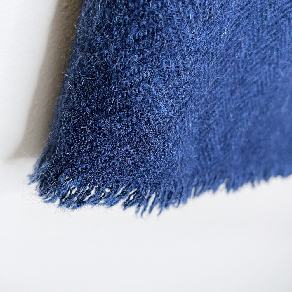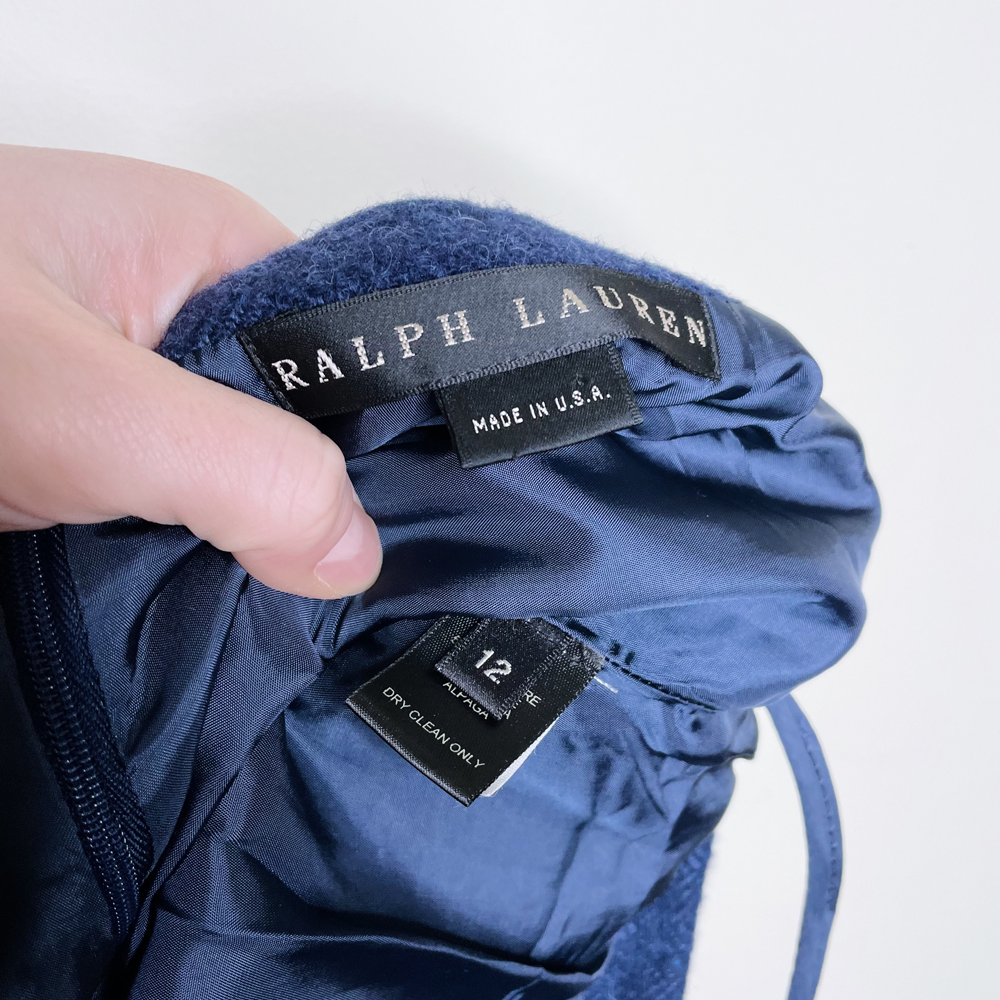 Item Description: This preppy high rise, knee-length skirt from Ralph Lauren's premium black label features a soft blend of cashmere and alpaca, in a navy blue herringbone weave with raw, fringe hem. 50% cashmere 50% alpaca
