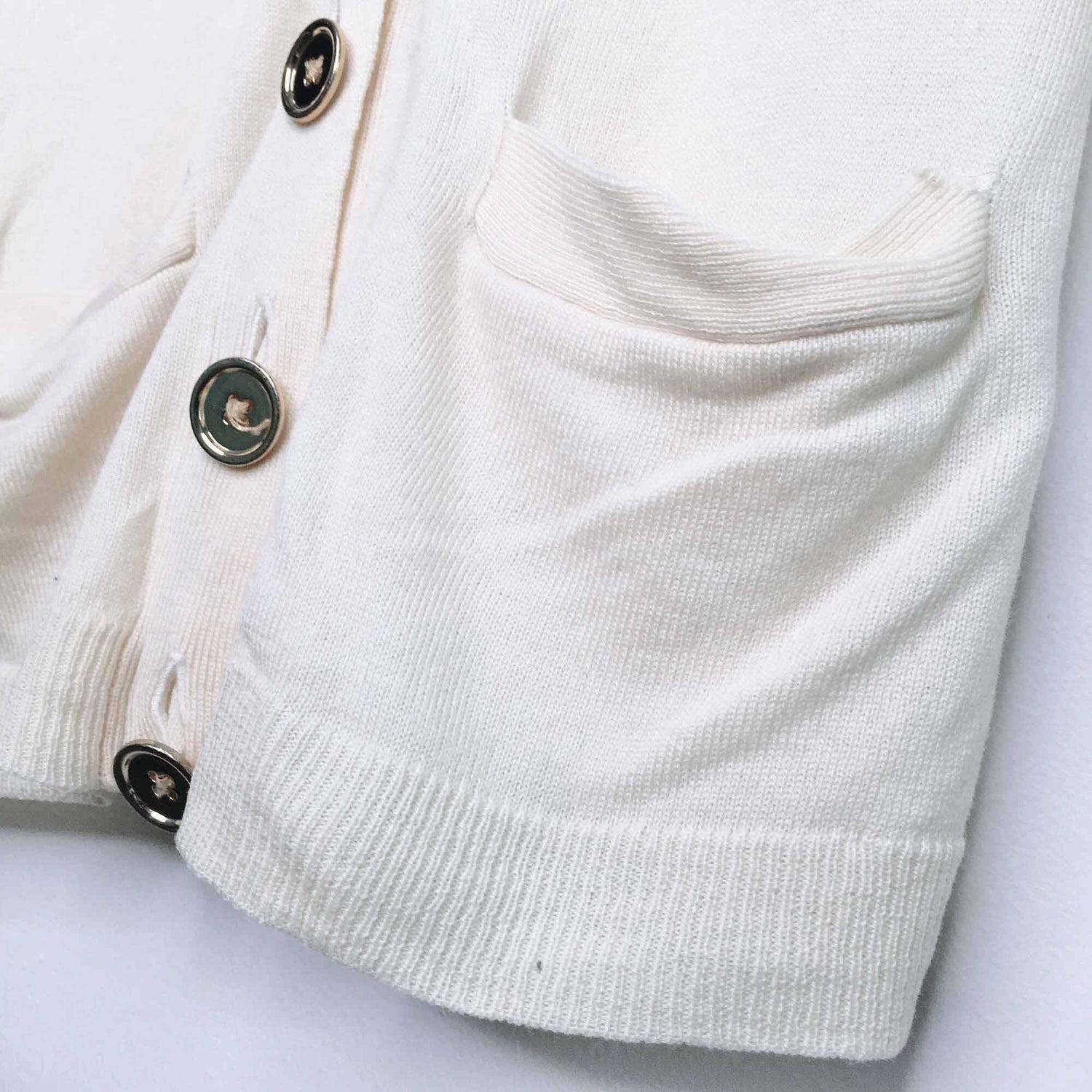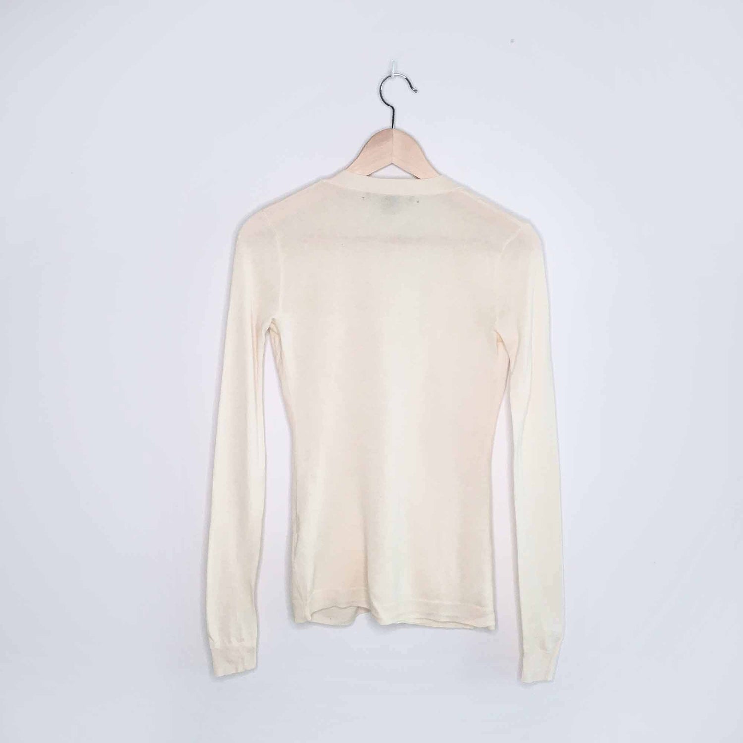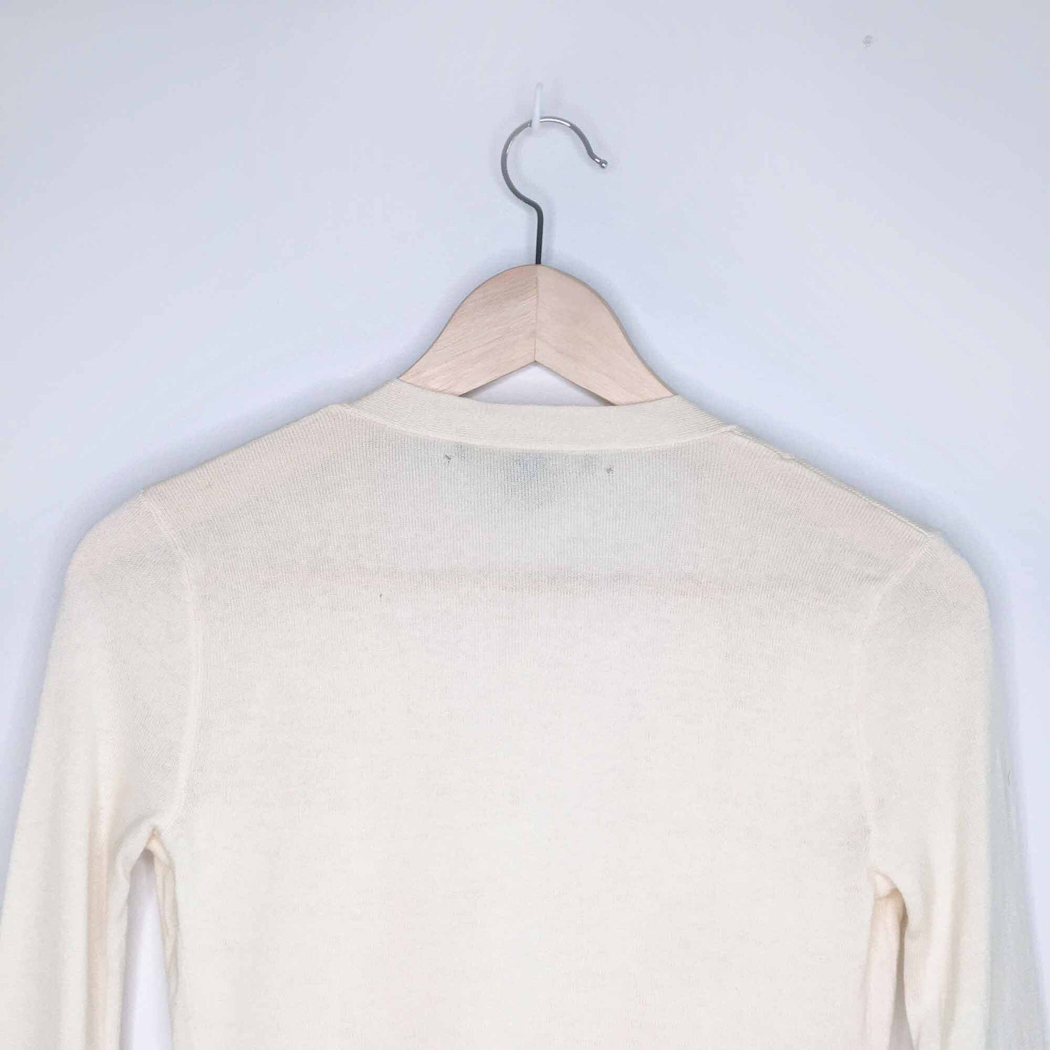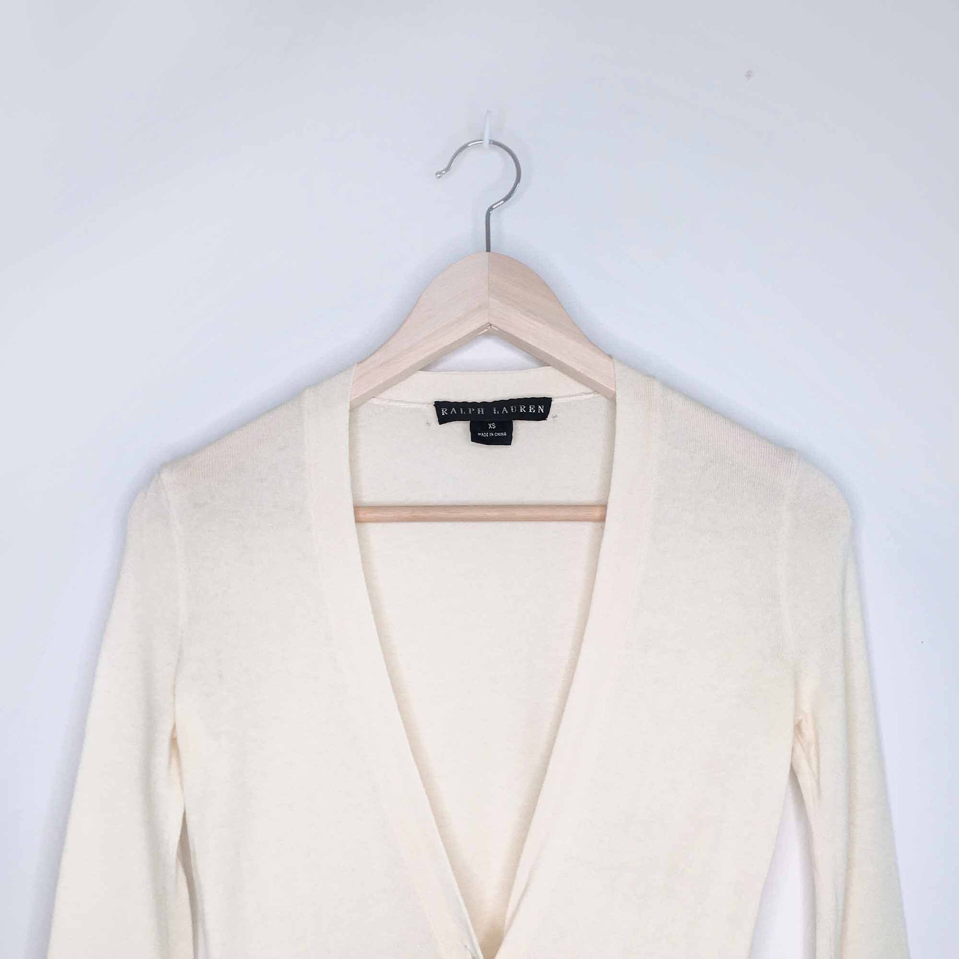 Item Description: This cream cardigan from Ralph Lauren’s high end Black Label features 5 gold buttons, and two front pockets. 100% cashmere