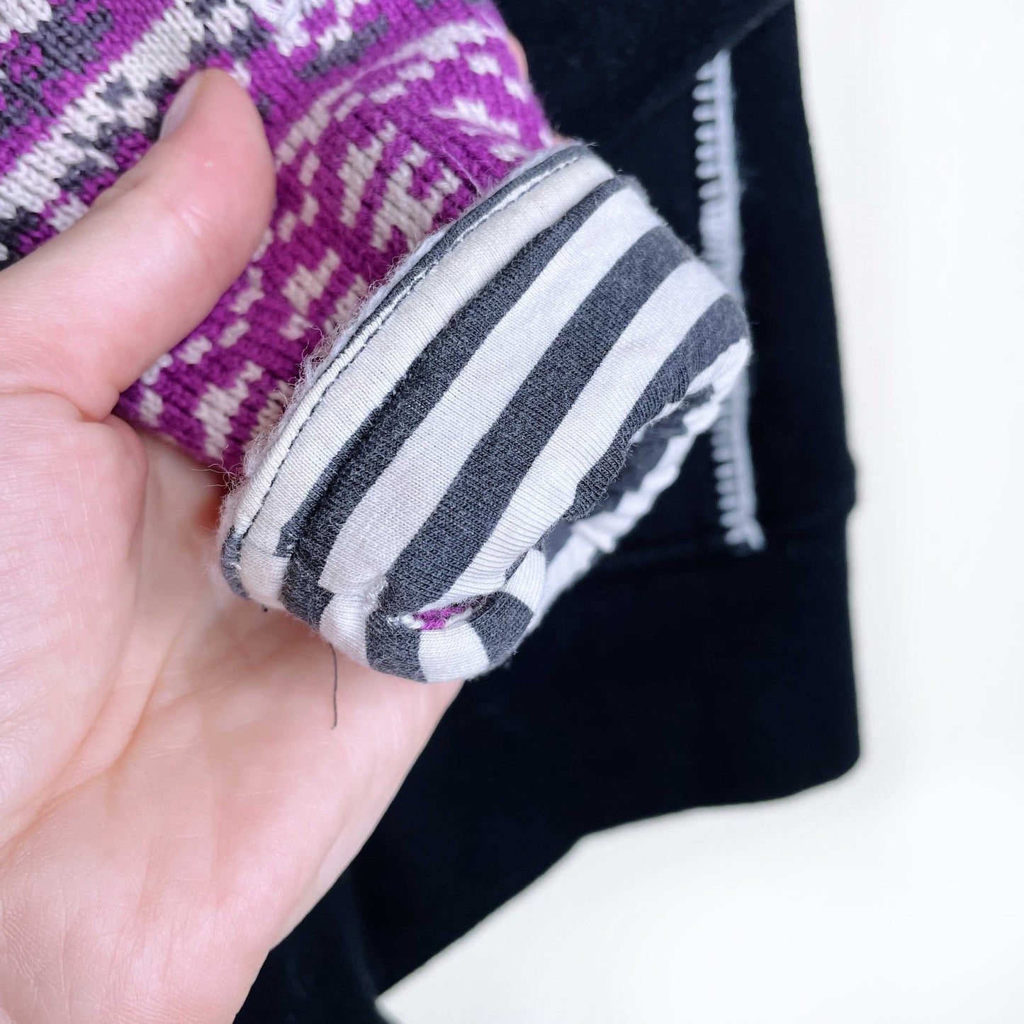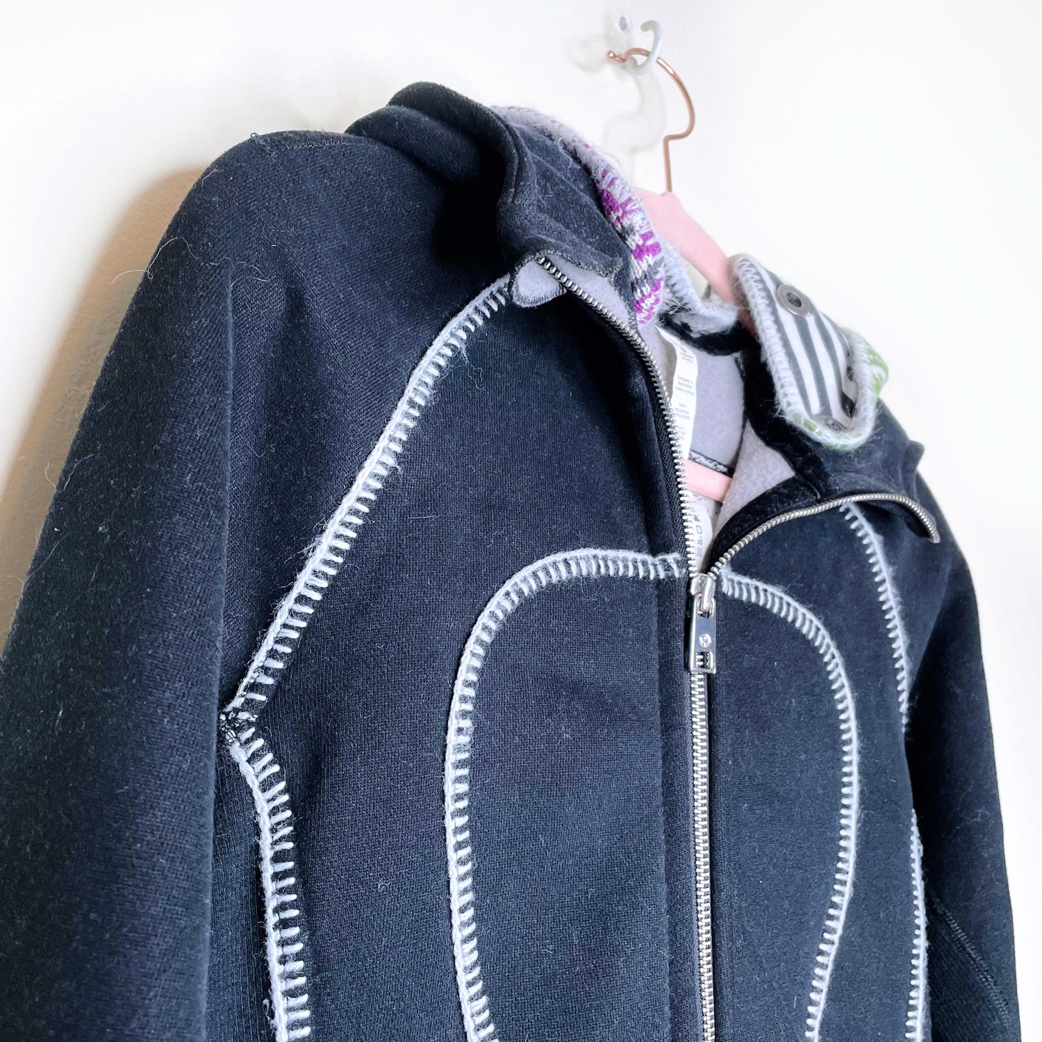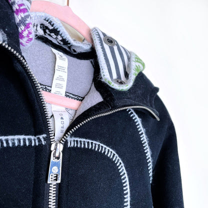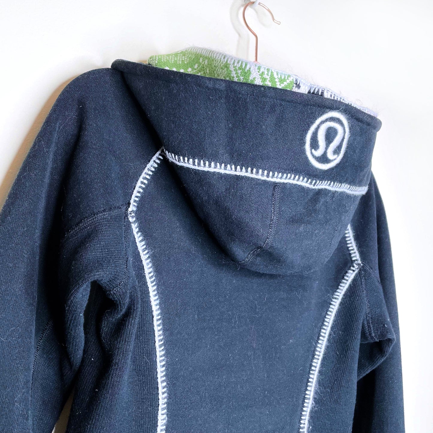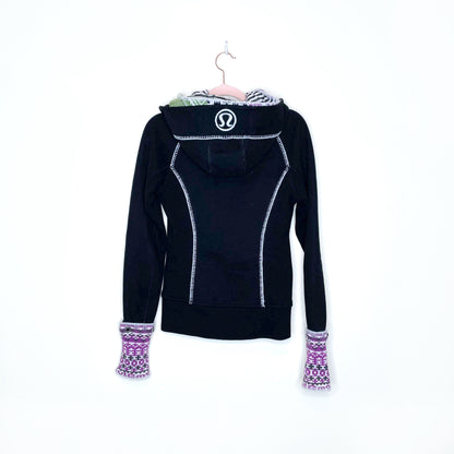 Item Description: This classic scuba hoodie from Lululemon features removable fair isle cuffs and hood liner, with contrast blanket stitching. 70% cotton 30% polyester