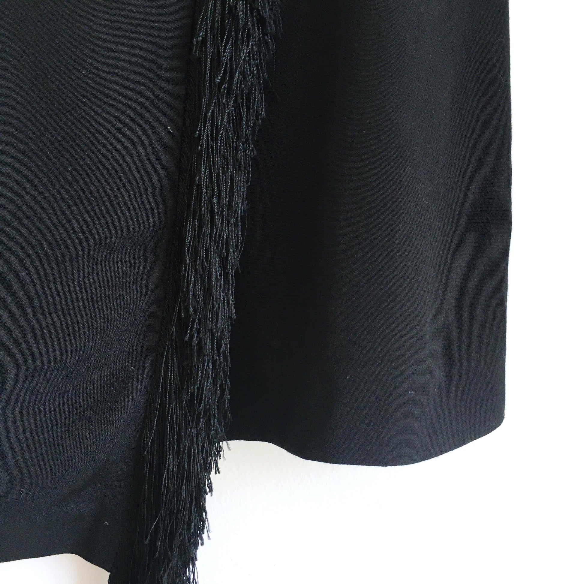 Item Description: This black crepe blouse from Rebecca Taylor features a slight cap sleeve, fringe hem on the faux wrap front, with asymmetrical dip and a keyhole back button closure. Lined. 100% rayon shell, 97% polyester, 3% spandex lining