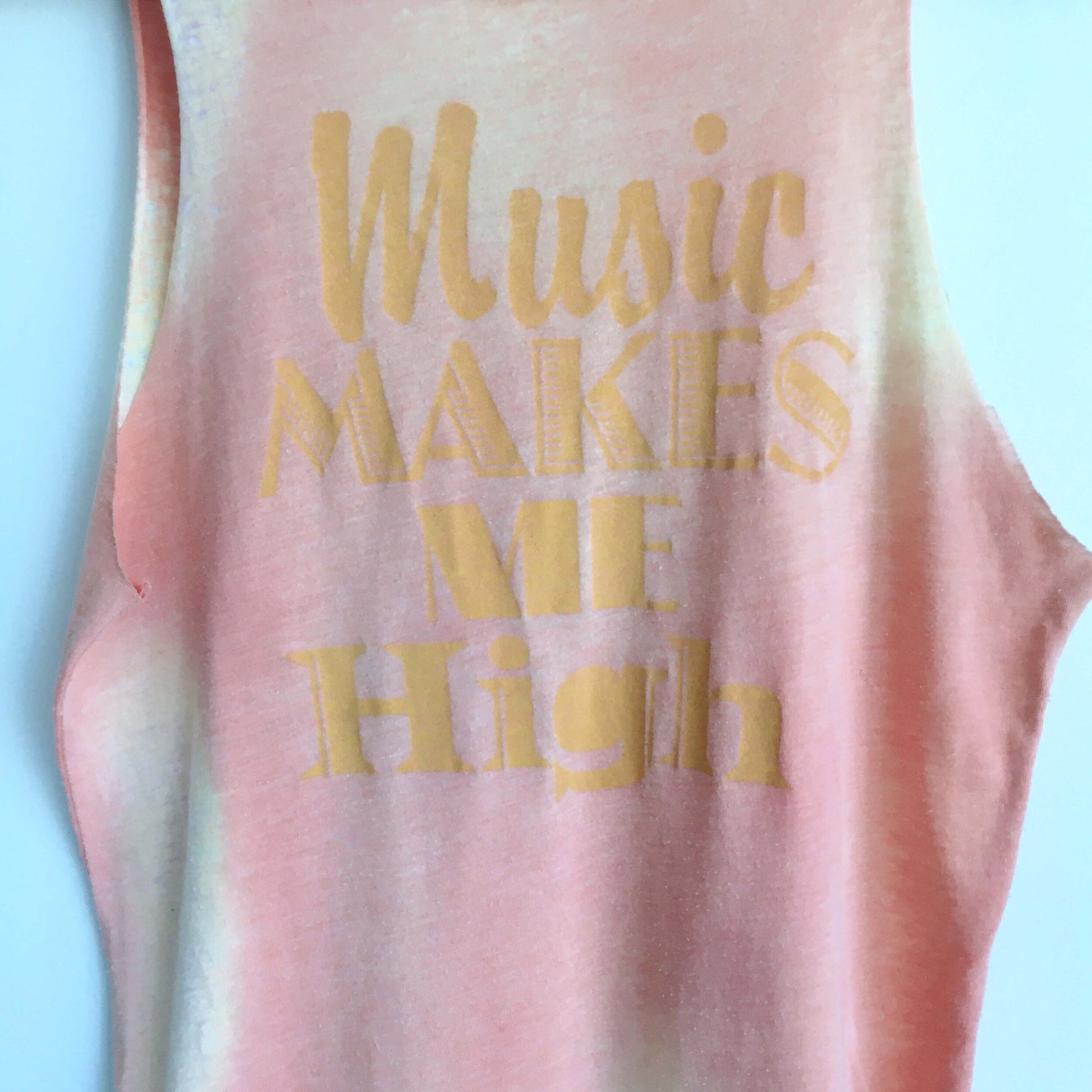 Item Description: This raw-edge tank from Rebel Yell features one of their most famous graphic prints, Music makes me high, in a faded vintage feel.