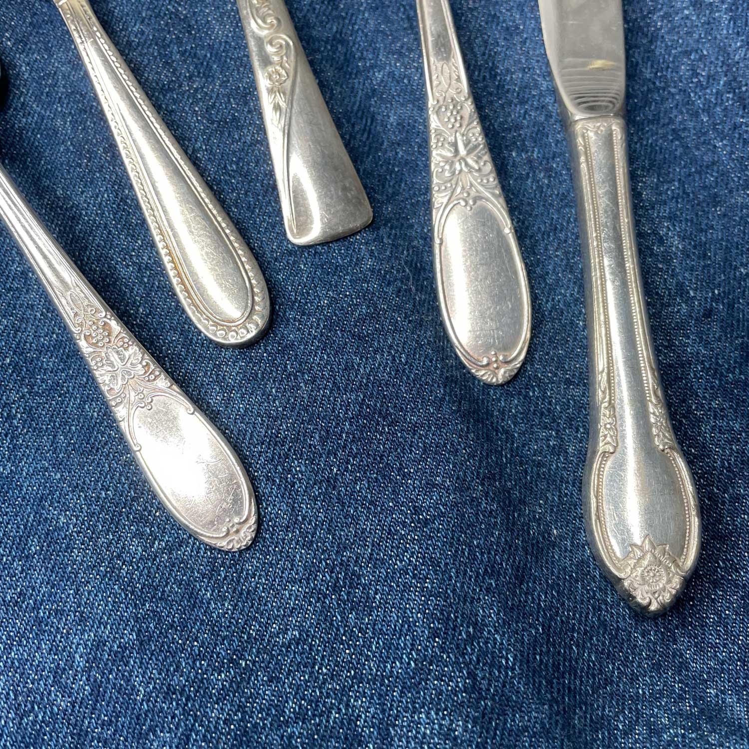 Carefully curated, this mis-matched set of antique and vintage silverware pieces boast beautiful detail and scroll work. Each set contains 5 pieces: butter knife, dinner fork, salad fork, large spoon and dessert spoon.