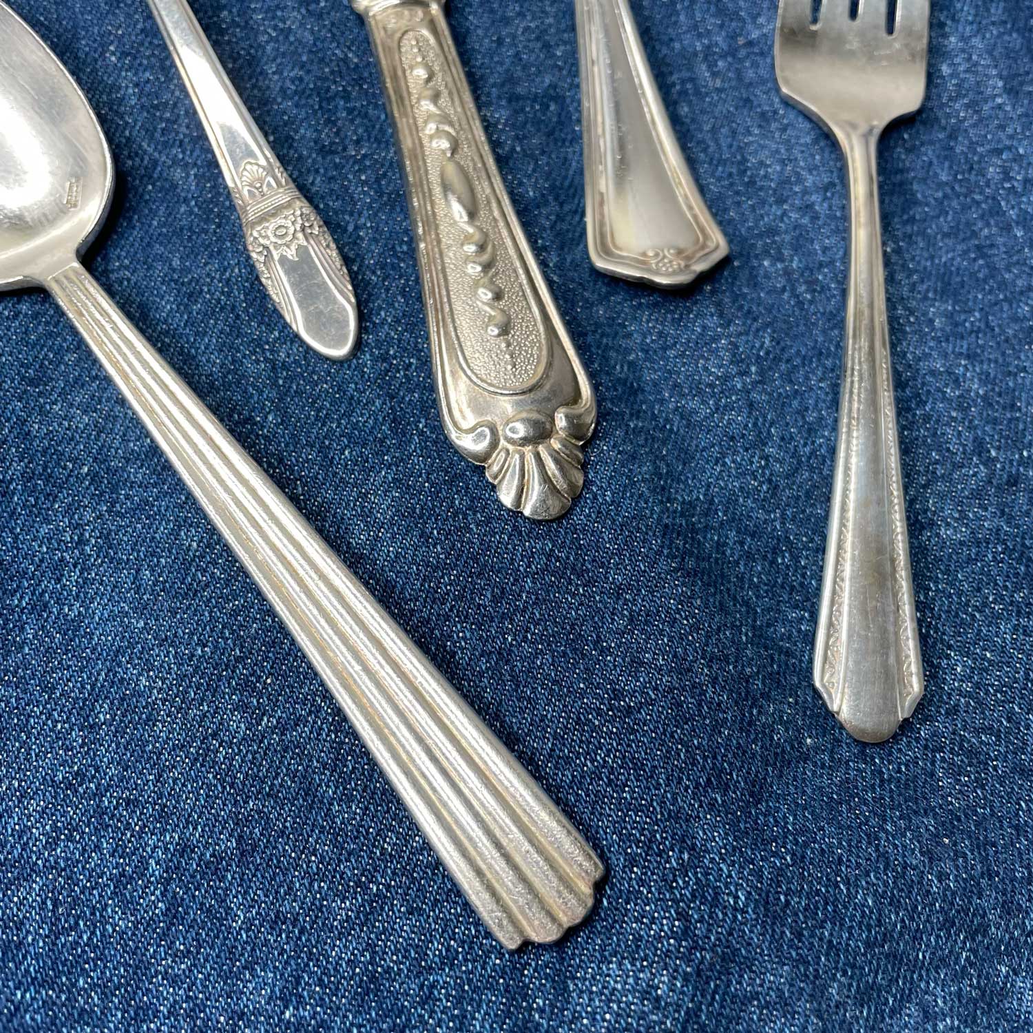 Carefully curated, this mis-matched set of antique and vintage silverware pieces boast beautiful detail and scroll work. Each set contains 5 pieces: butter knife, dinner fork, salad fork, large spoon and dessert spoon.