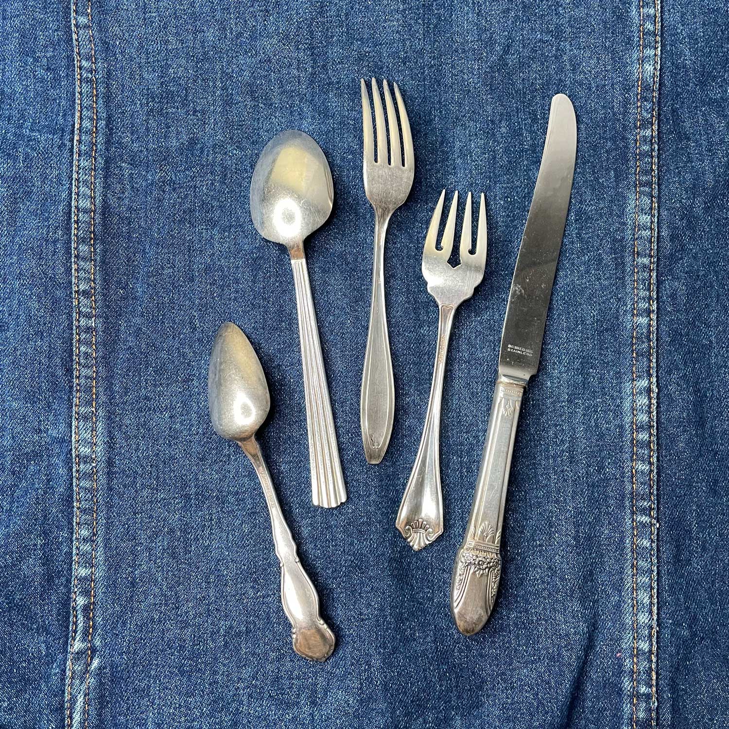 Carefully curated, this mis-matched set of antique and vintage silverware pieces boast beautiful detail and scroll work. Each set contains 5 pieces: butter knife, dinner fork, salad fork, large spoon and dessert spoon.
