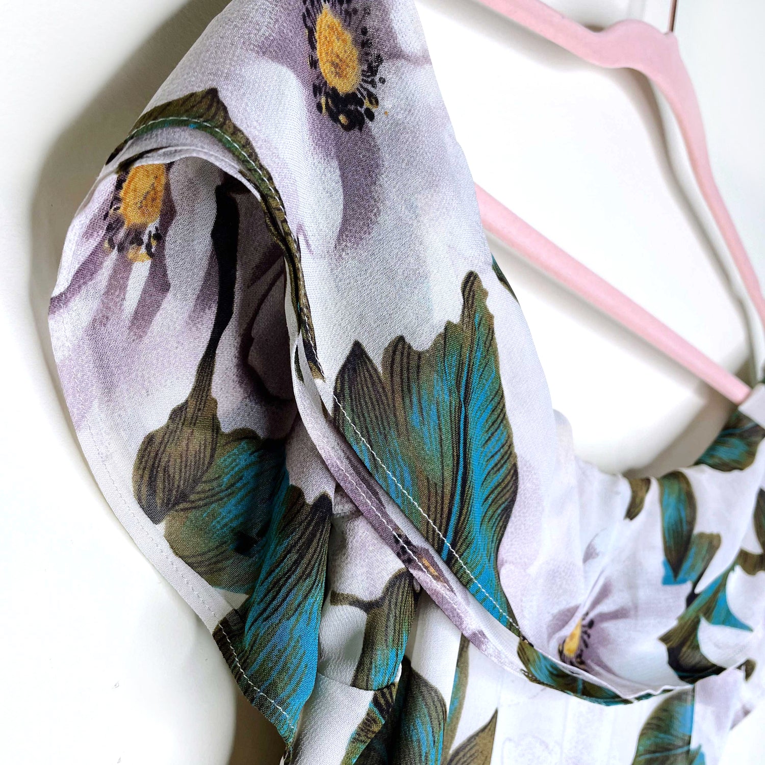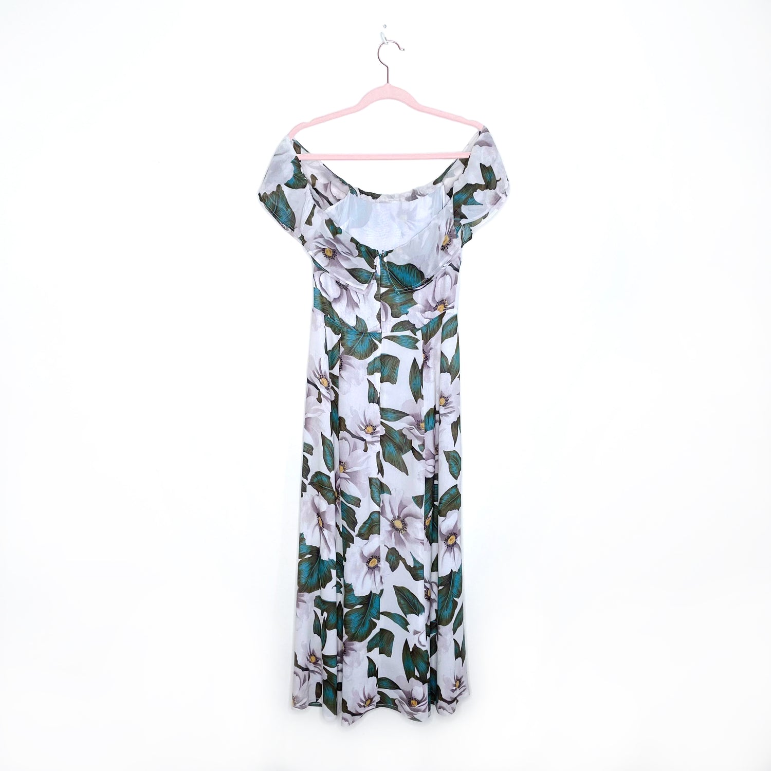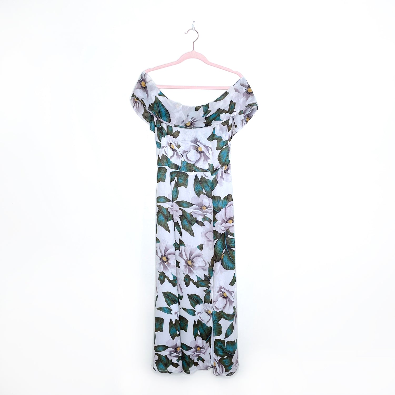 Item Description: This airy chiffon dress from Reformation features a romantic off shoulder neckline, slim fitting bodice and high slit in an all-round floral print. No content tag. Seems to fit like a maxi on the photo I found but she might be shorter than me - I'm 5'9 and I tried it on and it's a midi.