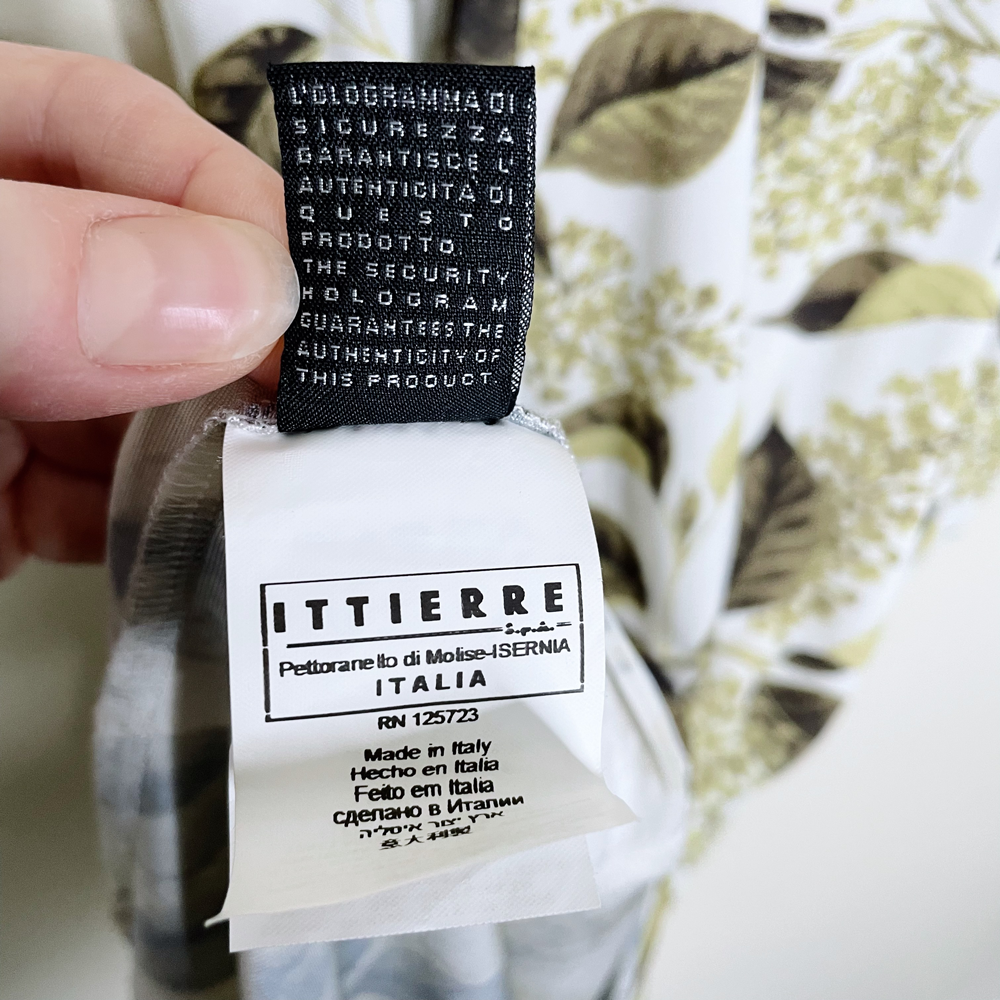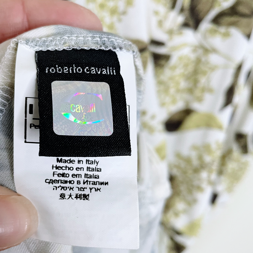 Item Description: This silky, super stretch dress from Roberto Cavalli's y2k Just Cavalli line features a leafy print in earth tones with banded chest, elegant ruched shoulders, plunging v-neckline and ruched sides with a knee-length finish. 90% viscose 10% elastane
