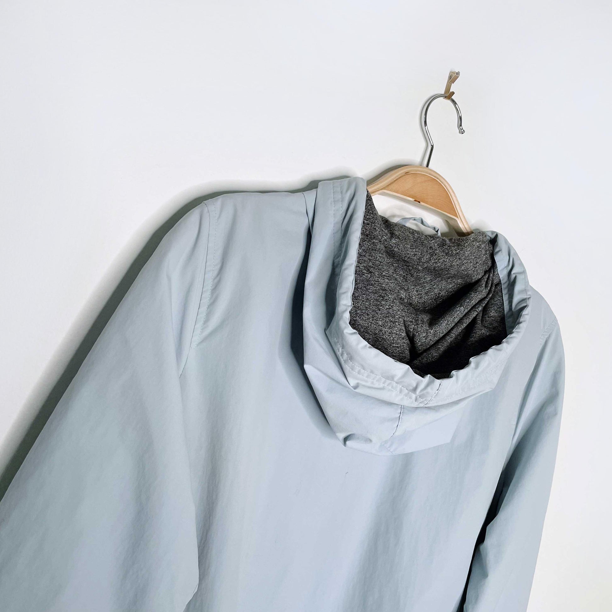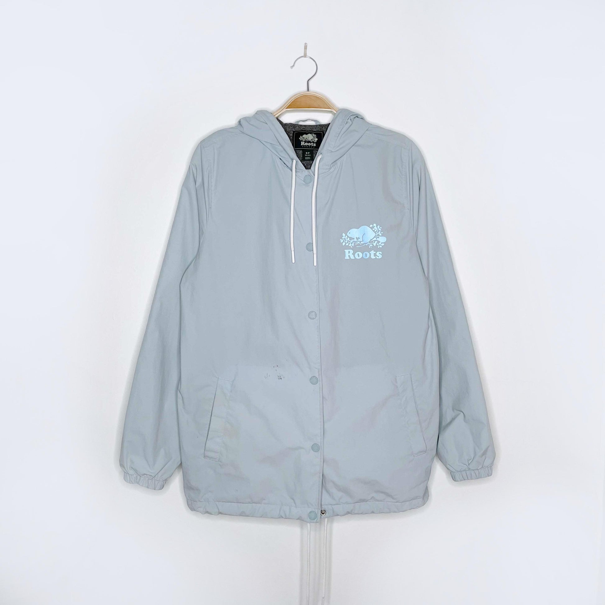 Item description: This rain/windbreaker from Roots features a nylon shell with a soft, jersey lining. A snap button closure and drawstring hood makes this perfect for spring. 100% nylon shell