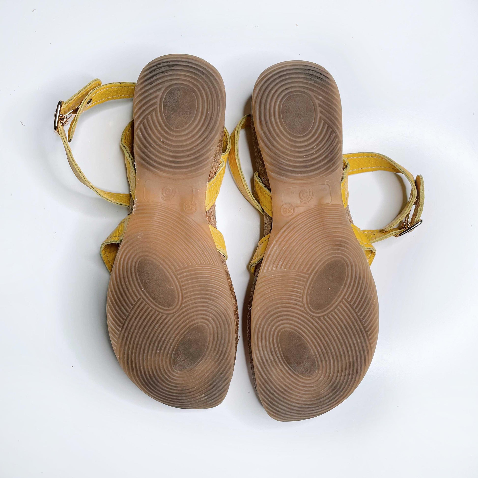 Item description: Set on a footbed that hugs the sole, these leather sandals from Roots feature a wrap around ankle and thong toe for a strappy, casual look. Leather upper, cork footbed, rubber sole.