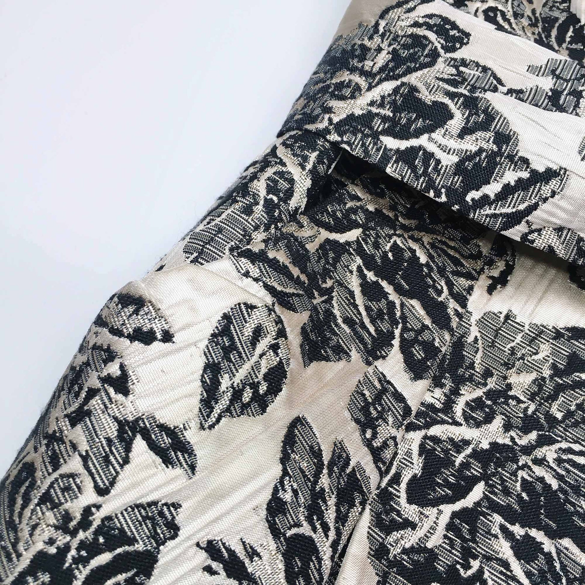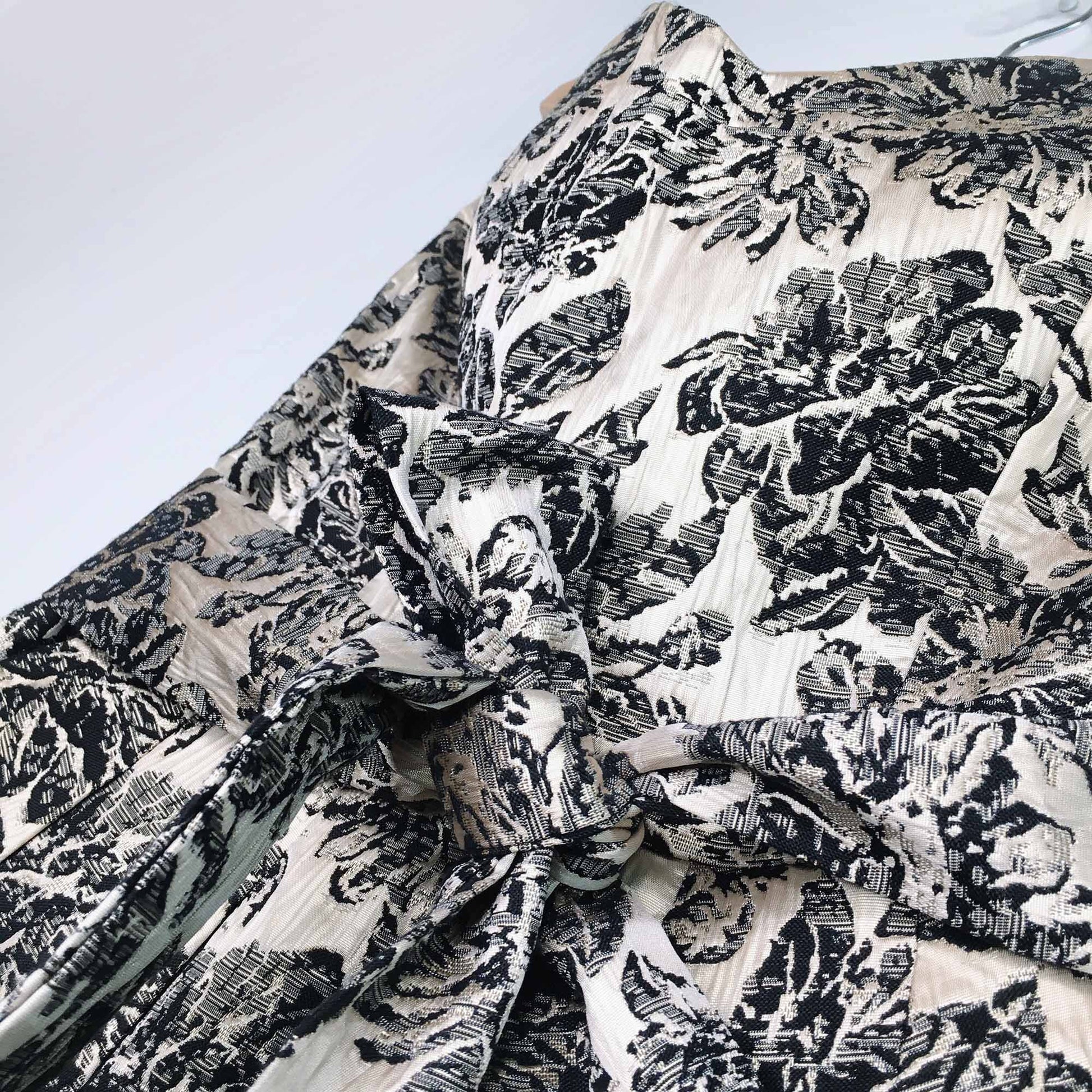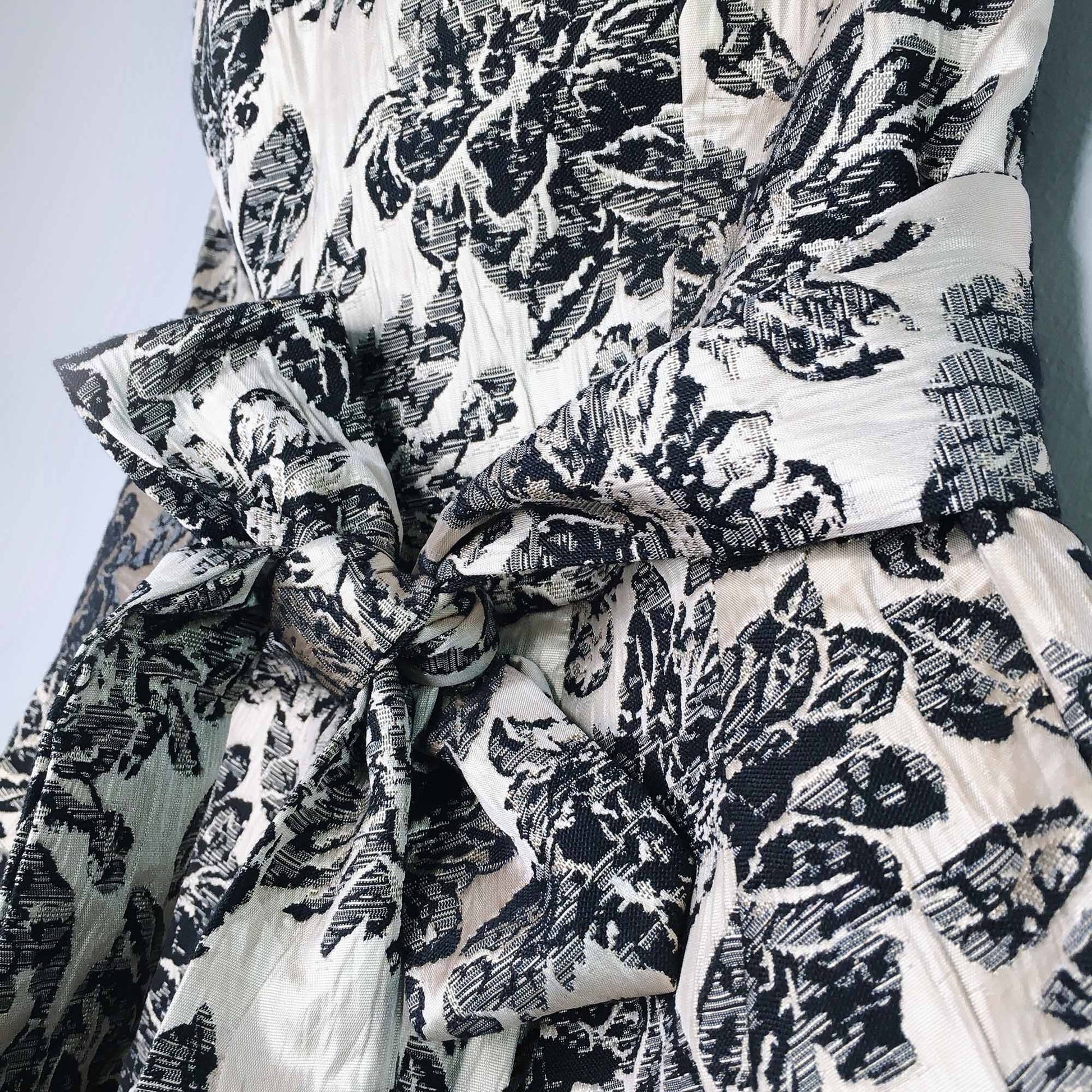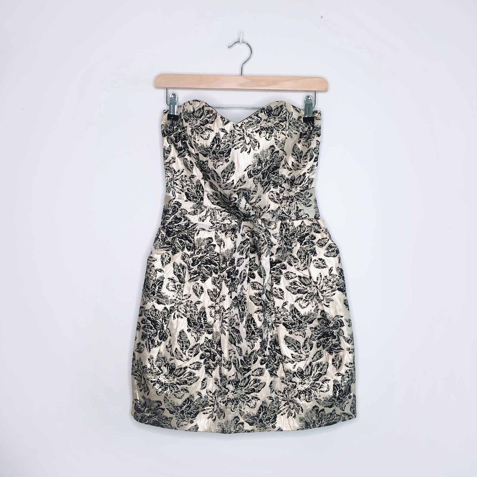 Item Description: This stunning strapless party dress from Rubber Ducky features a gold and black brocade exterior with self-tie belt for added drama.