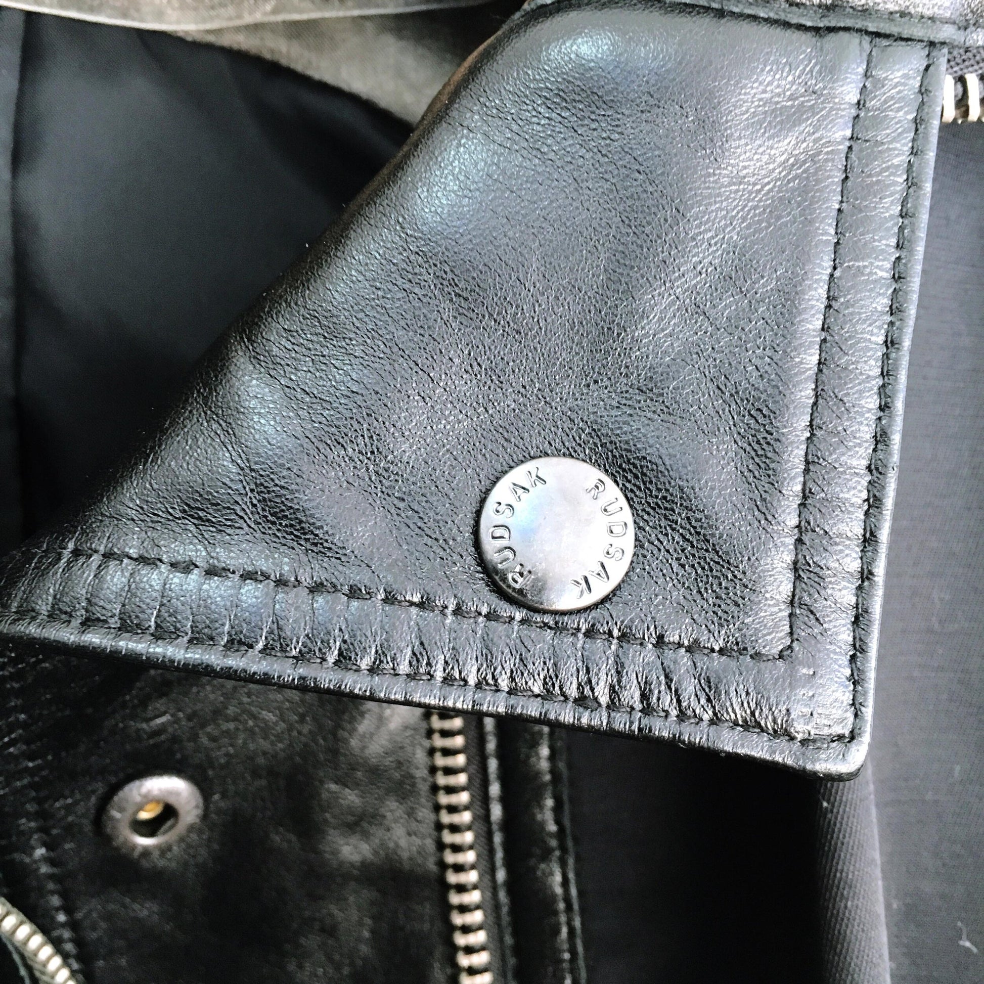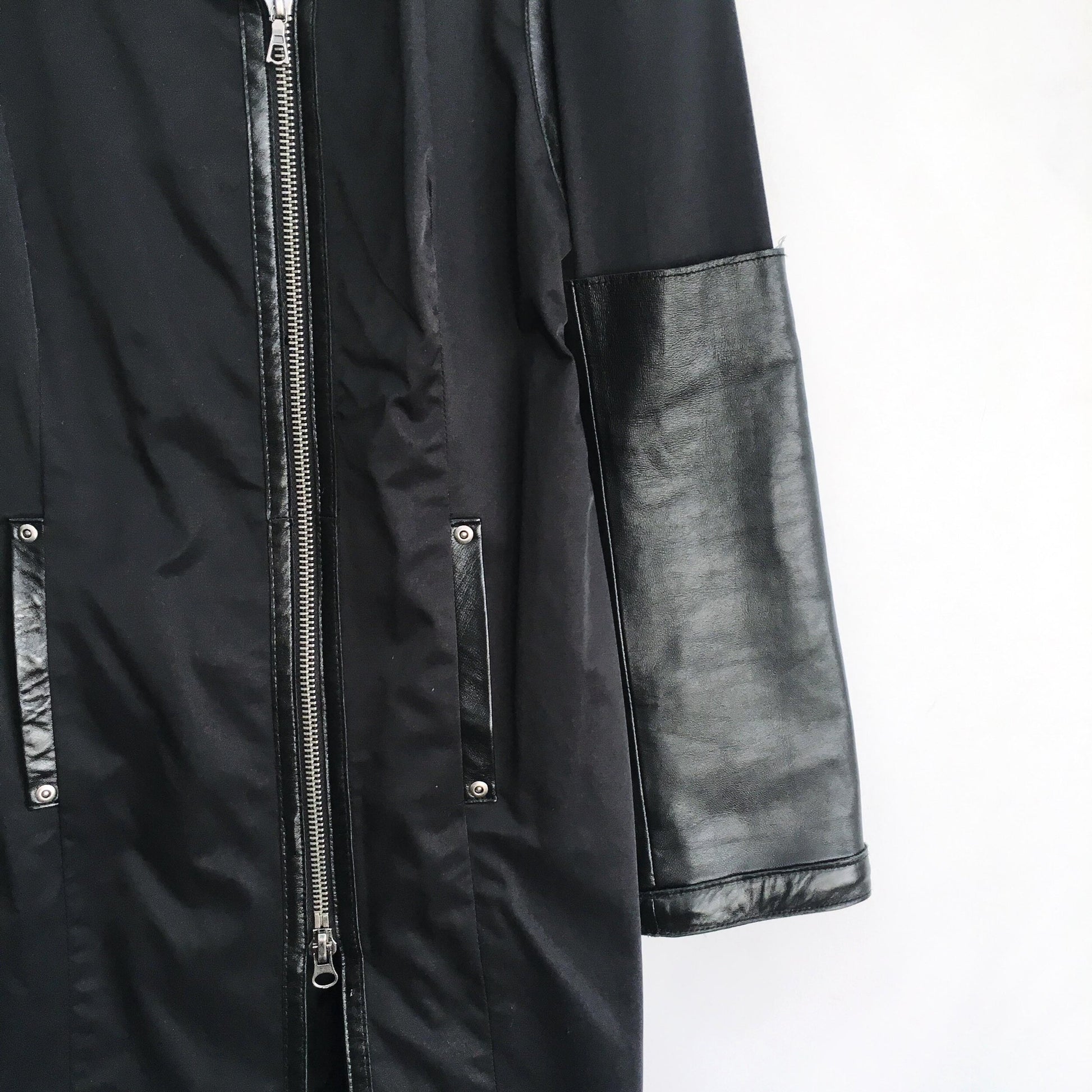 Item Description: This classic trench got an upgrade with oversized leather cuffs and trim, breathing holes at the back of the arms and an asymmetrical zip. Classic and classy. 48% nylon 48% cotton 4% spandex, 100% leather