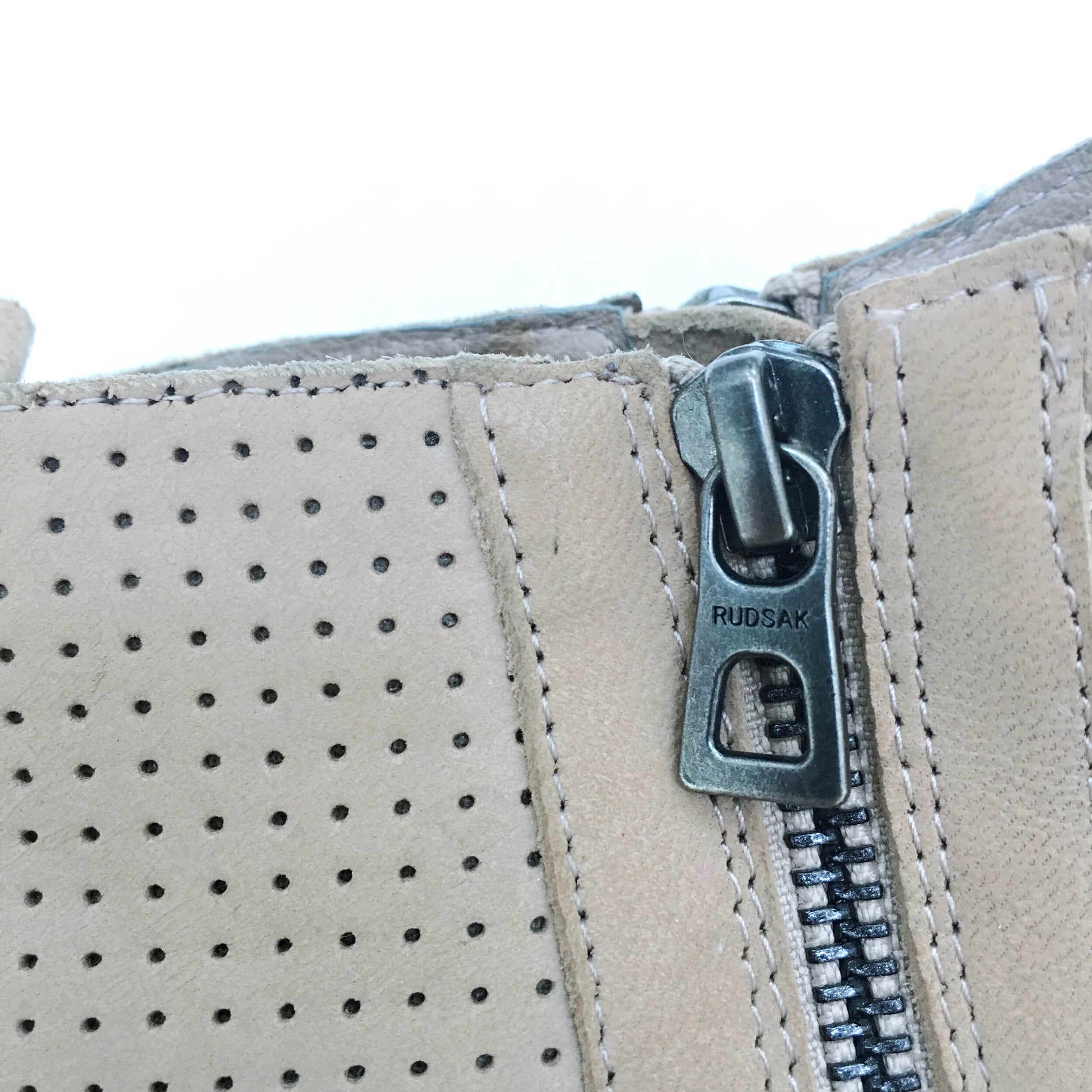 Item Description: These tan perforated boots from Rudsak features side zippers on both sides, with a canvas interior and suede exterior.