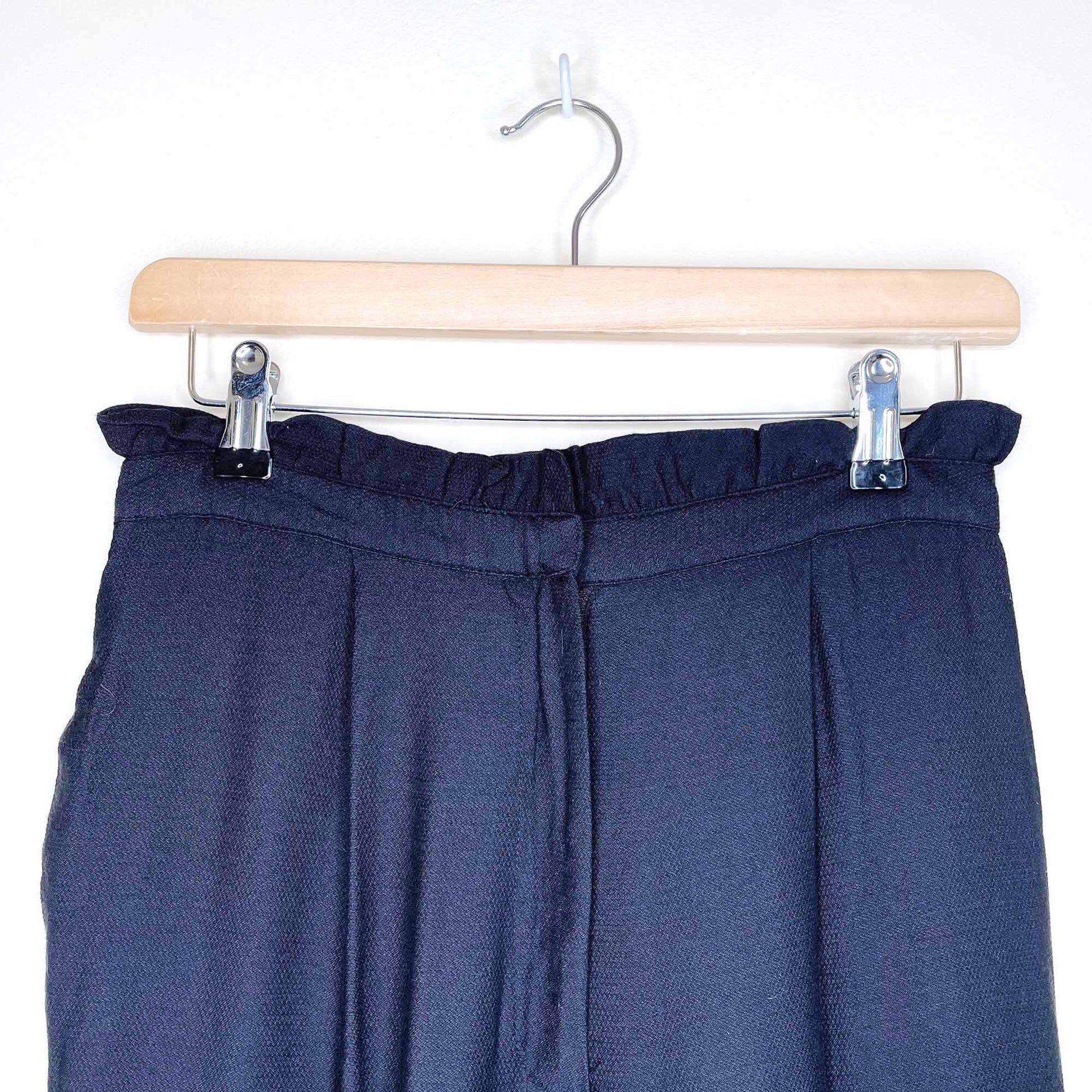 Item Description: This pair of lightweight, textured trousers will surely win your heart over. With a high rise, subtly pleated waistband and top ruffle these understated pants will be a closet staple. 100% polyester