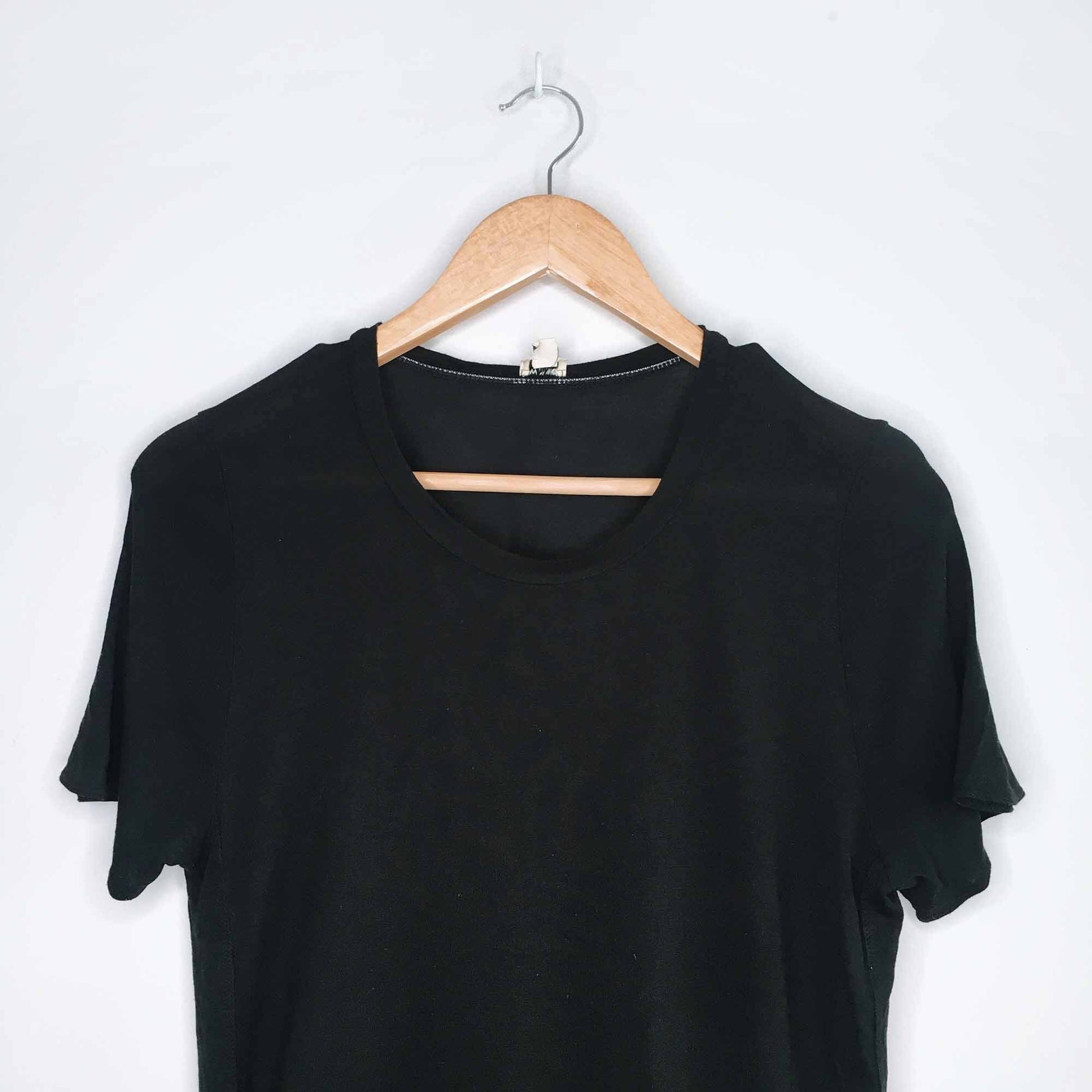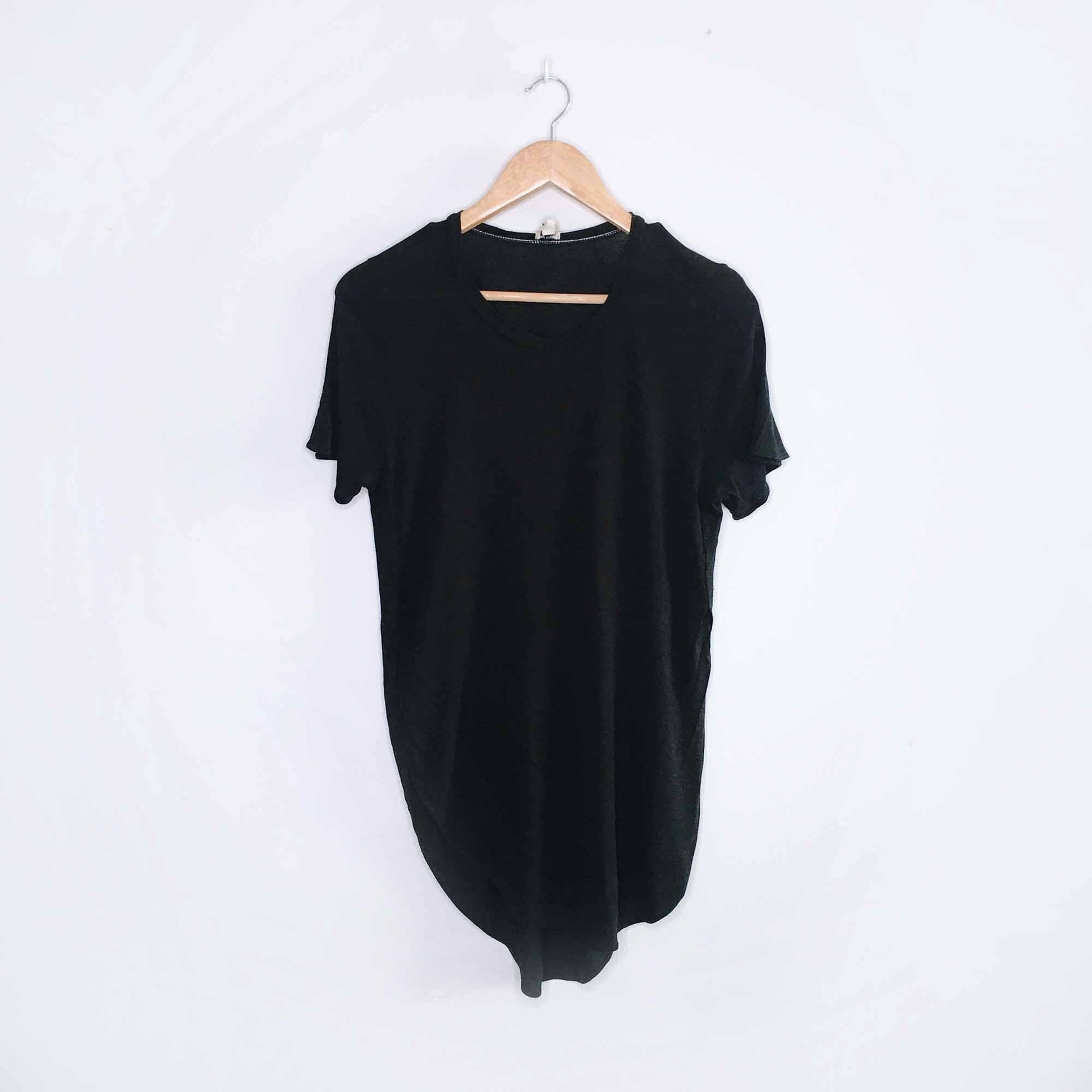 Item Description: These basic Capucine tees from Aritzia feature a crew neck, short sleeve and long hem with high side slits. 100% rayon