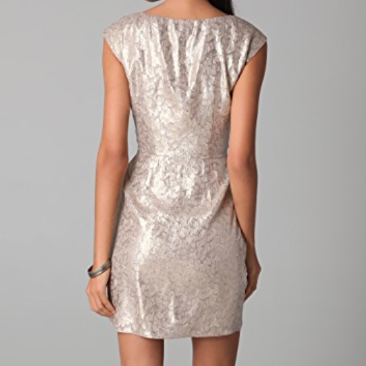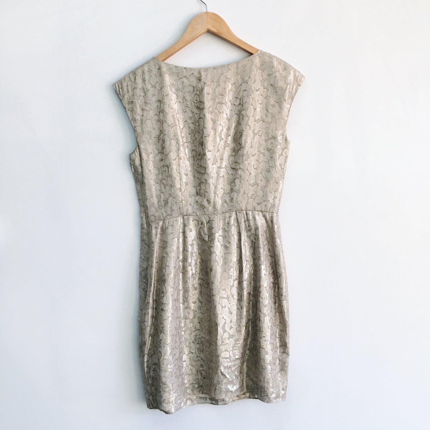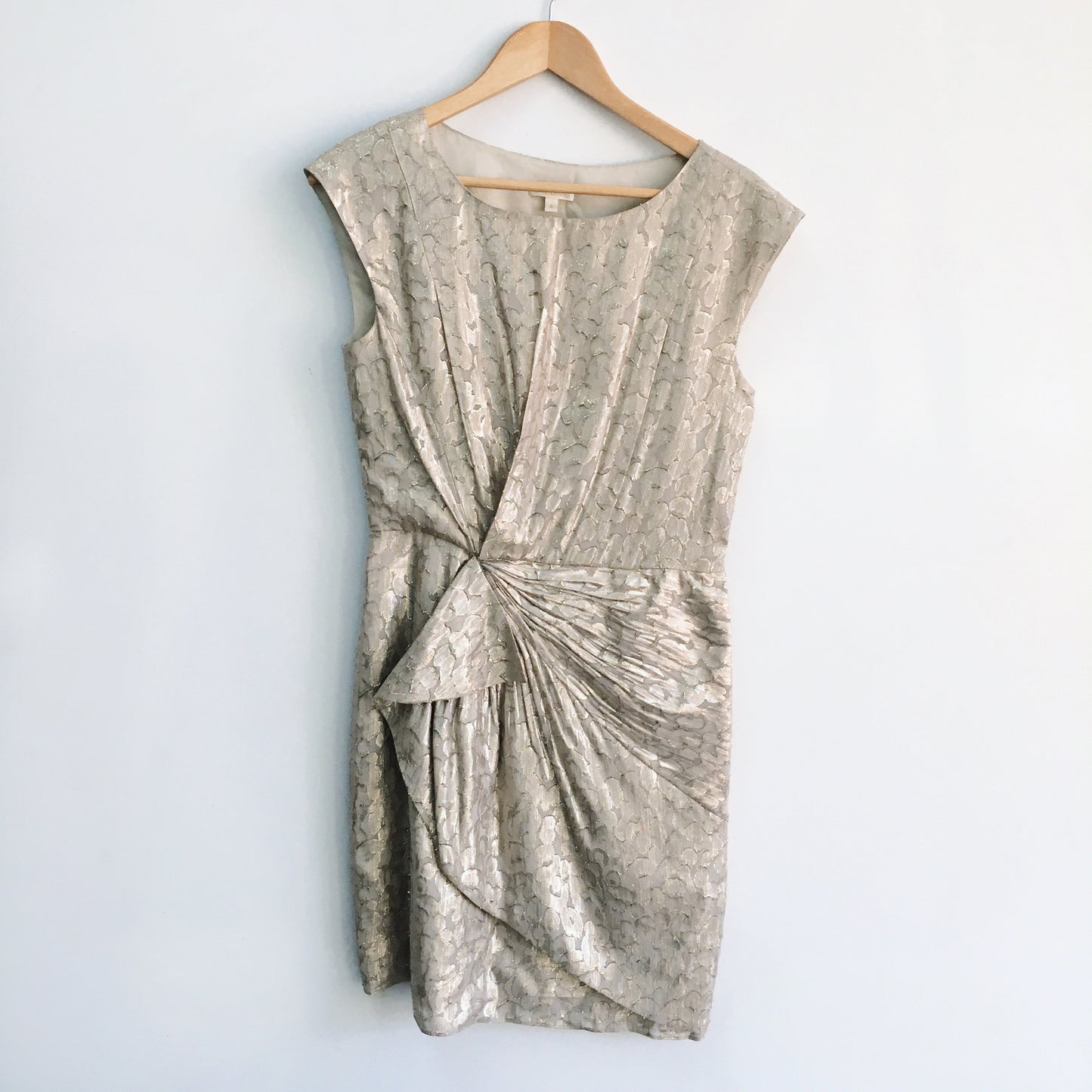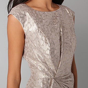 Item Description: This scoop-neck silk dress features a lightweight metallic jacquard pattern. Pleating at bodice and pleated, draped overlay at skirt. Hidden side zip. Cap sleeves. Lined.