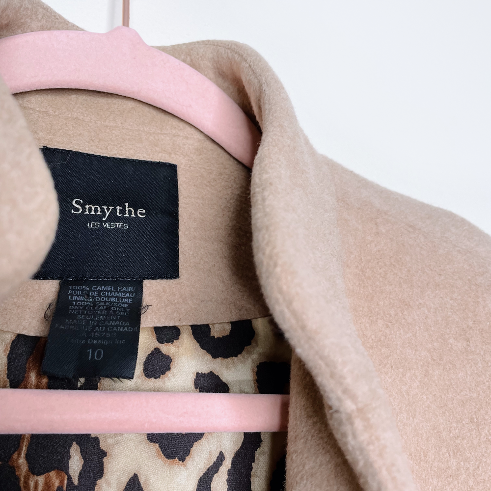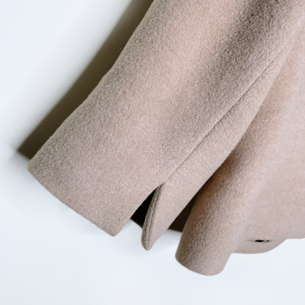 Item Description: A classic bolero shape, this cropped jacket from Smythe les Vestes is made with 100% camel hair, and features two front pockets and 3/4 sleeves with a standing collar and open silhouette. 100% camel hair, 100% silk lining