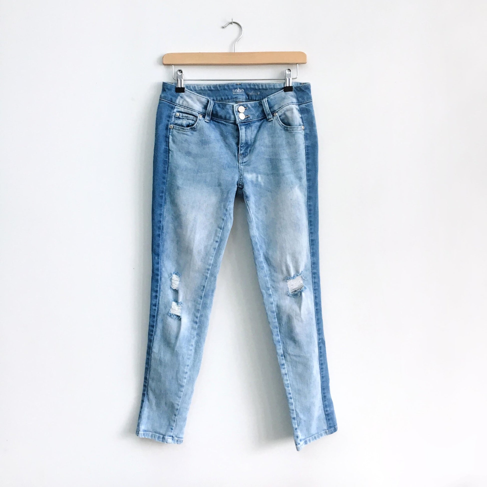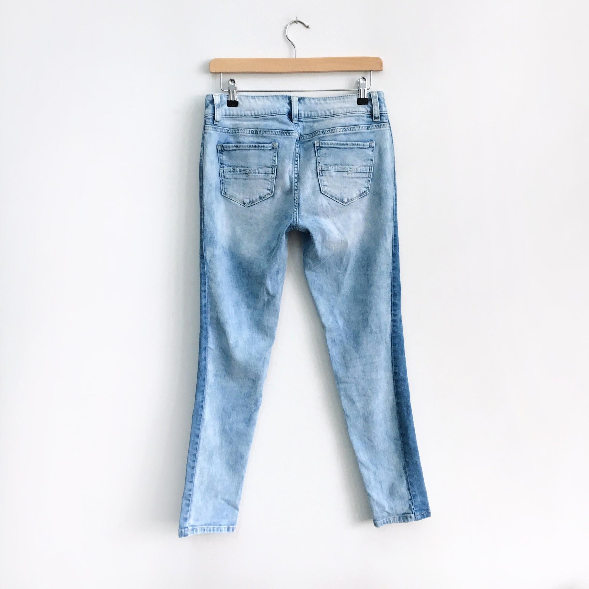 Item Description: Blue hues complement one another perfectly on this must-have skinny jean, finished with silvertone hardware and topstitched logo detailing. 99% cotton 1% spandex