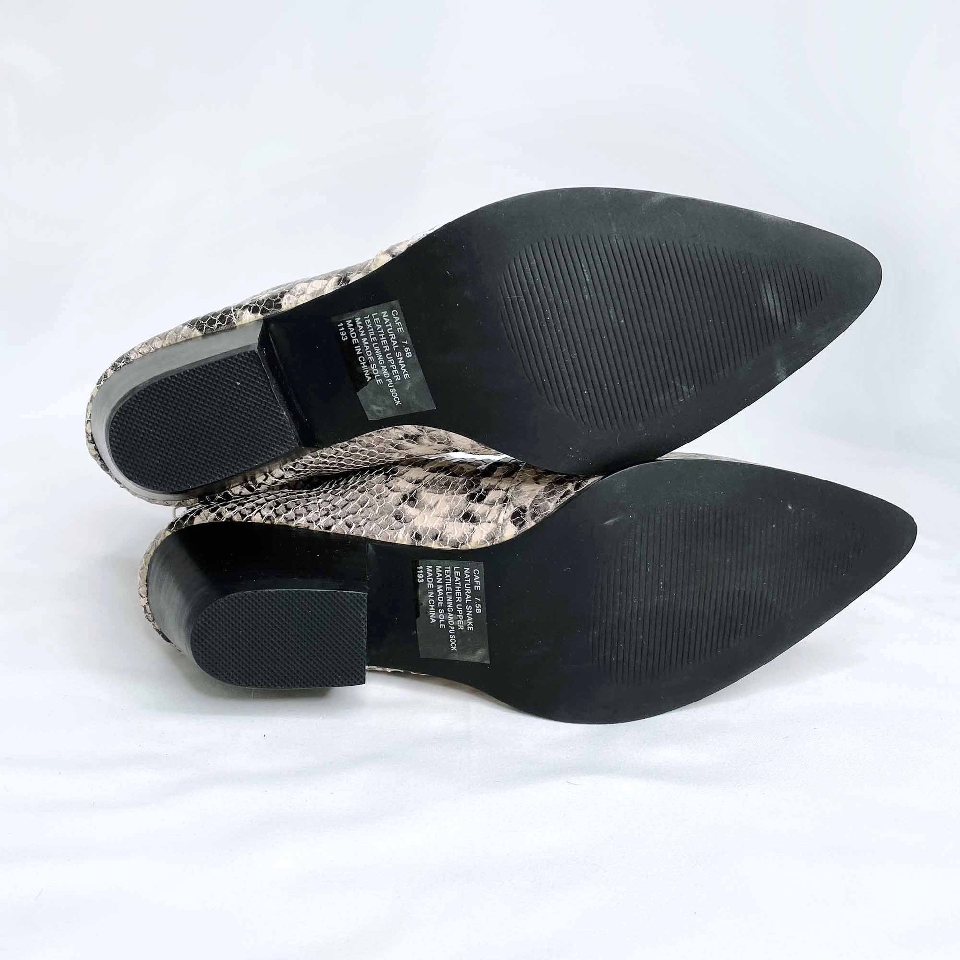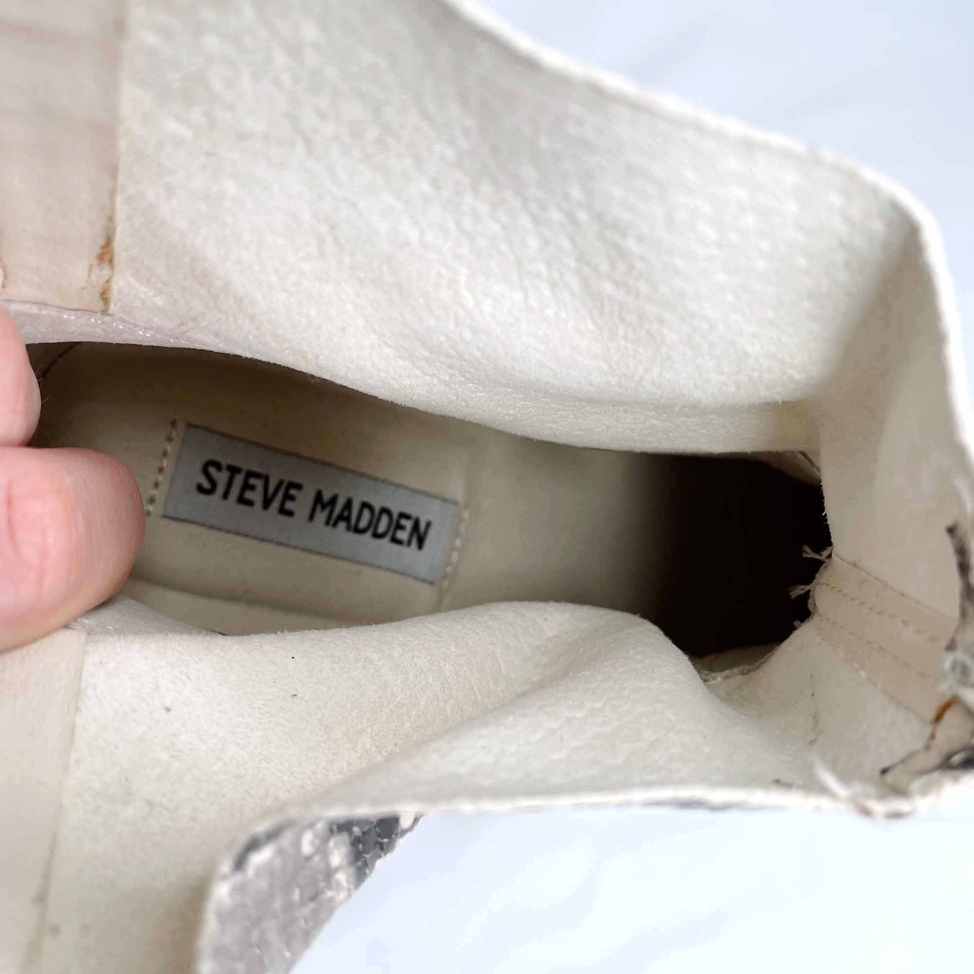 Item Description: You'll look like the cutest outlaw in town when you step out in the Steve Madden Cafe Natural Snake Leather Ankle Booties! Genuine leather, embossed in a wild black and white snake print, shapes these adorably western-inspired booties with a pointed toe and a short cropped shaft. 4.5" silver zipper at back.