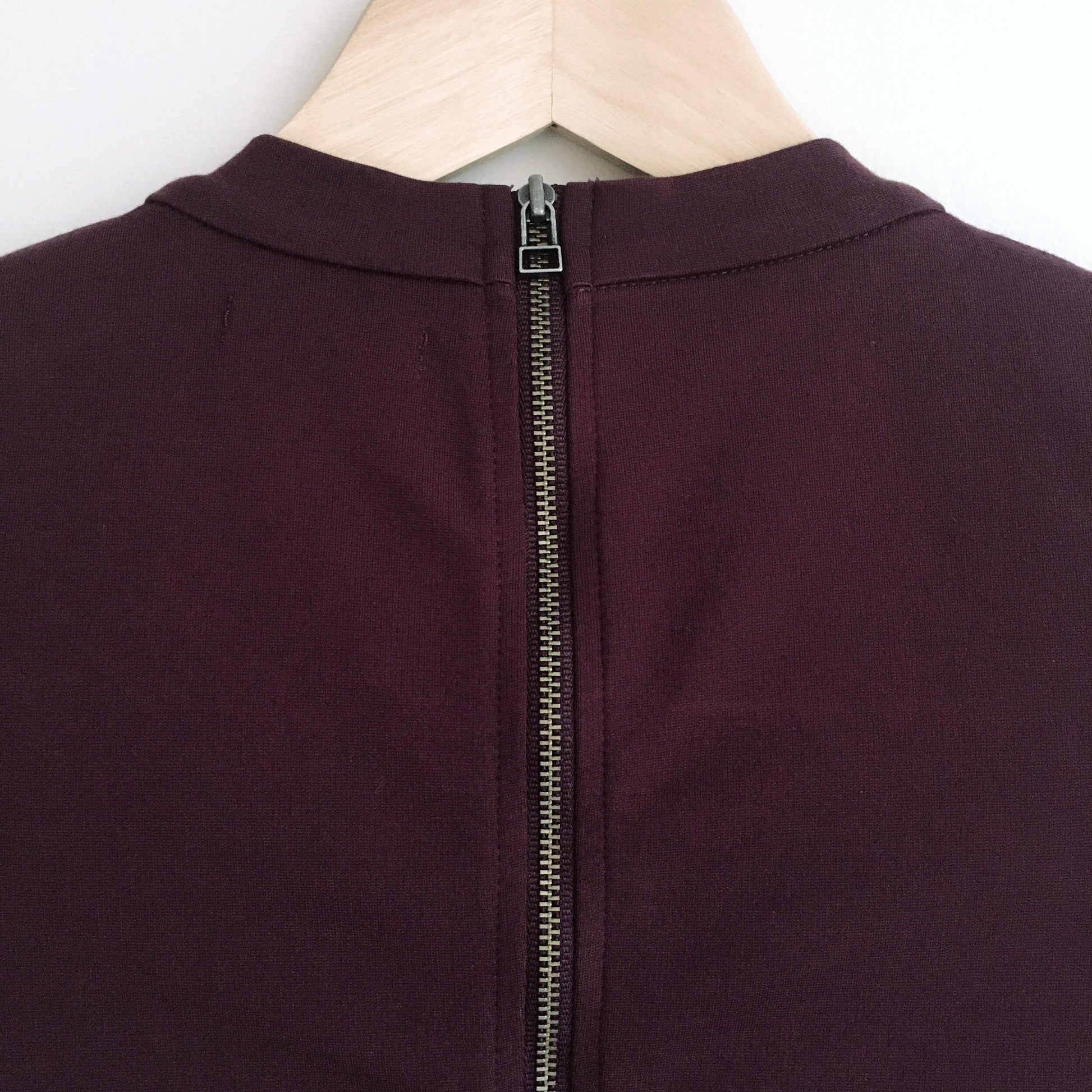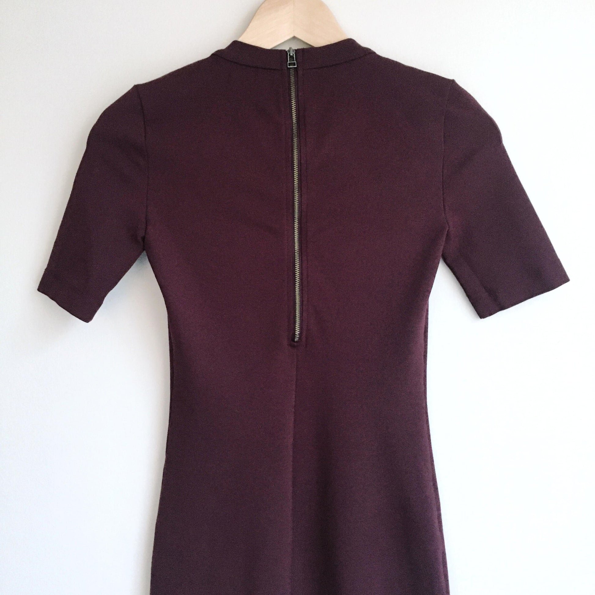 Item Description: This classic t-shirt dress from Aritzia’s Sunday Best is set in a deep wine colour - bodycon fit with a long zipper back. 66% rayon 29% nylon 5% spandex
