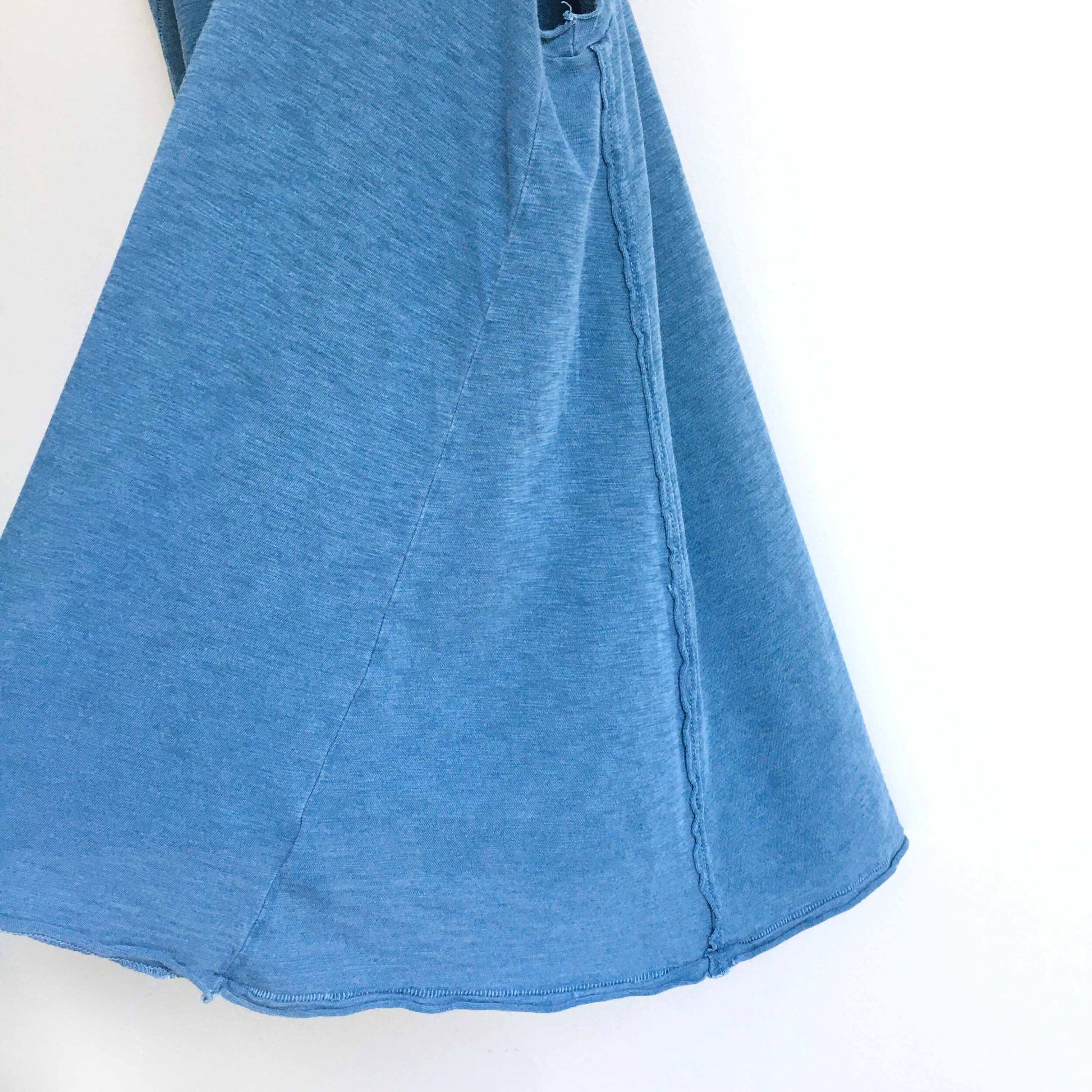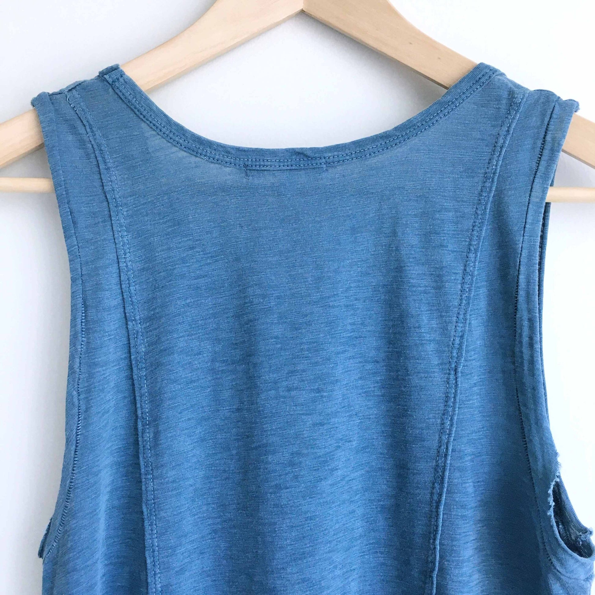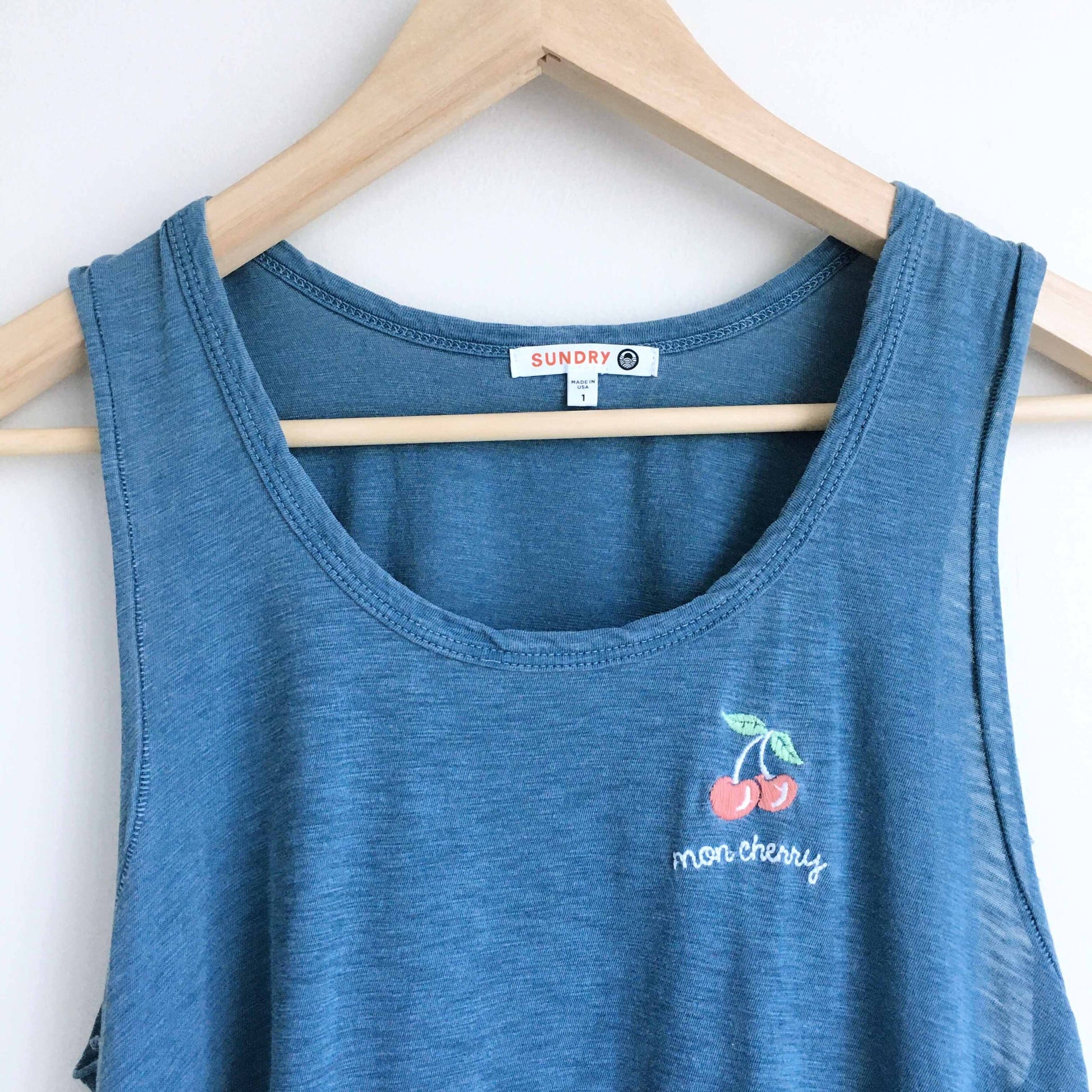 Item Description: This panelled blue swing tank from Sundry features mon cherry embroidered front, with distress details, and hi lo hem in an overall pigmented hue. 100% pima cotton