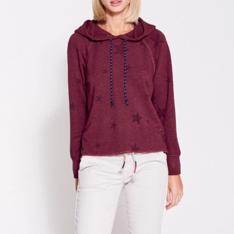 Item Description: A cropped hoodie pullover cut in an ultra-soft stretch fabrication. Featuring a raw edge, printed star graphics, and muff pocket. 66% viscose 29% cotton 5% spandex