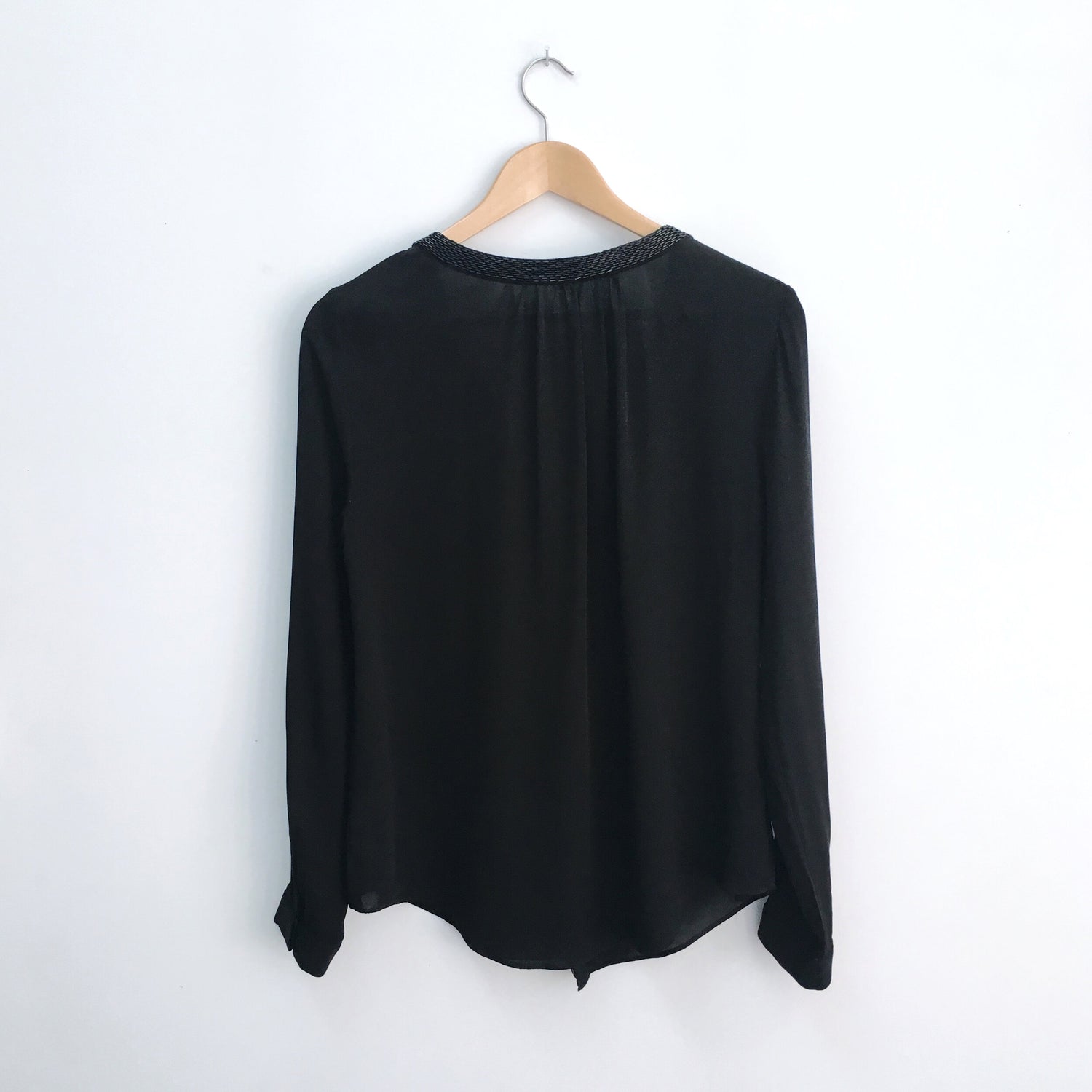 Item Description: Aritzia takes their classic Bergen blouse to the next level, lining the neckline and button cover with exquisite beadwork. 100% silk. All beads accounted for.