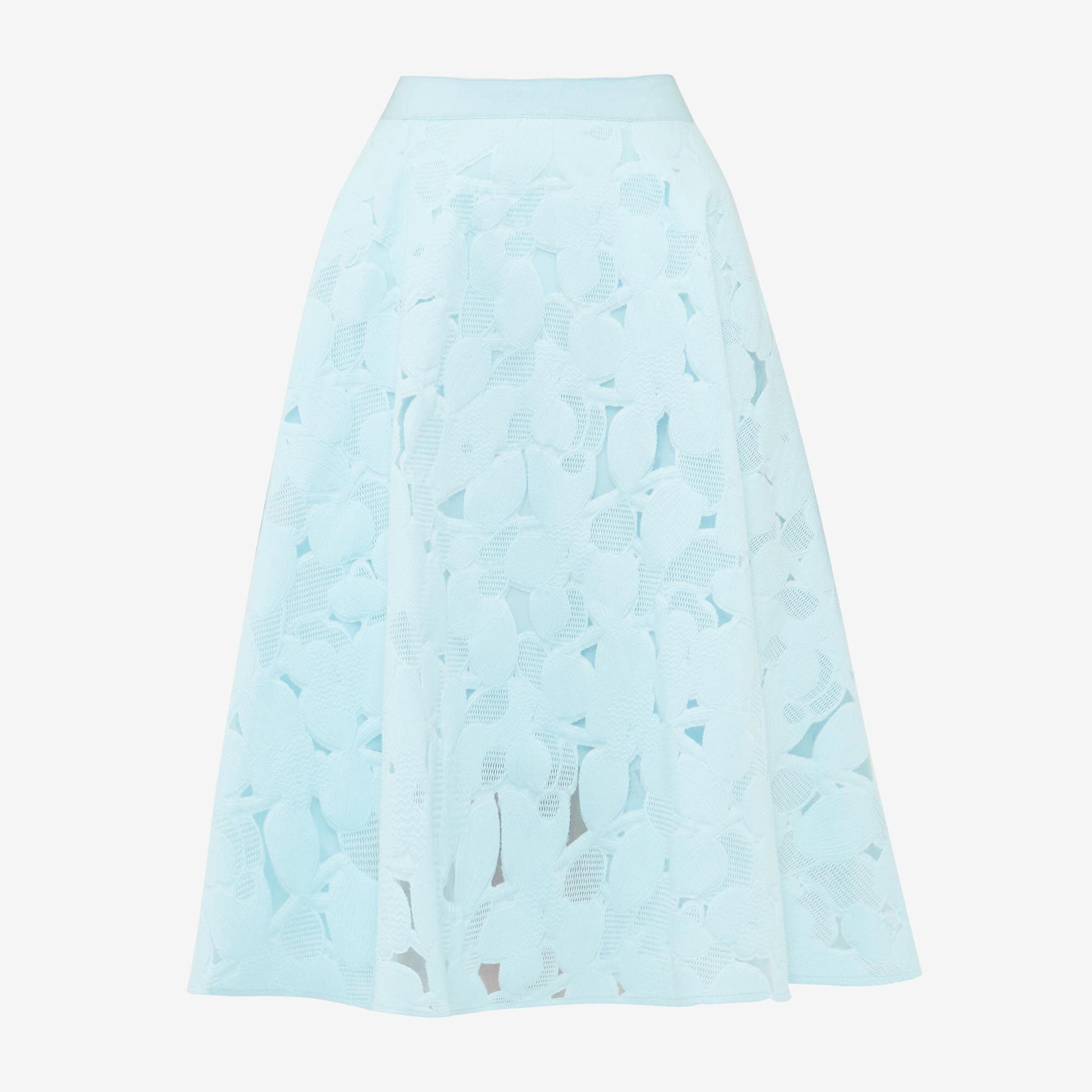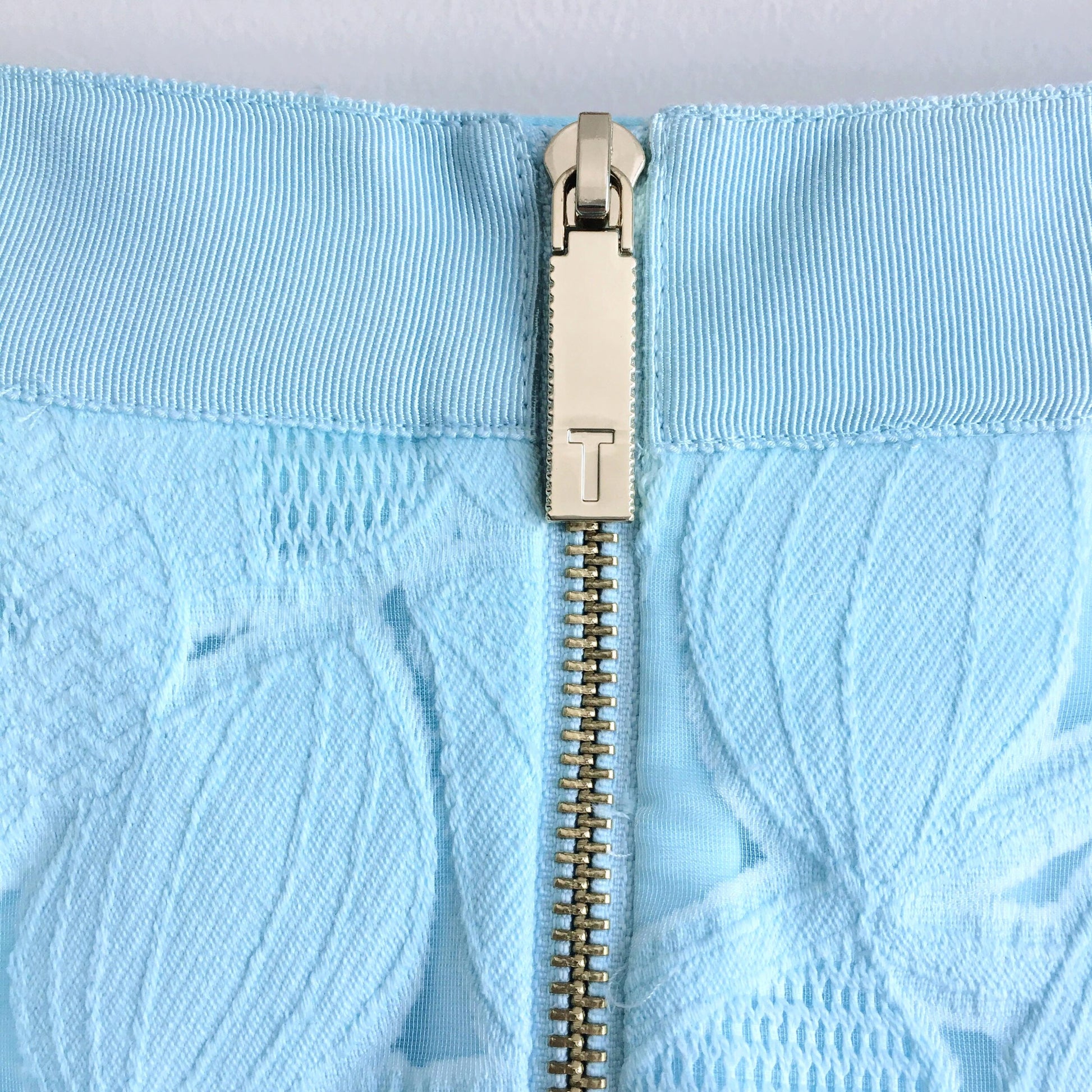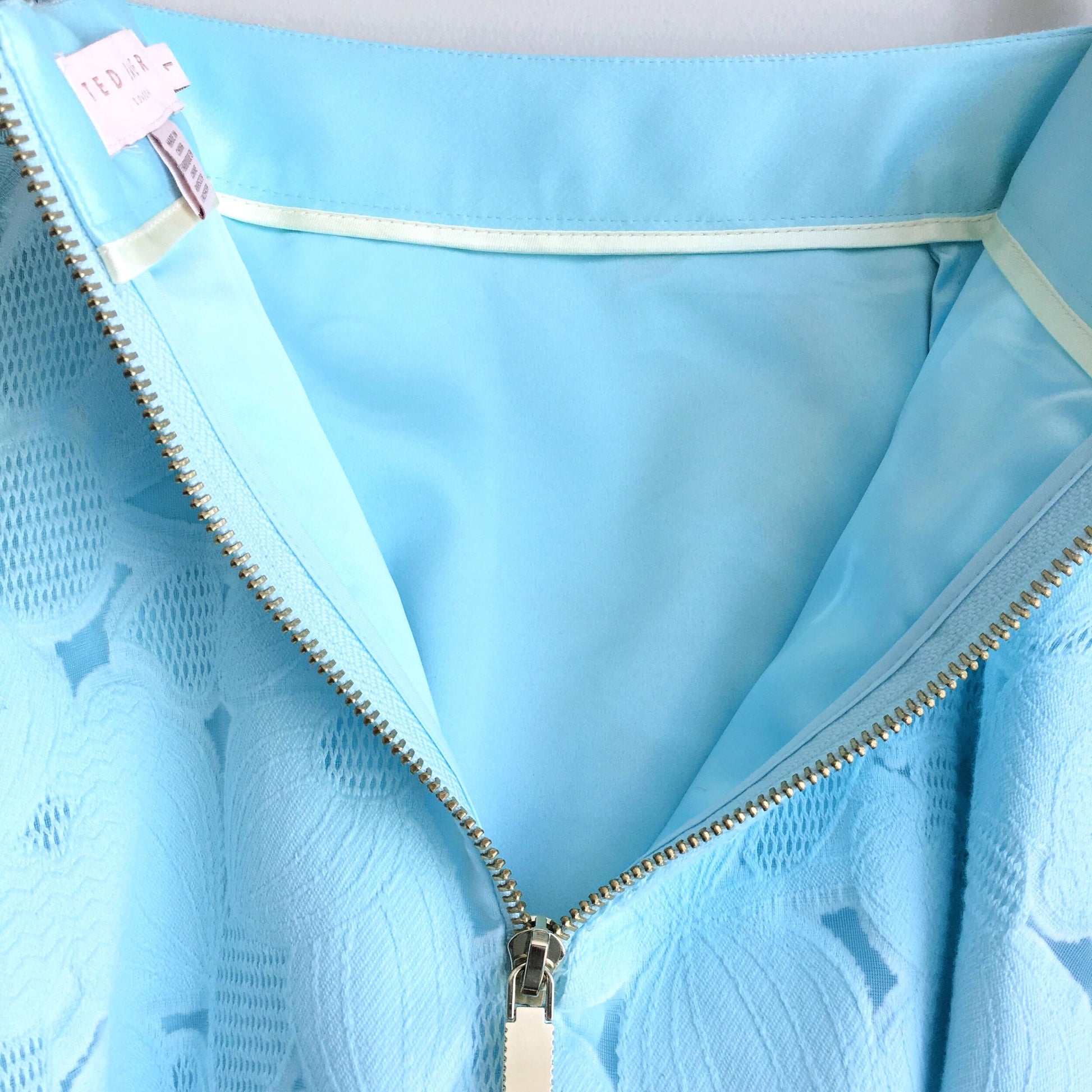Item Description: The prettiest little skirt, this aqua floral lace midi skirt from Ted Baker features a ribbon waist, gold zipper closure and side pockets. Lined. Shell: 81% cotton 19% polyamide Lining: 97% polyester 3% elastane