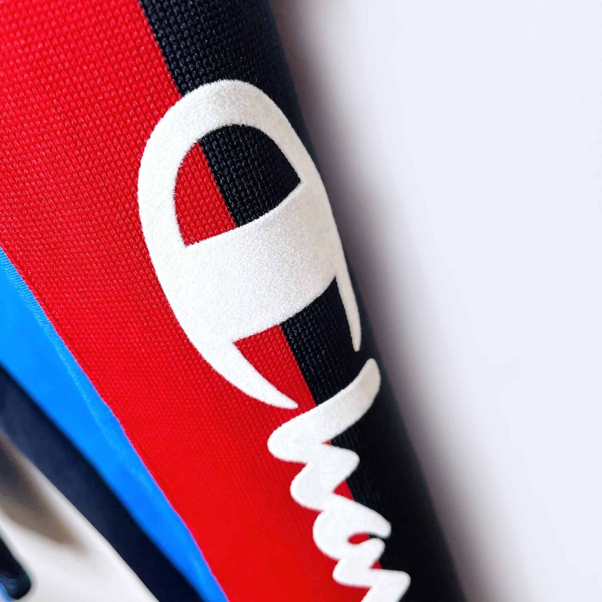 Item Description: These iconic Tricot Track Pants from Champion are transformed into a street-ready classic in a striking blue with red stripe, drawstring waistband and zipper cuff. 100% polyester