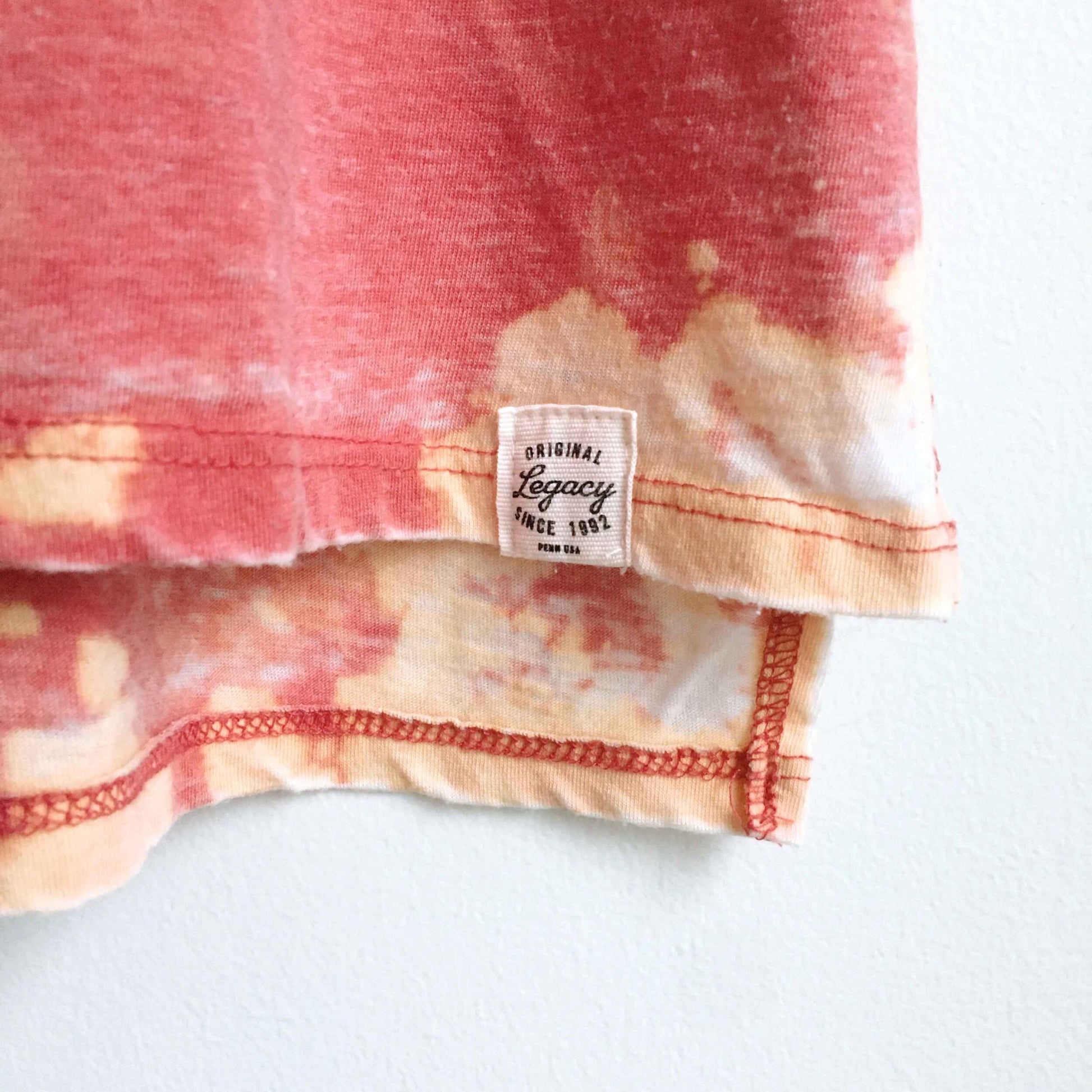 Item Description: This vintage washed red v-neck from Legacy got a fun upgrade with a custom bleach tie-dye effect. Set on a burnout fabric, this tee has all the worn-in summer vibes. 50% cotton 50% polyester