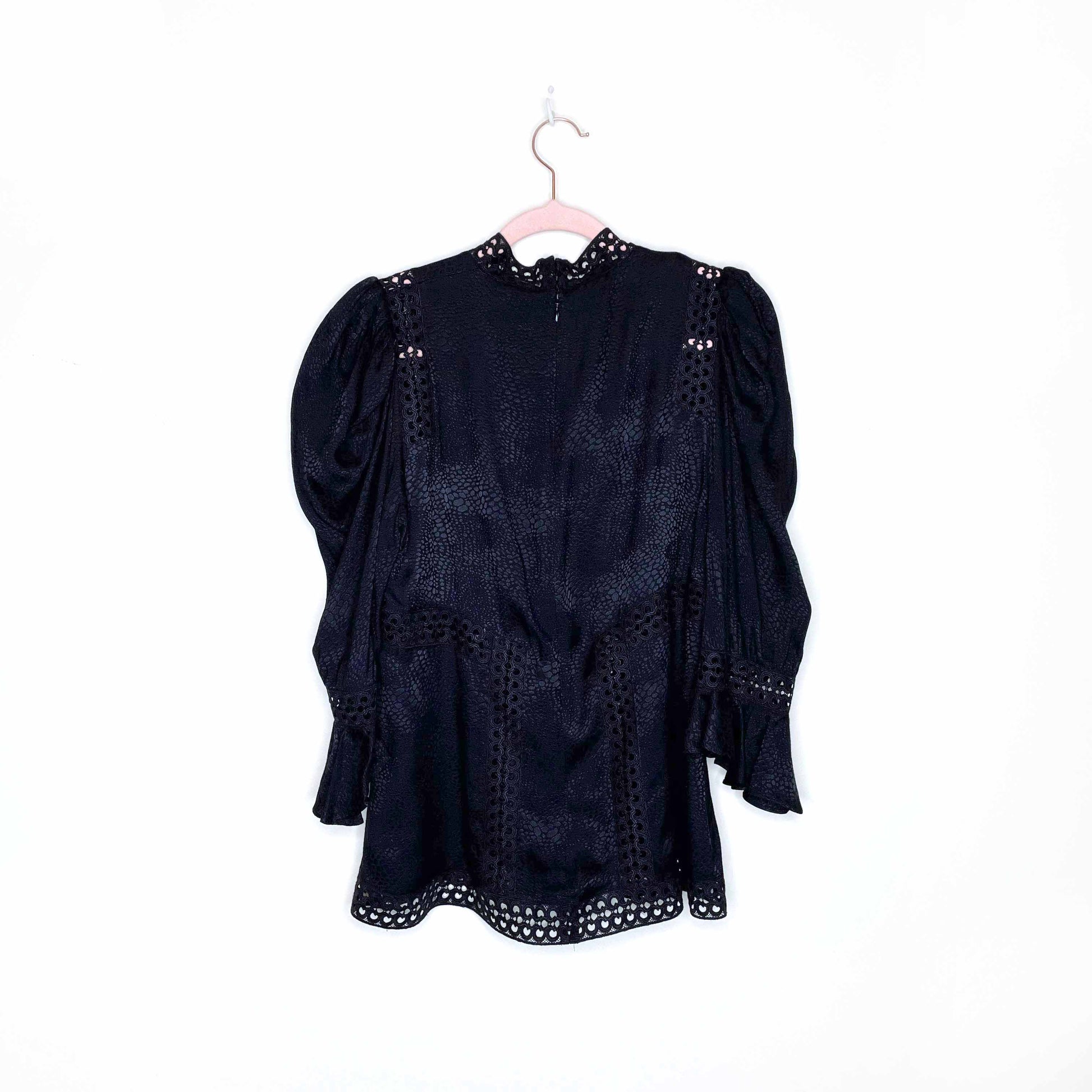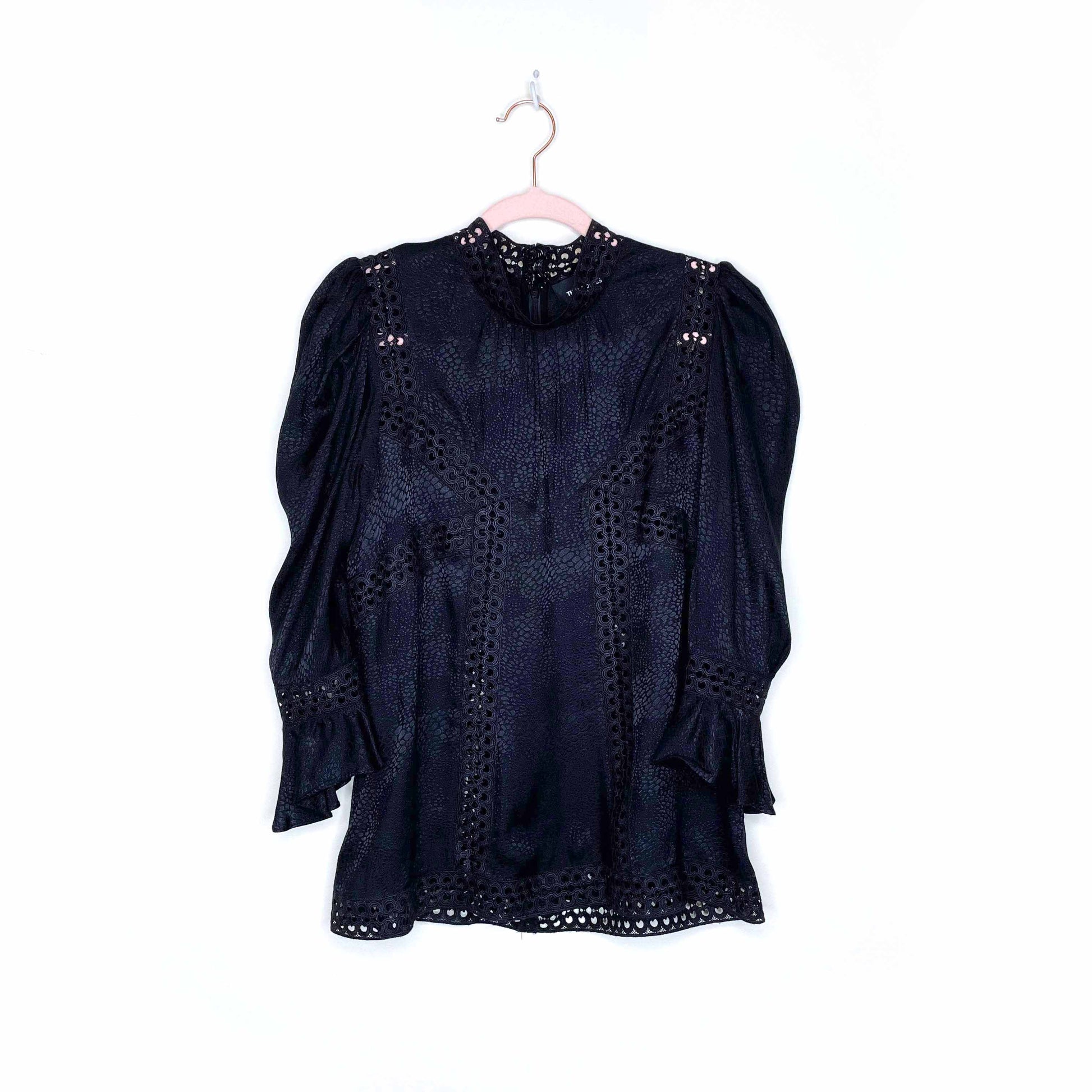 Item Description: This ultra-chic blouse from the Kooples Paris features a subtle animal print satin sheen with lace inlays throughout, finished with puff shoulders and a ruffle cuff. Tres mignon! No content tag.