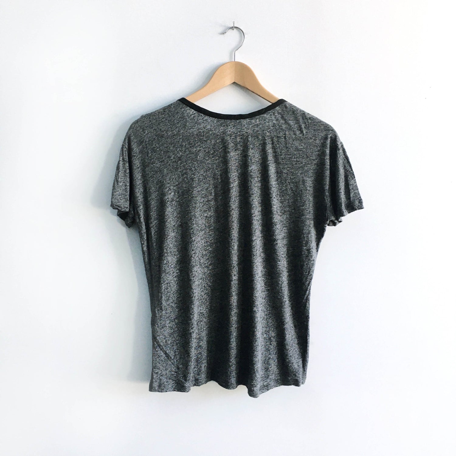 Item Description: A marled grey heather linen blend is paired with faux leather trim and a feature pocket. 57% linen 43% modal