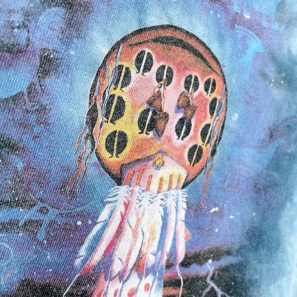 Item Description: This self-cropped tee from the Mountain features beautiful artwork by the talented Sally J Smith with a dream catcher design on a blue tie dye canvas. 100% cotton