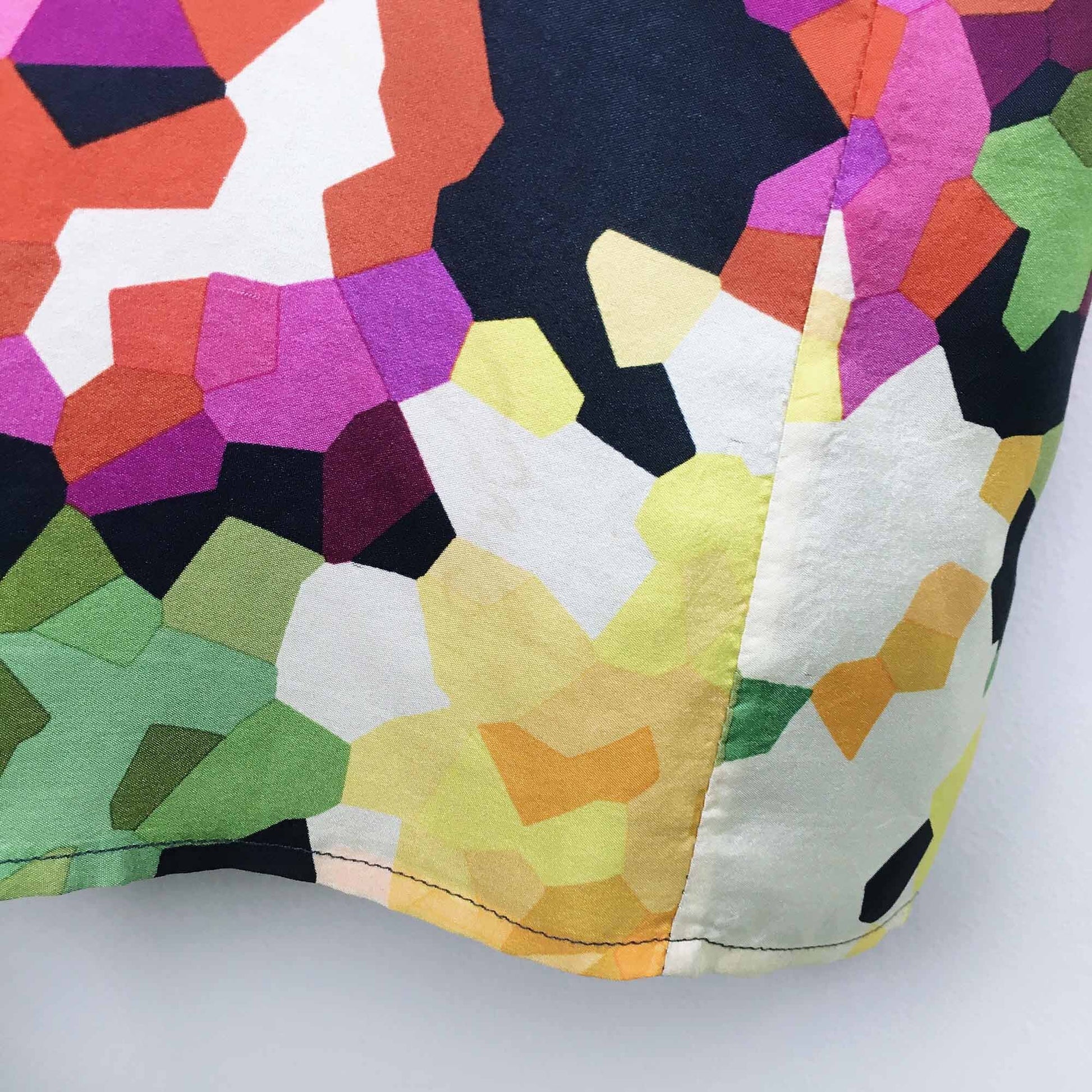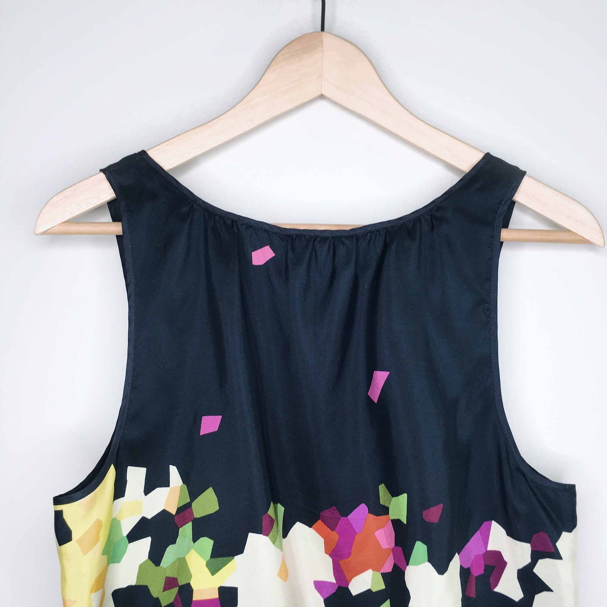Item Description: This summery garden tank from Theory features geometric flowers set on a navy blue landscape. Lined. 100% silk