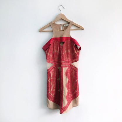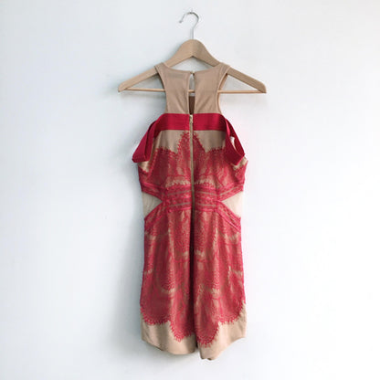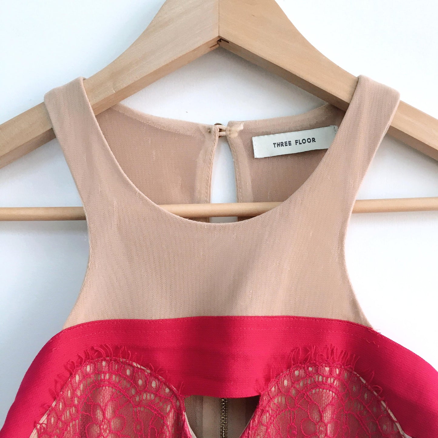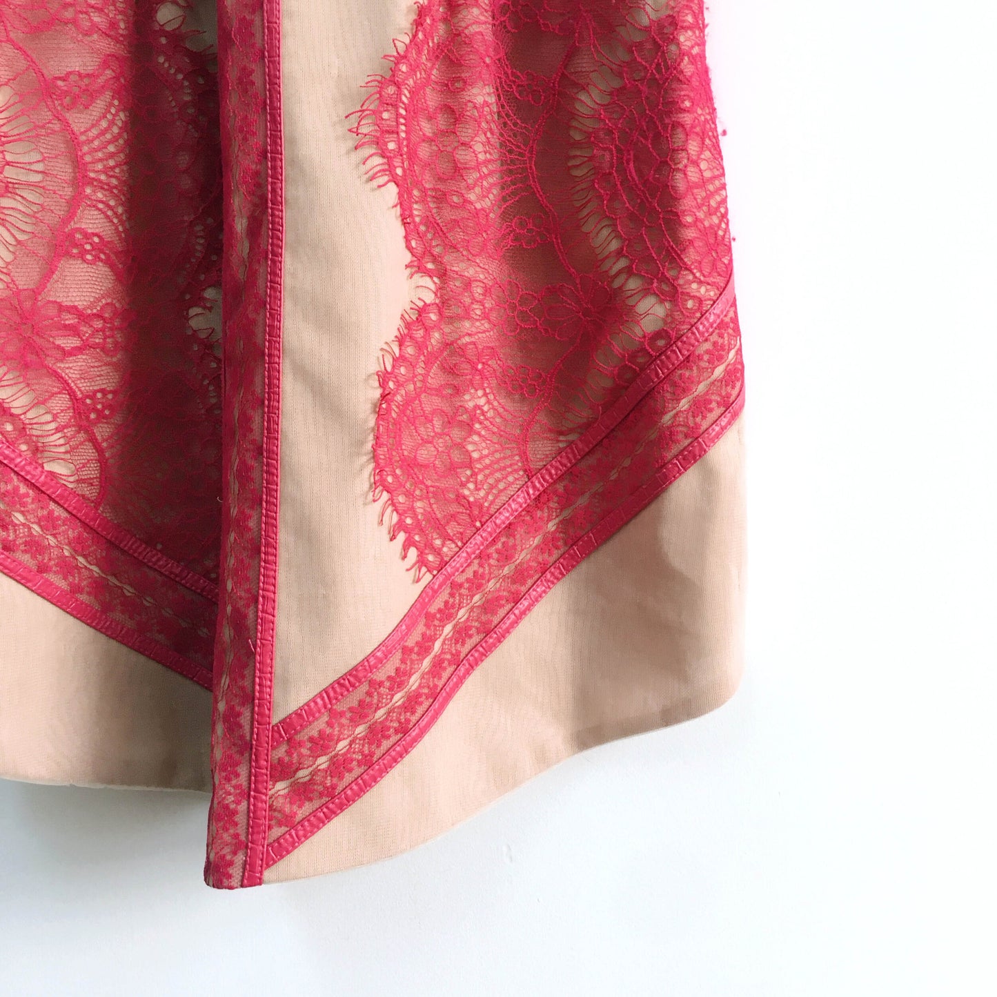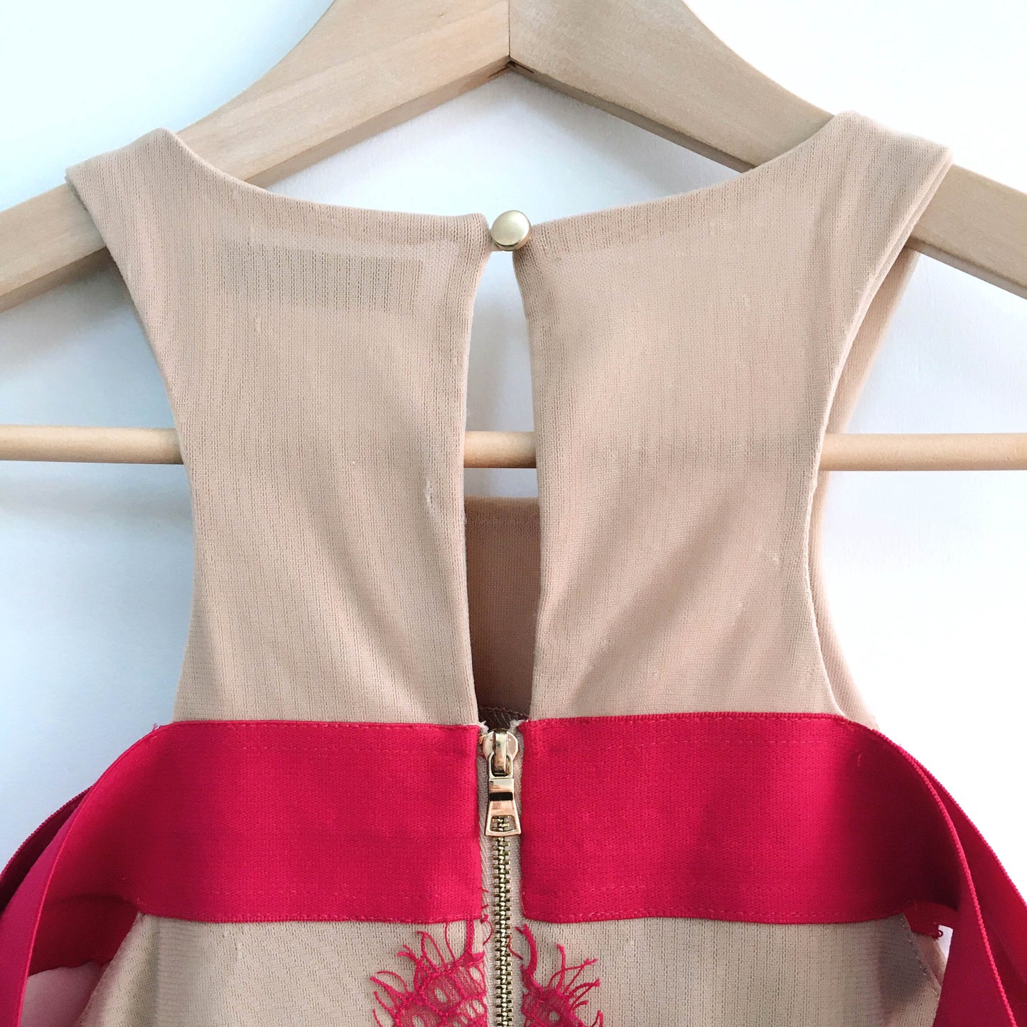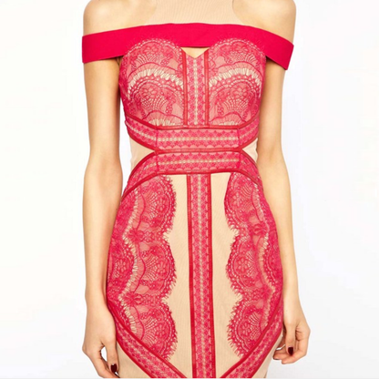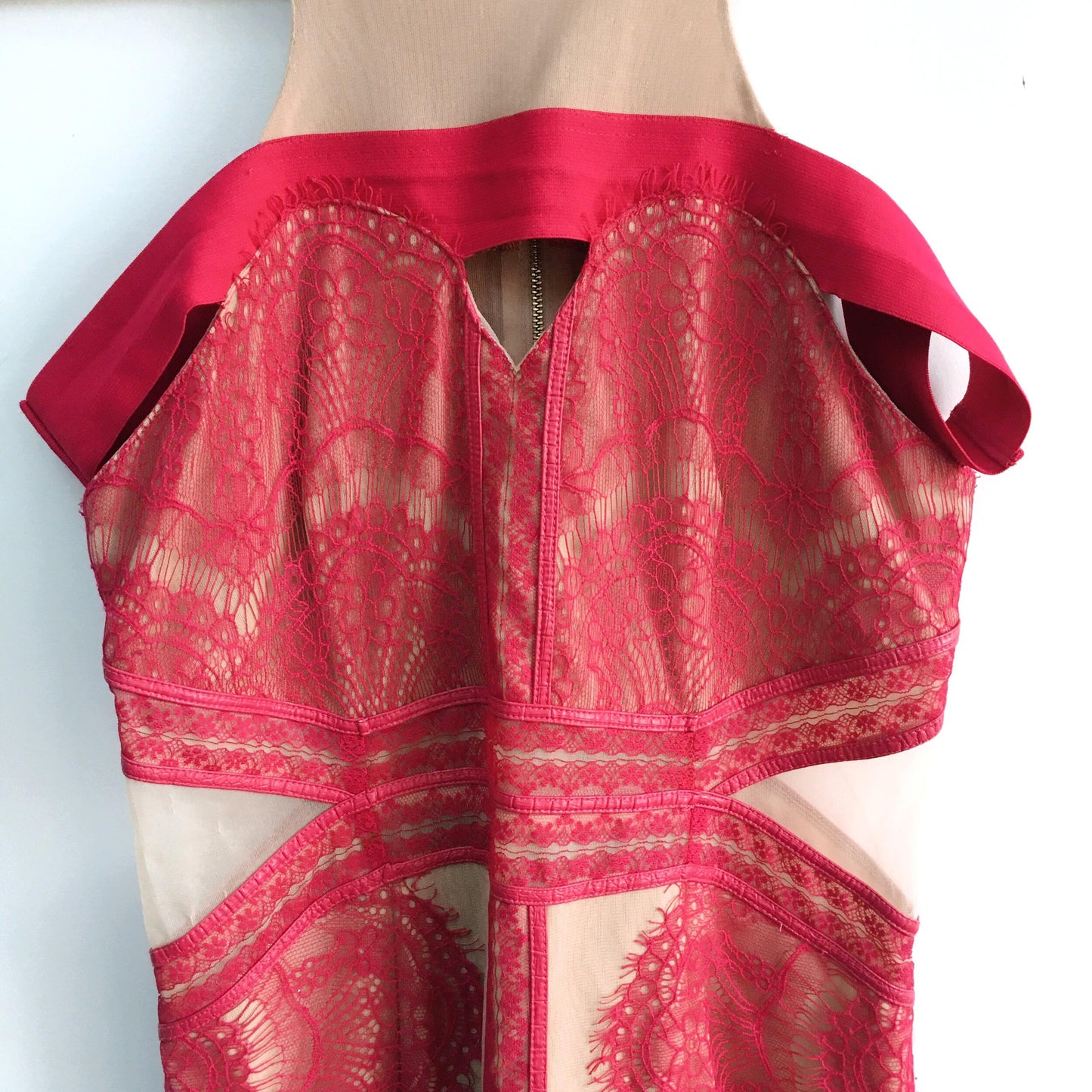 Item Description: Okay, we can stop playing around now because this dress is a show-stopper! Nude bodice and pink lace compliments an off shoulder neckline. Back zipper. 100% polyamide backing: 100% viscose
