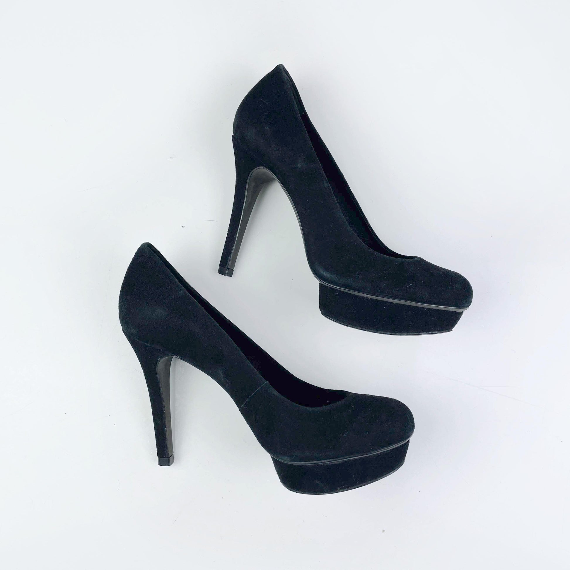 Item description: This classic stiletto pump from Tory Burch comes in a soft black suede, with platform front (helps alleviate pressure from the road when walking!) and rounded toe. 100% leather upper