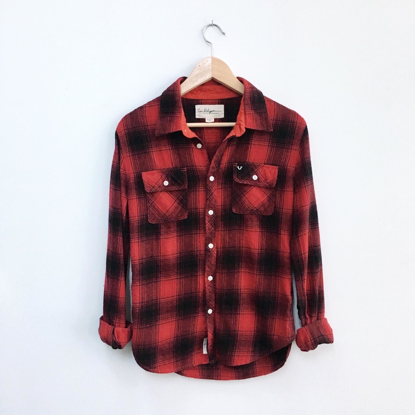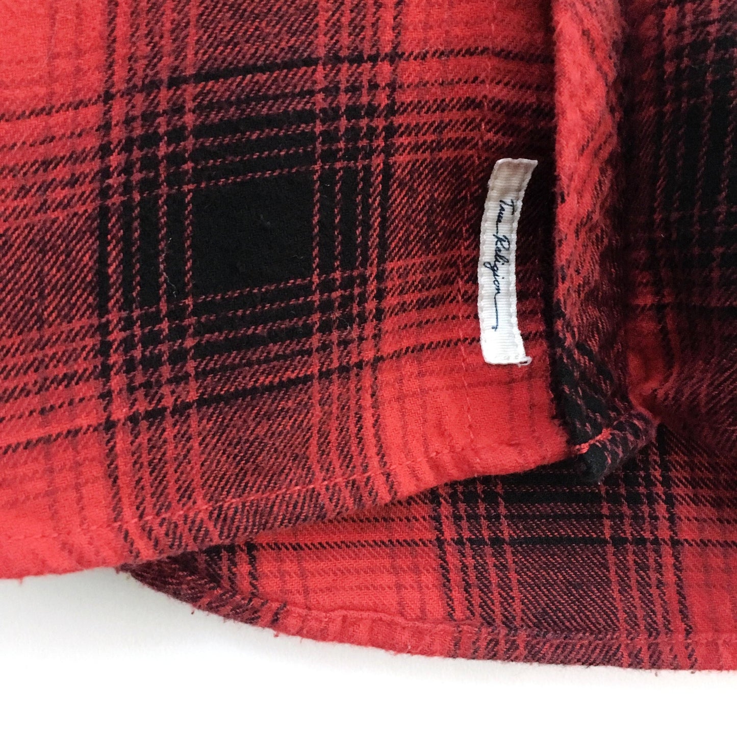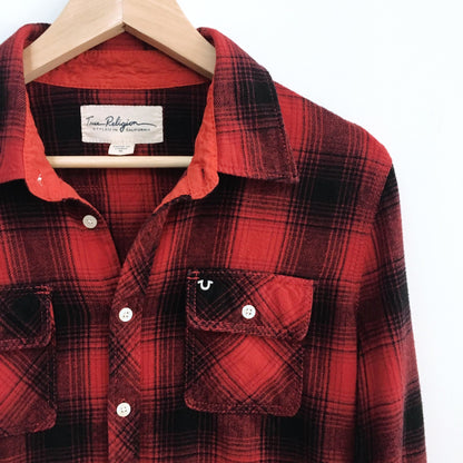 Item Description: Classic red flannel from True Religion featuring their signature horseshoe stitched pocket, and details like the binding on the inside collar. 100% cotton