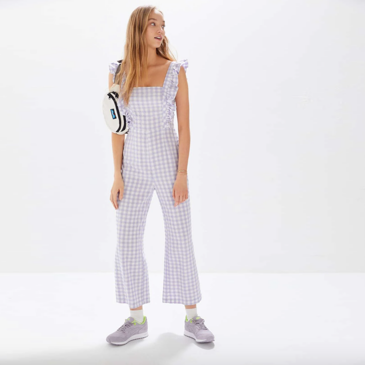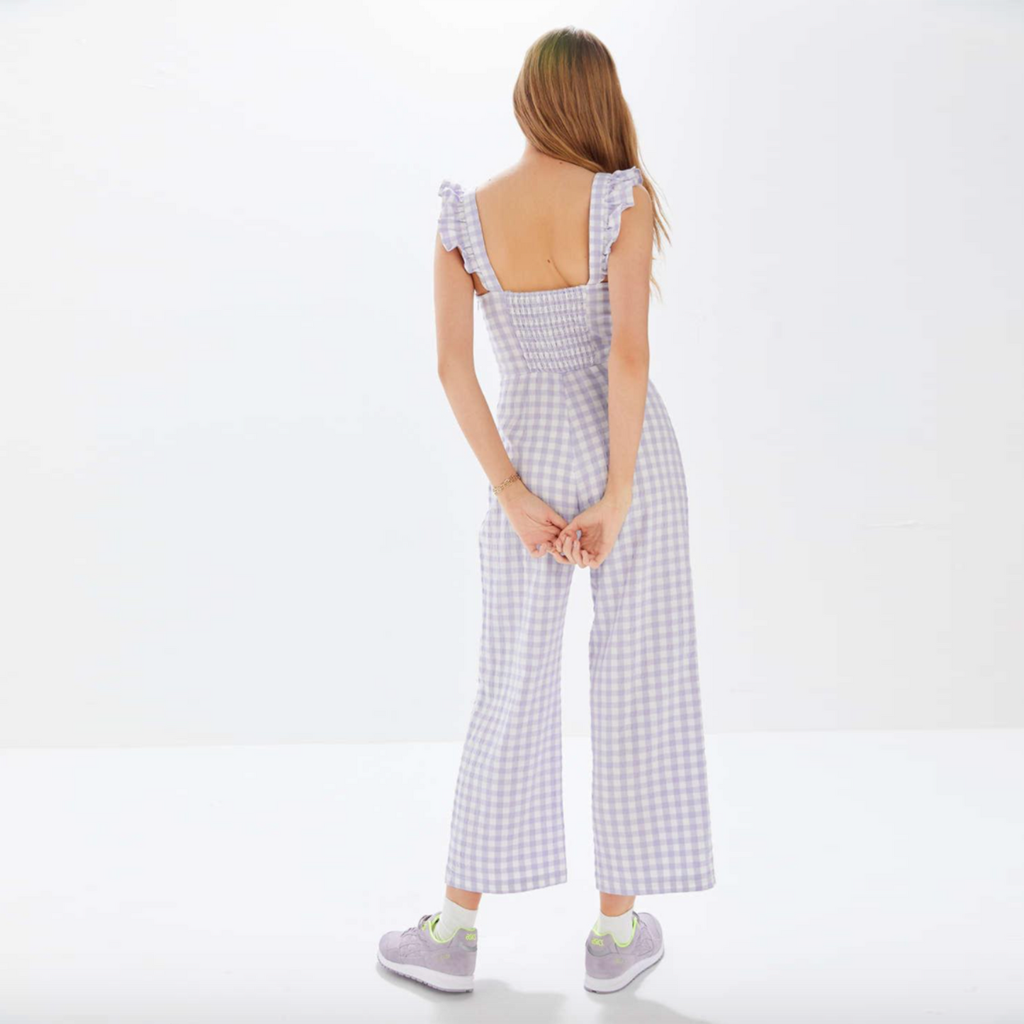 Item Description: It doesn’t get any sweeter than this prairie-inspired jumpsuit from UO. Made from a lovely lilac gingham-print fabric that’s fitted through the square-neck bodice and relaxed through the wide leg. Trimmed with ruffle accents at the thick shoulder straps that lead to a smocked, square back. Zipper closure at the side. 74% Viscose, 26% polyester
