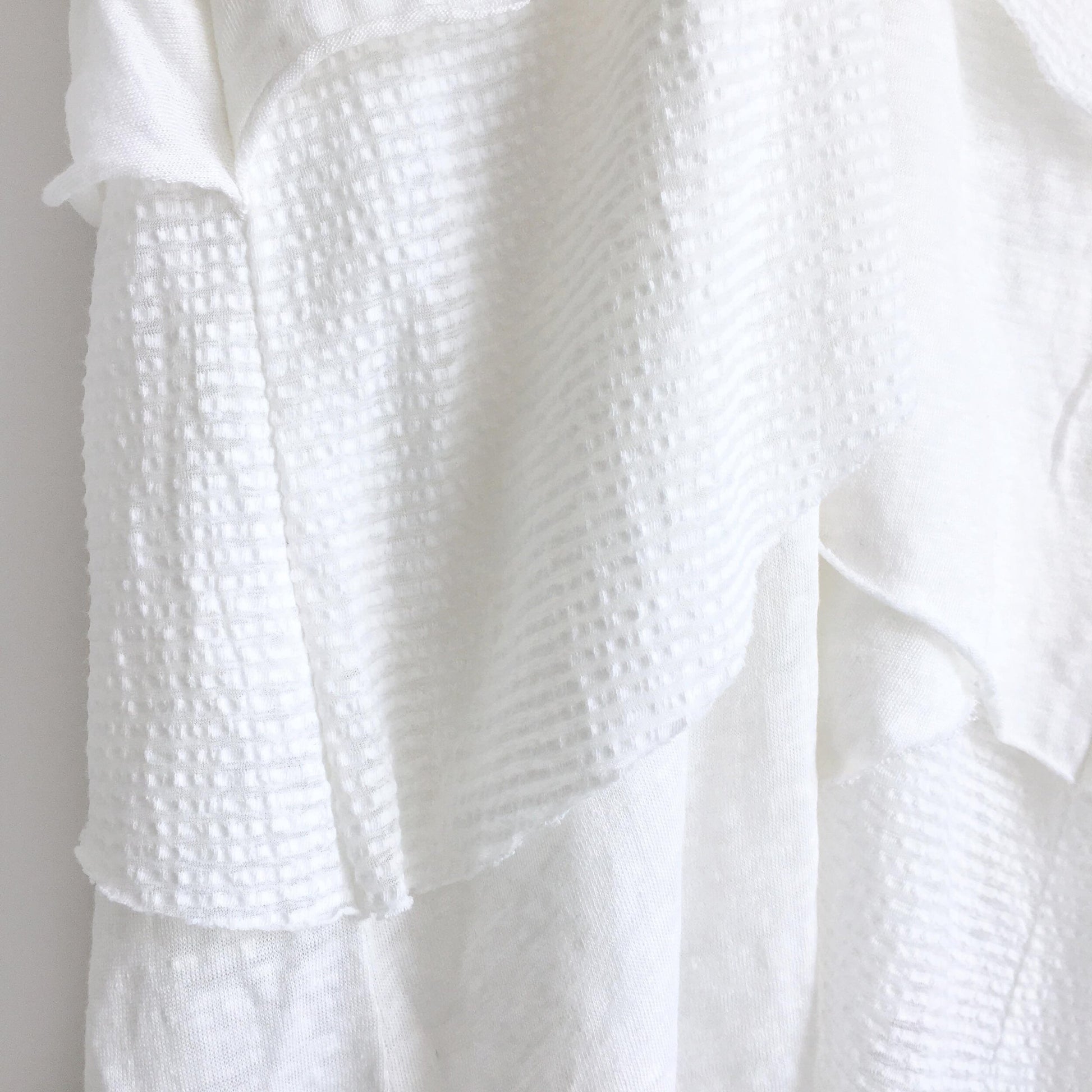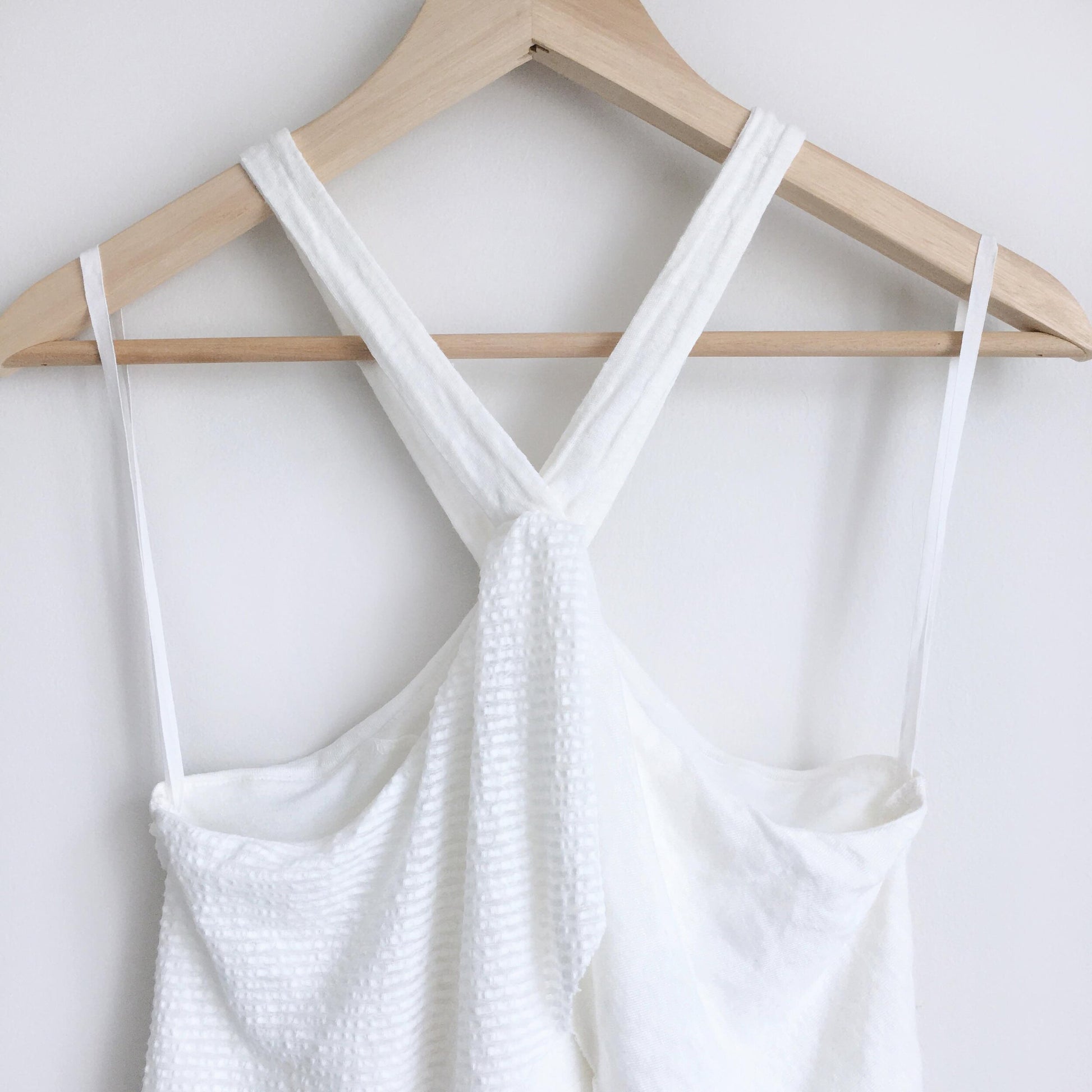 Item Description: This layered summer tank from Anthropologie features a blend of linen and poly/cotton modal layers, with a halter neckline and asymmetrical hem.