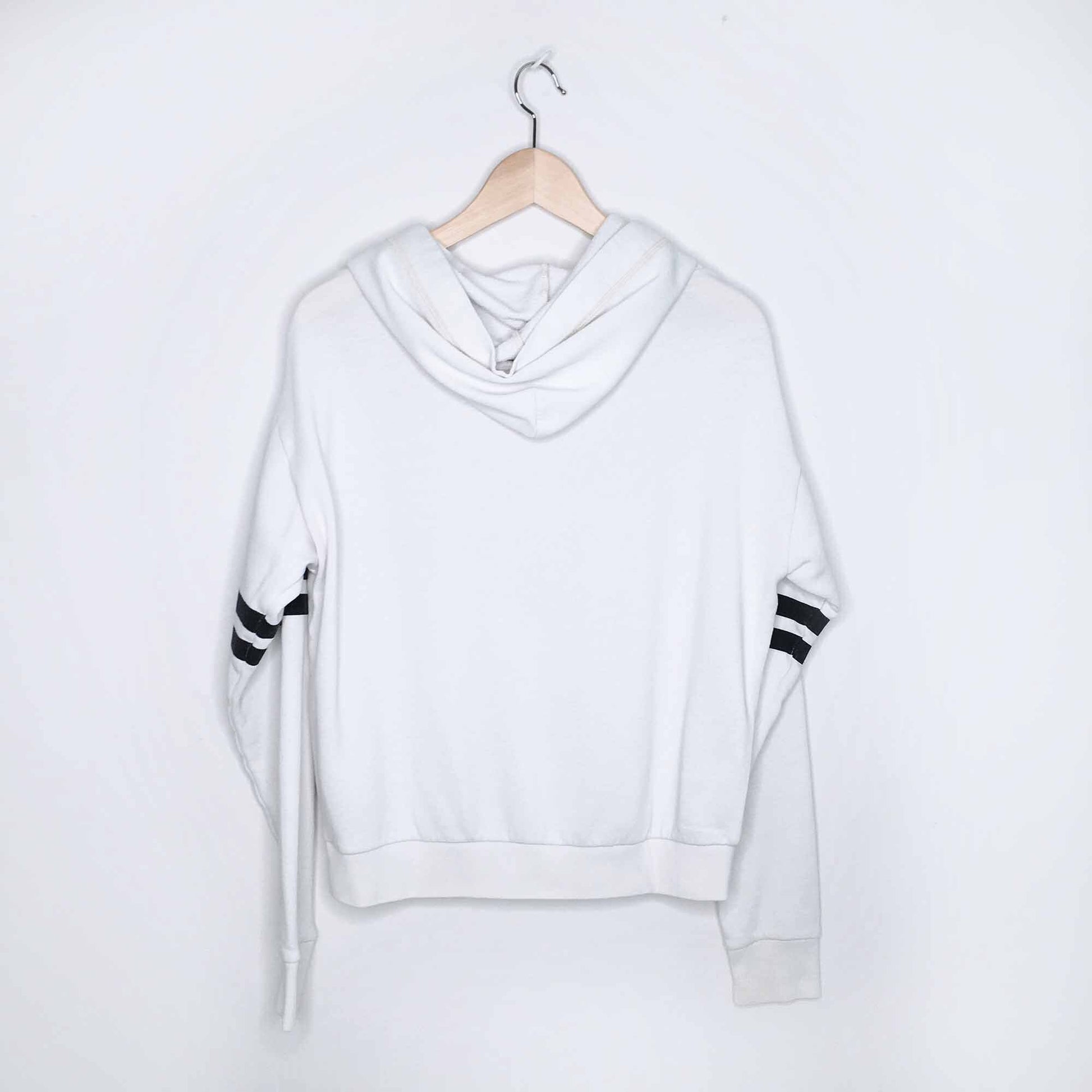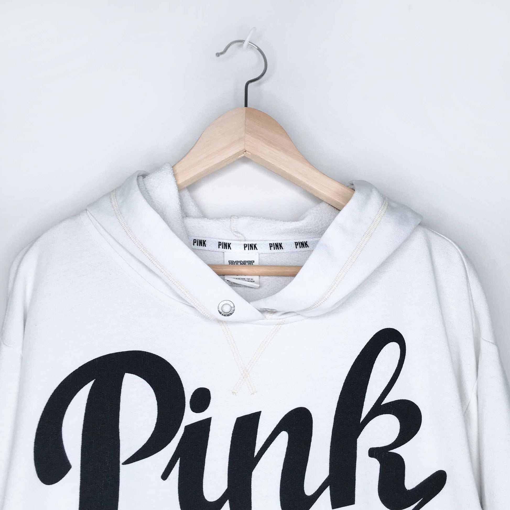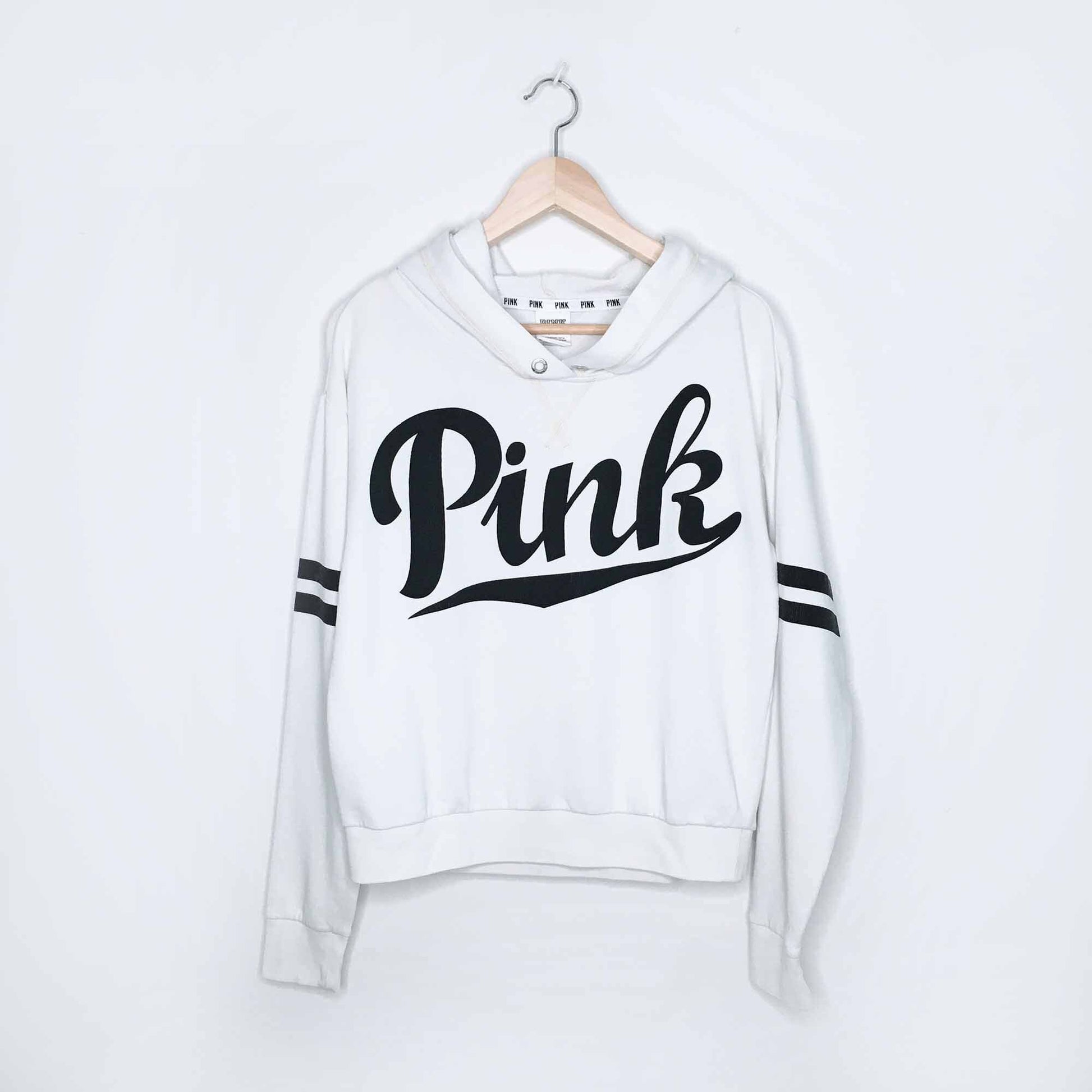 Item Description: This varsity inspired hoodie features stripes on the arms and a baseball script PINK across the front. 60% cotton 40% polyester