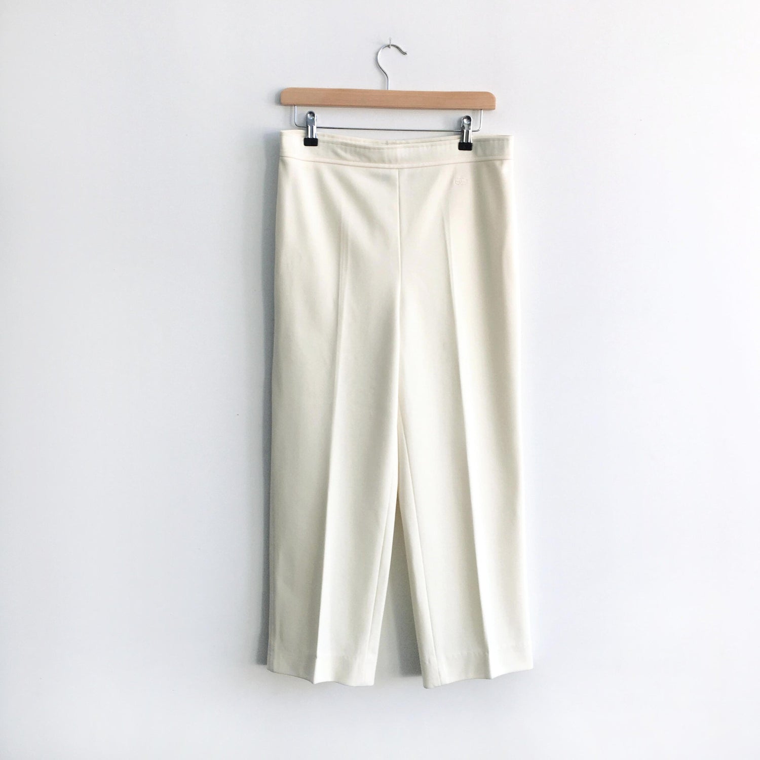 Item Description: Classic trousers from the age of groovy, these off-white, high waisted trouser features the signature GG embroidered logo on hip. 100% dacron polyester