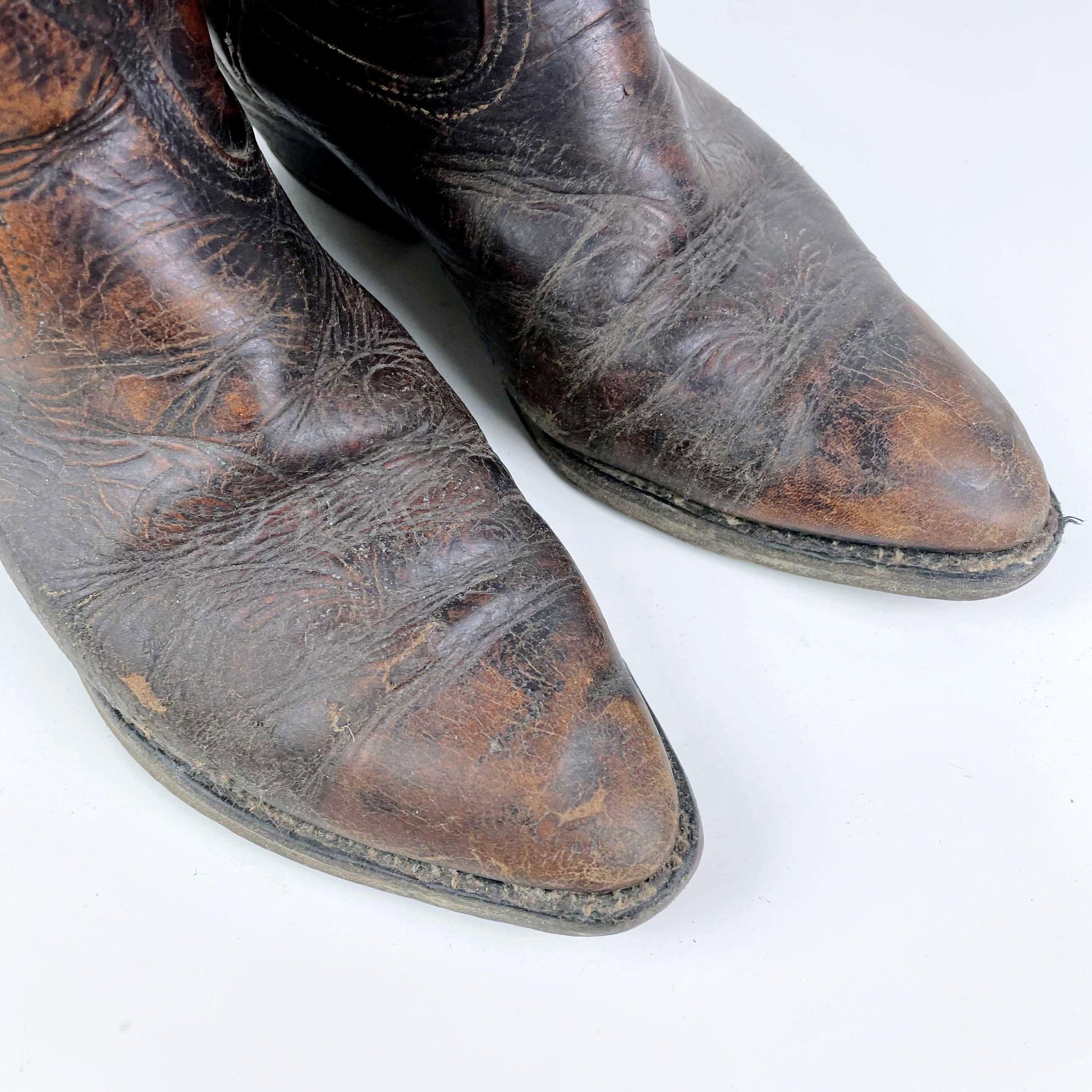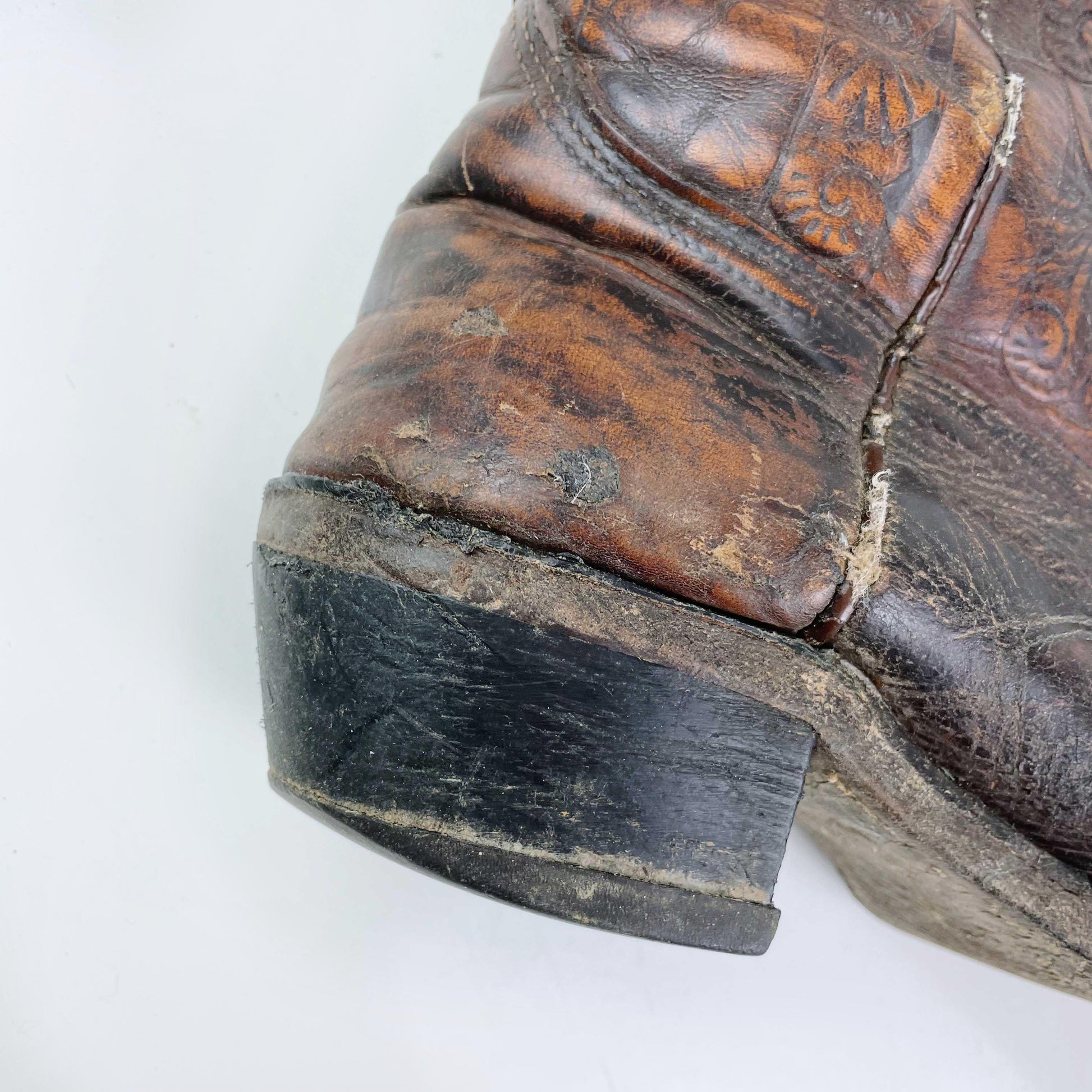 Item description: ACME boots are highly sought after in the western world, and this beautiful vintage pair has beautiful tooling work in a rich cognac brown. 100% leather