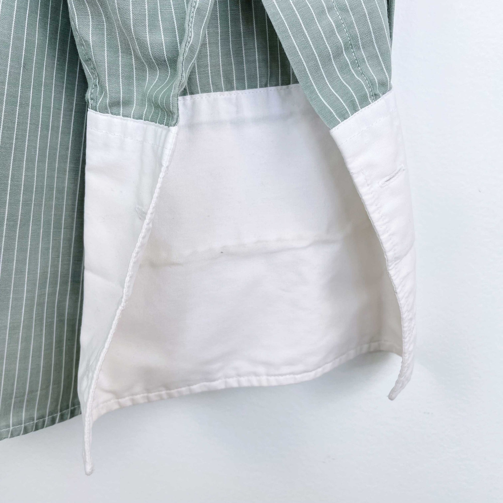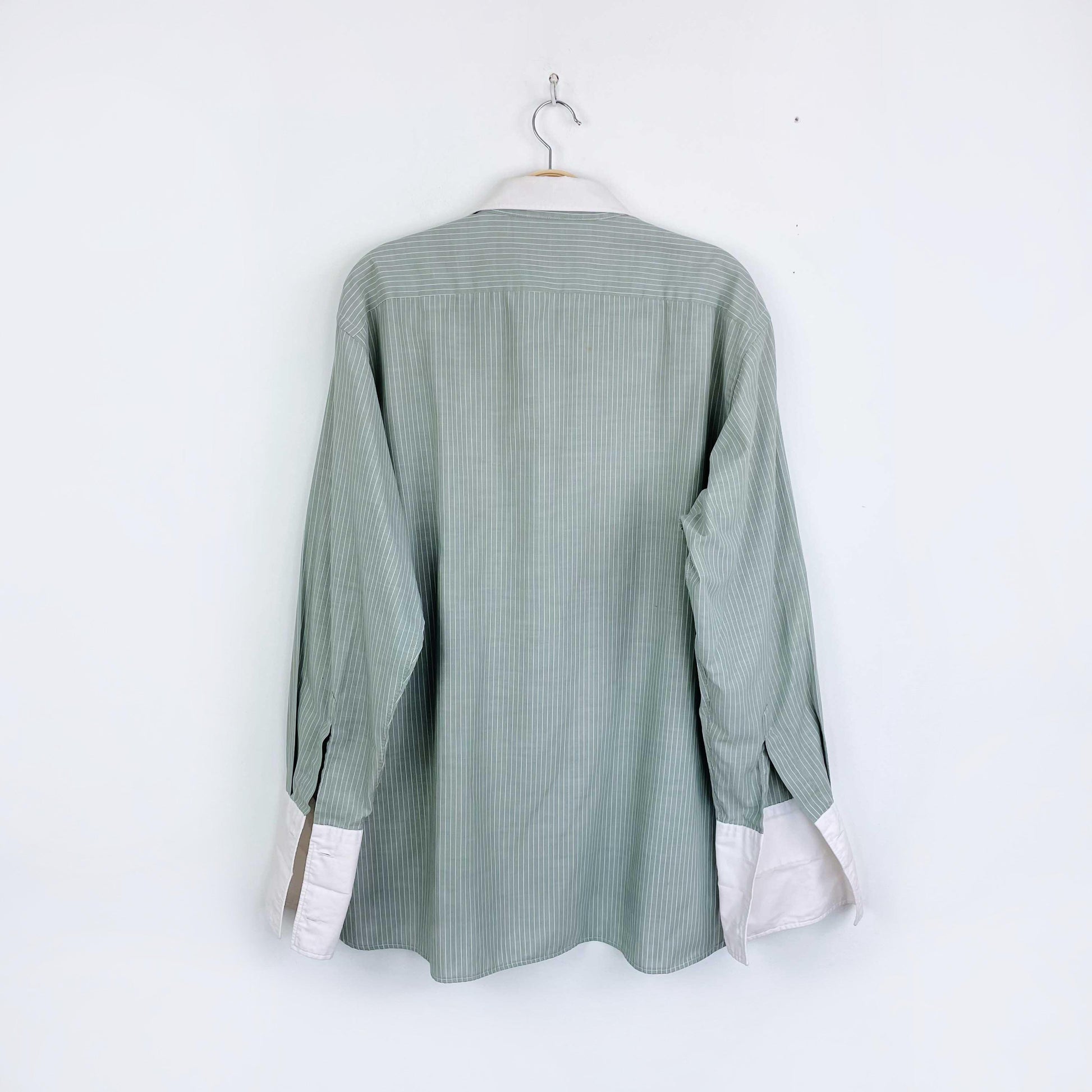 Item description: This french-cuffed shirt from Christian Dior is ultra chic. A menswear design, this gender free button down is set in a neutral sage with pin stripe detail, embroidered DIOR logo pocket and contrast collar and french cuffs. Just add cuff links. 55% cotton 45% polyester
